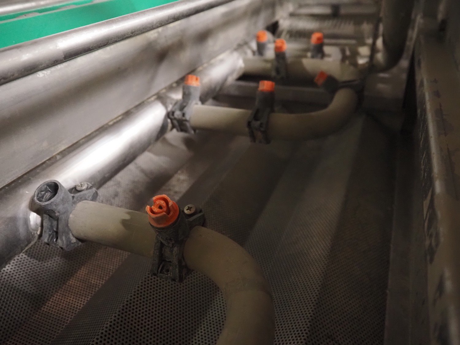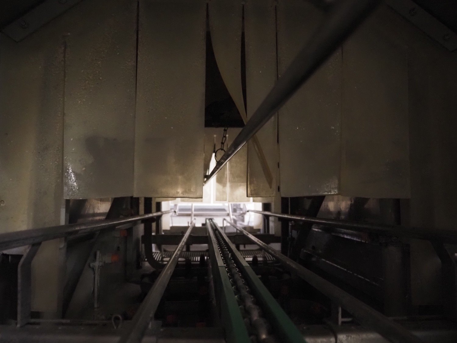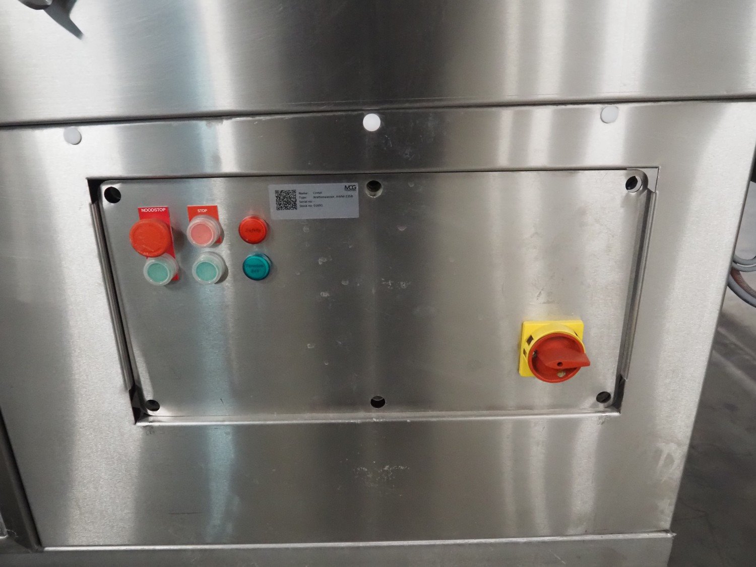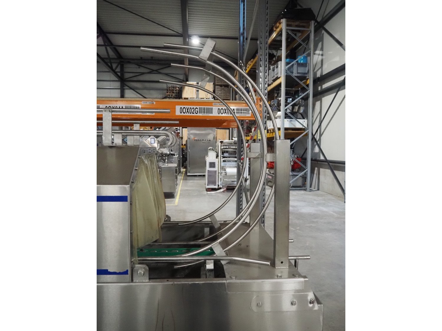 Cretel crate washing machine, s/s chain conveyor with dividers, belt width: 450 mm, distance between dividers: 760 mm, divider height: 15 mm, total dimensions: 3650 mm x 1000 mm x 1720 mm. Including blower.