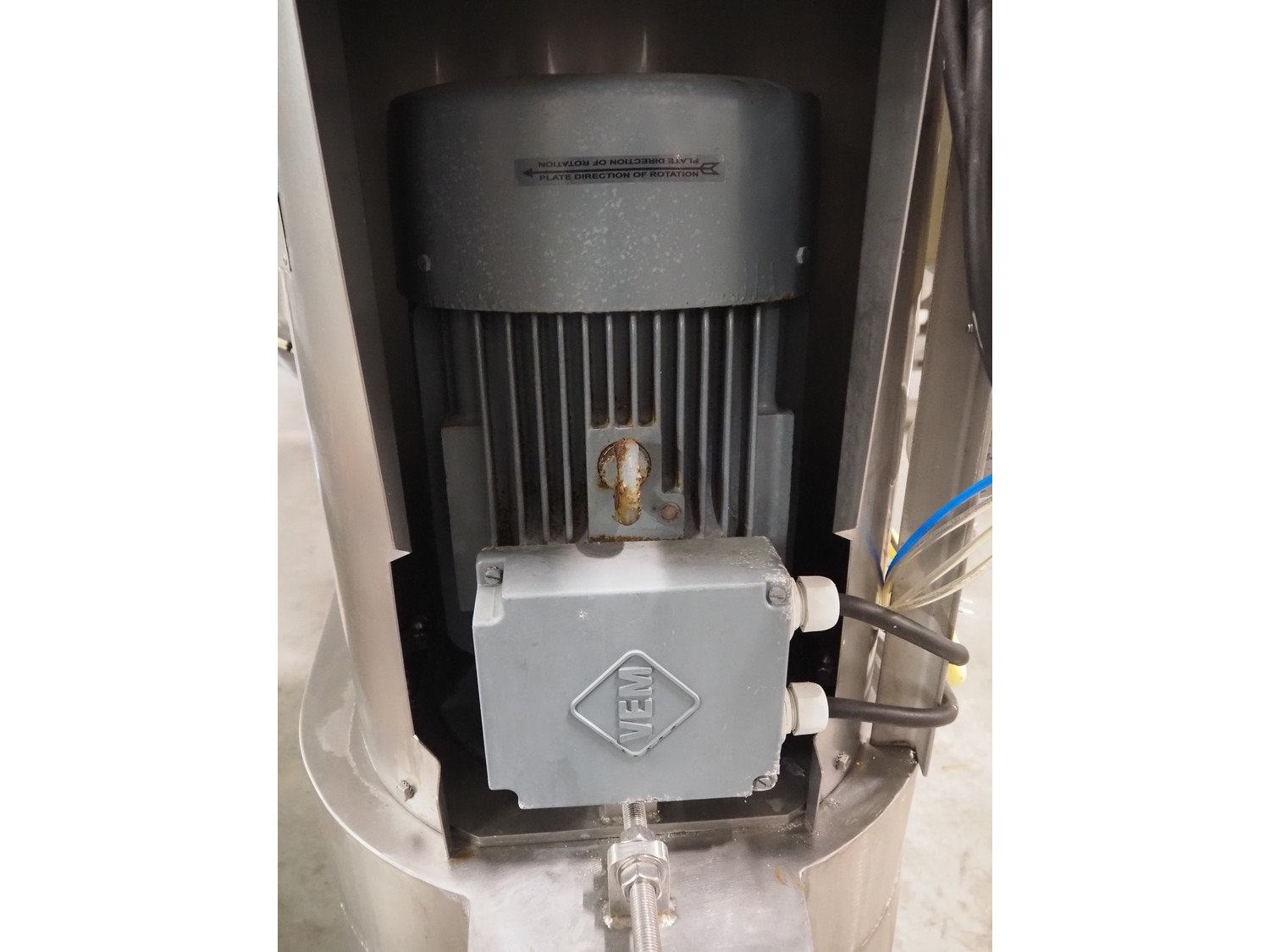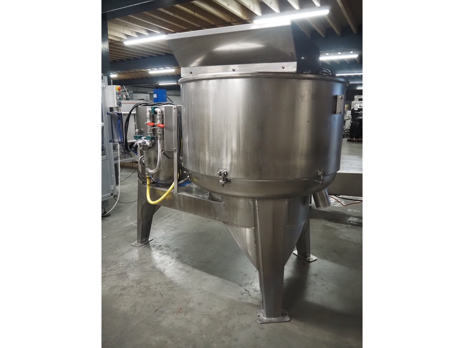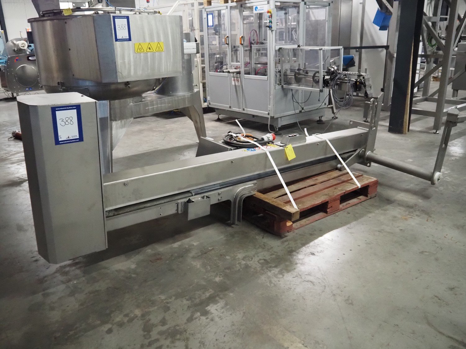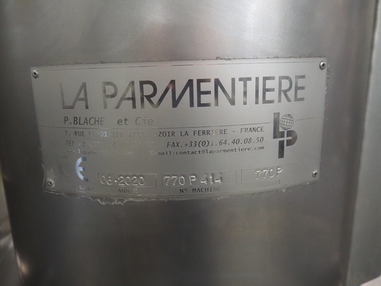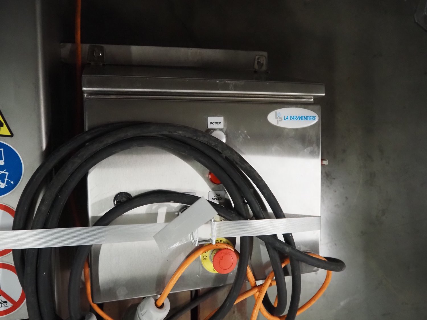 La Parmentiere dehairing machine with Carsoe lifter for meat bins, type: 770P, machine number: 770P414, year of construction: 06.2020, type lifter: HKV 300, serial number: FOD-10811, year of construction: 2020, 400 V, 3 Ph, 0.75 kW, dimensions: 2050 mm x 1800 mm x 1870 mm, dimensions lifter: 3150 mm x 1500 mm x 900 mm.