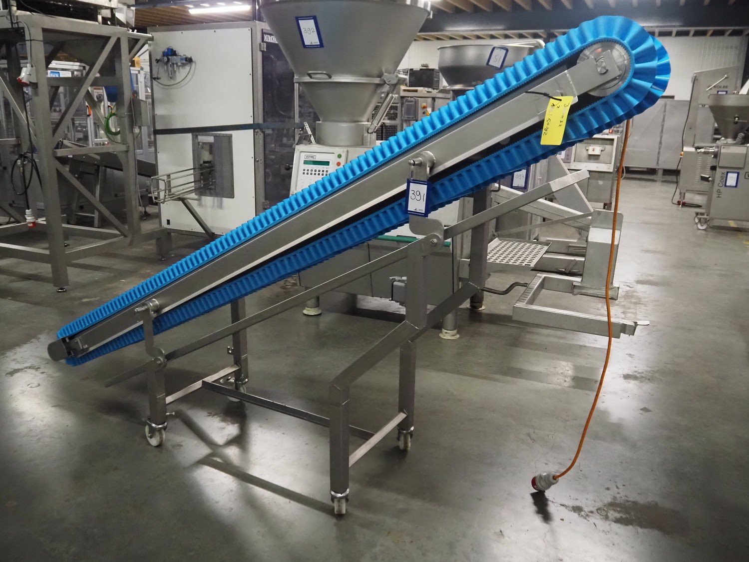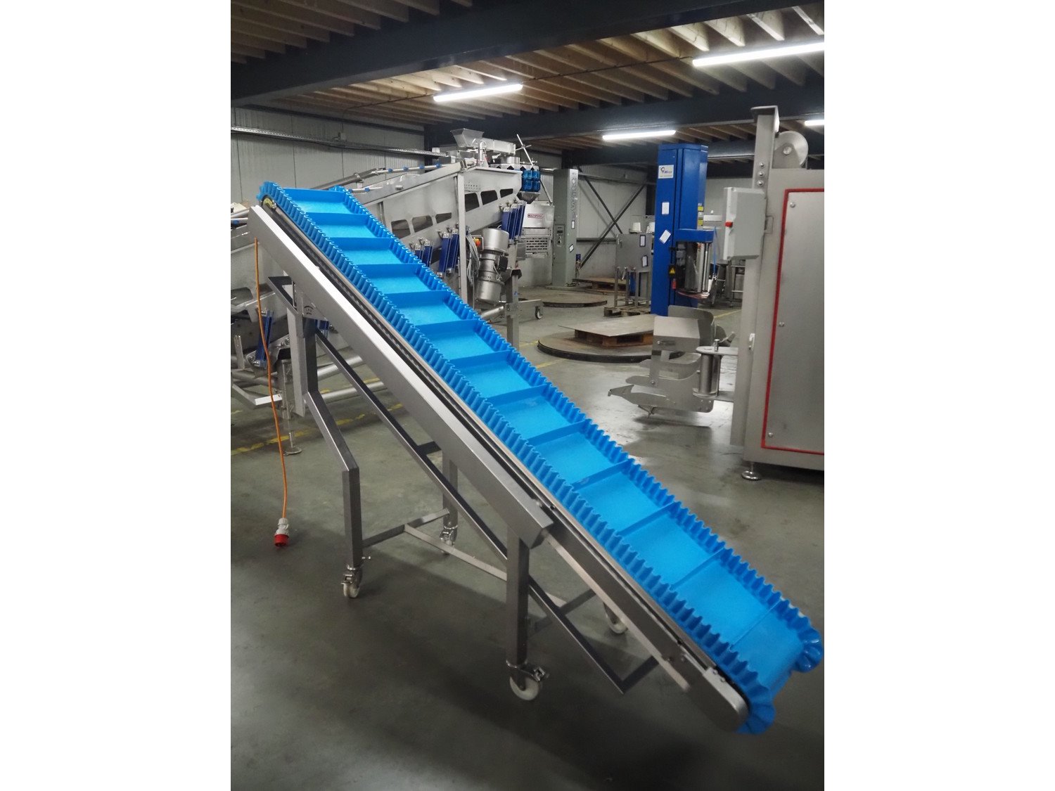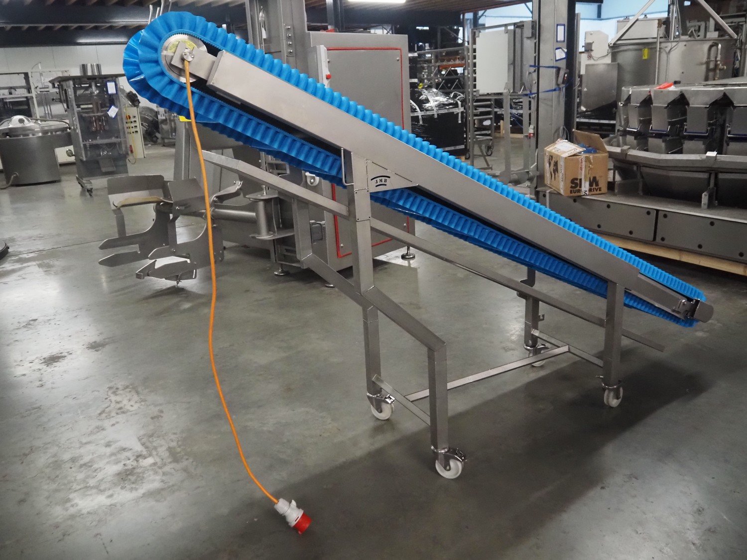 JMB mobile elevating belt, s/s frame, plastic belt with dividers, belt width: 375 mm, distance between dividers: 200 mm, divider height: 45 mm, elevating height: 1600 mm, total dimensions: 2500 mm x 560 mm x 1640 mm.