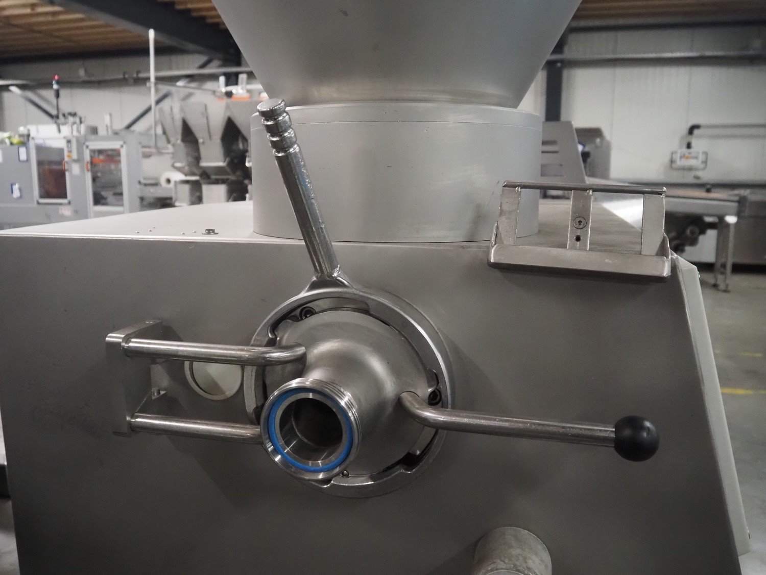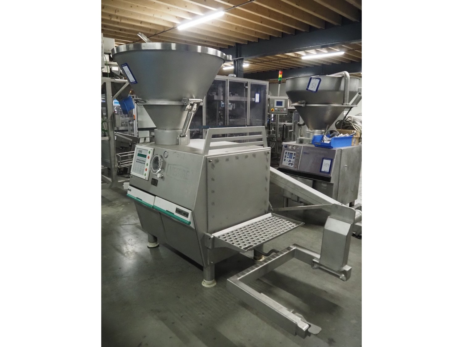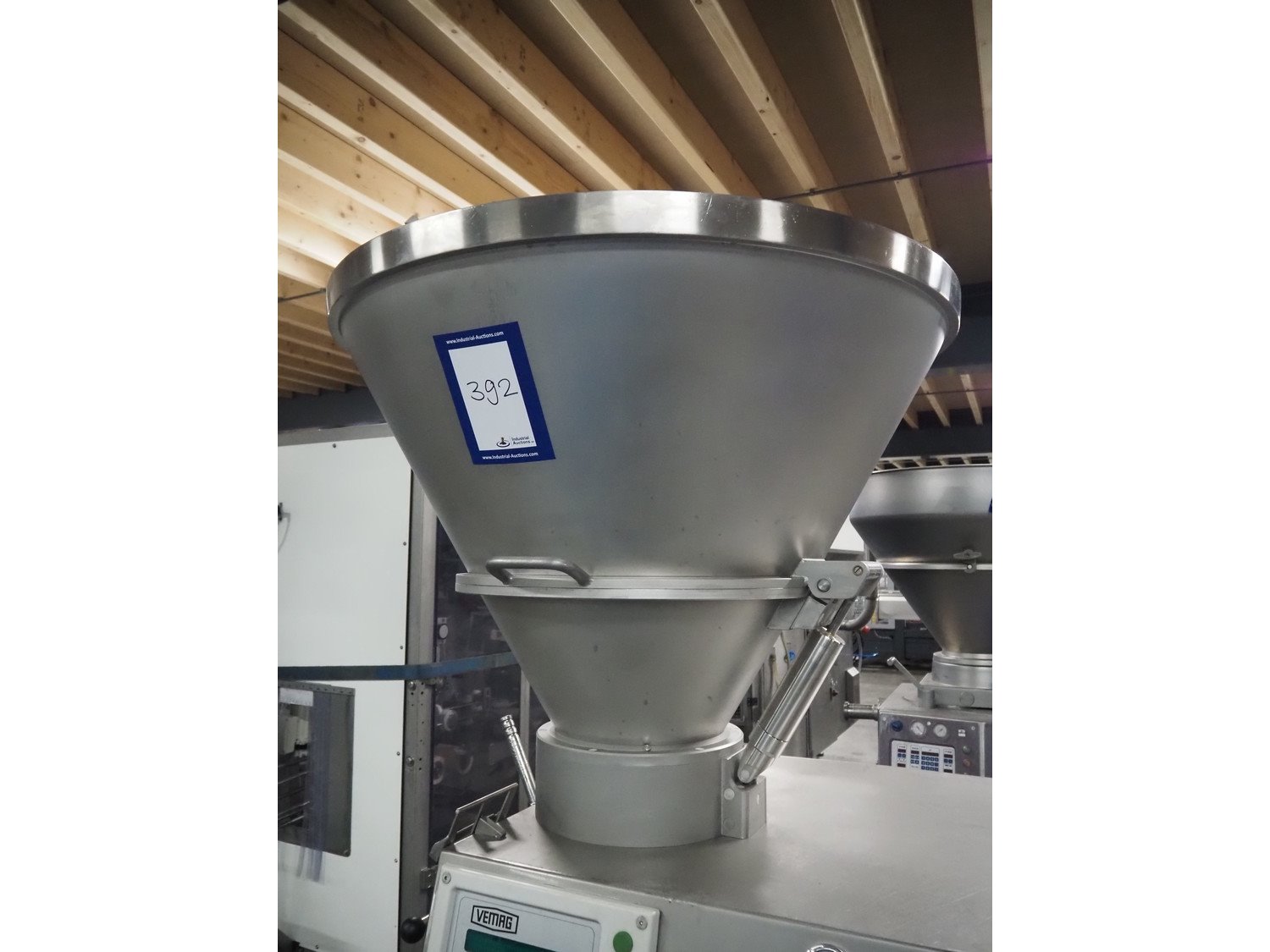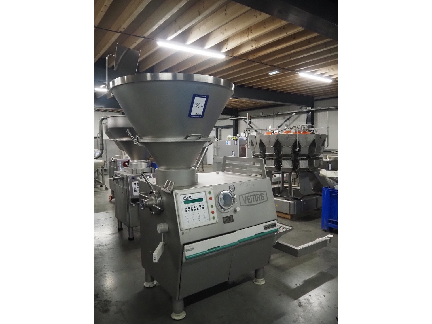 Vemag vacuum filling machine with lifter for 200 liter meat bins, model: ROBOT HP10, type: 140/350 B-1, number: 140 0444, year of construction: 1995, 220-460 V, 3 Ph, 50/60 Hz, 21/63 A, with Rietschle vacuum pump, type: VCE 25, number: 1569062, dimensions: 2100 mm x 1200 mm x 2350 mm.