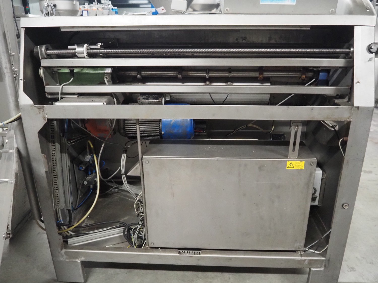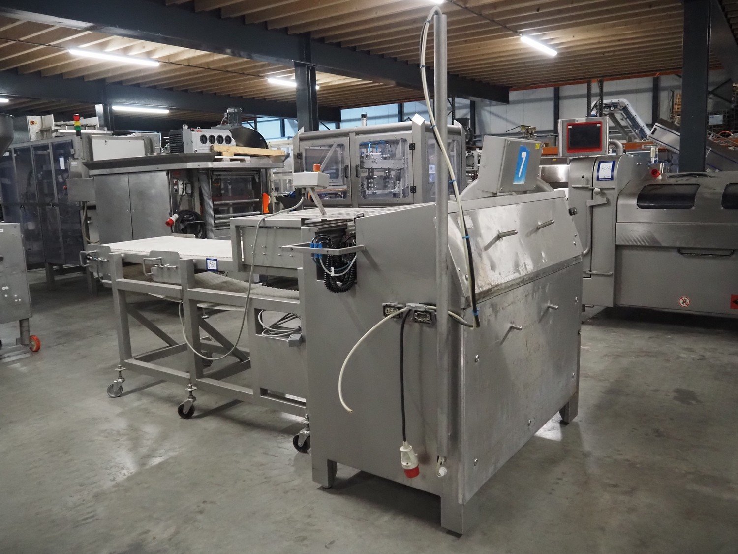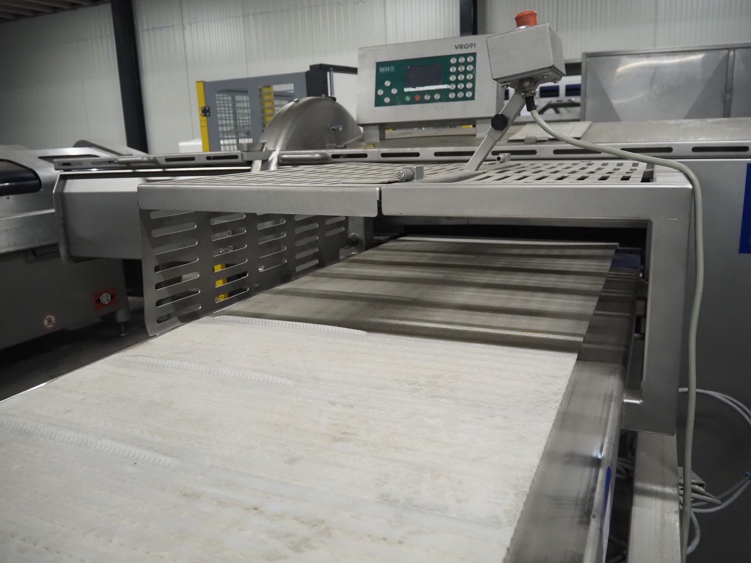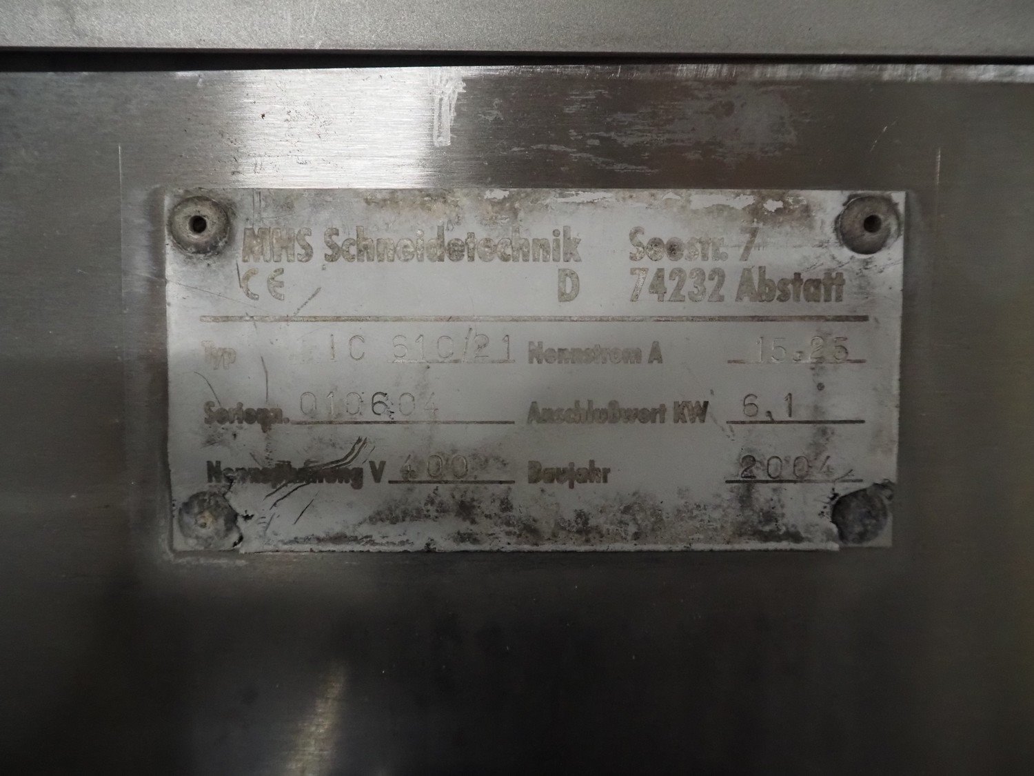 MHS Schneidetechnik GmbH slicer with infeed belt, type: IC610/21, serial number: 010604, year of construction: 2004, 400 V, 15.25 A, 6.1 kW, plastic belt, belt width: 610 mm, dimensions chamber: 210 mm x 210 mm, total dimensions: 2400 mm x 800 mm x 1500 mm, dimensions infeed belt: 2700 mm x 860 mm x 1500 mm.
