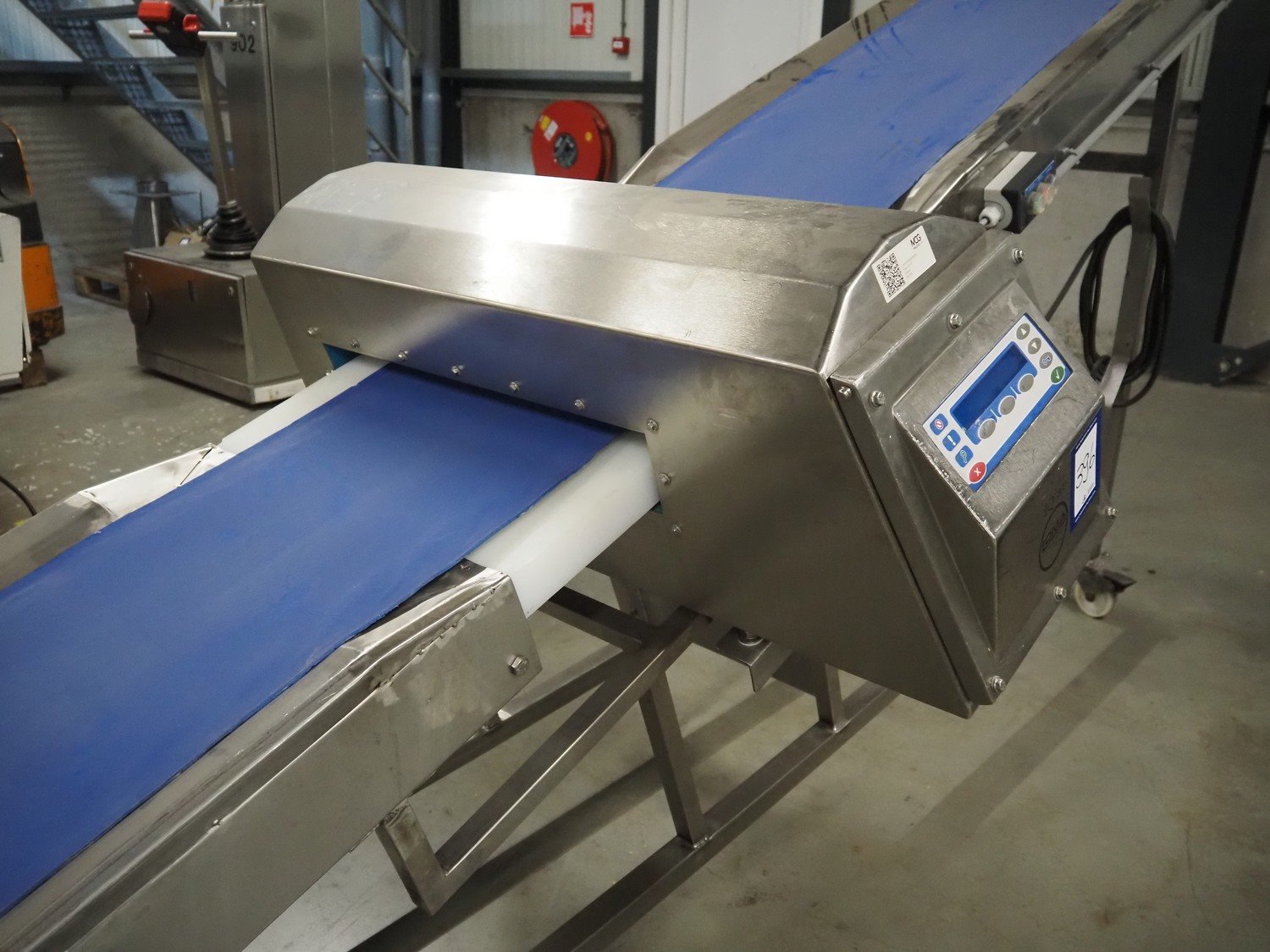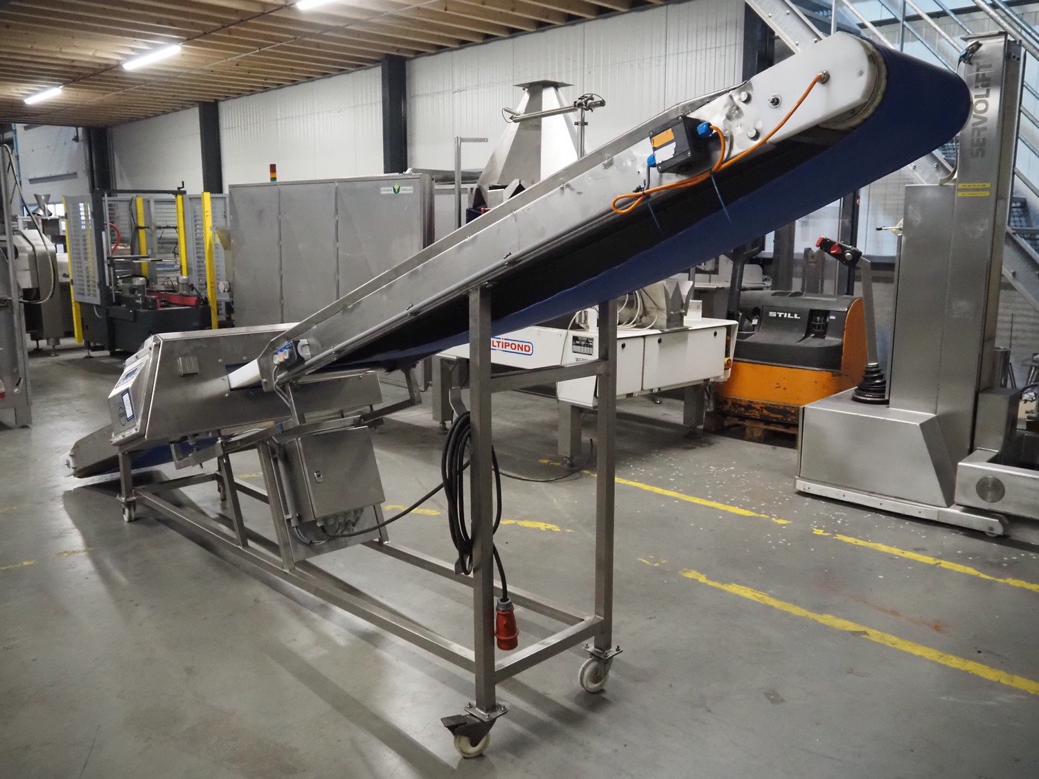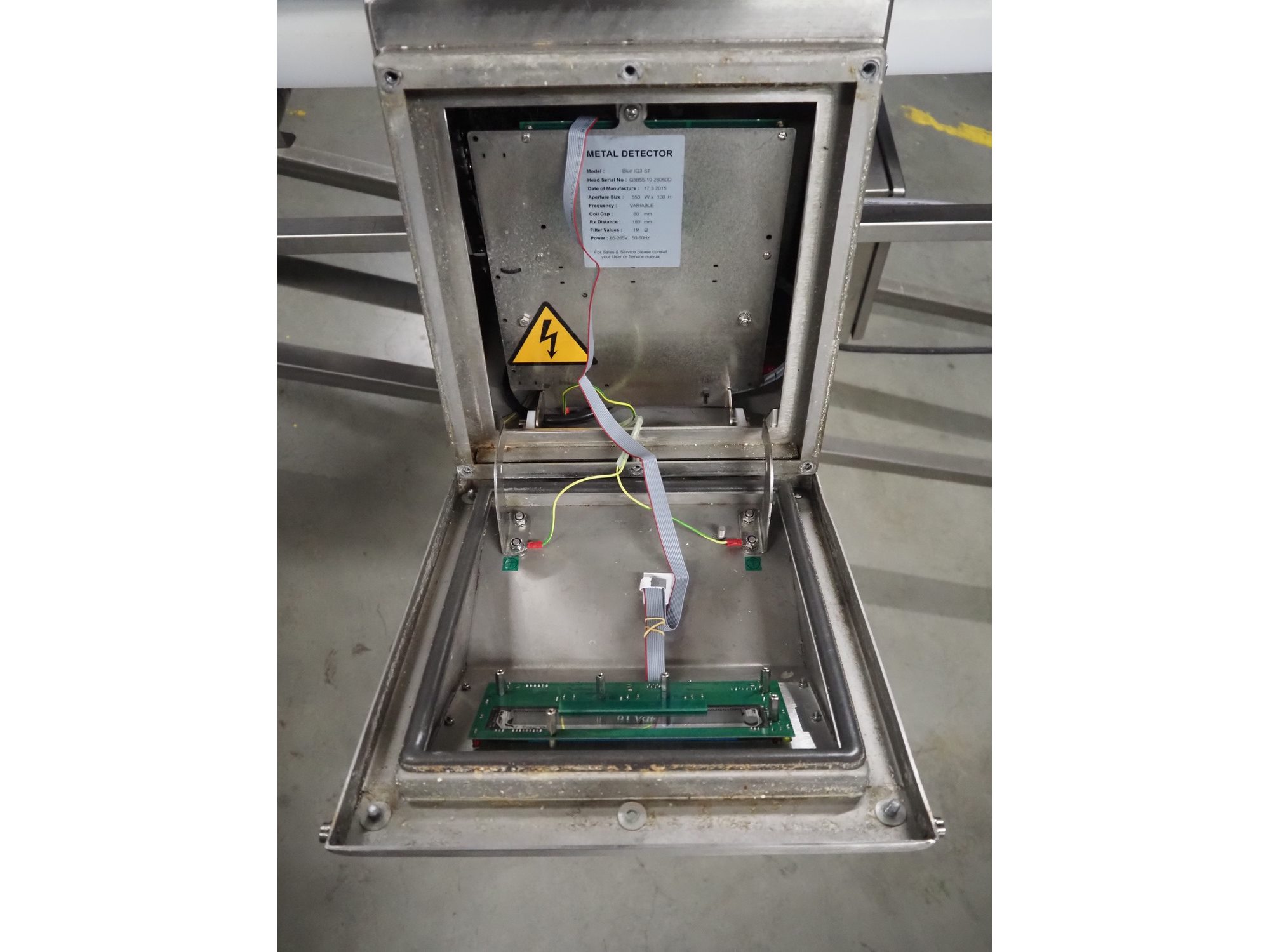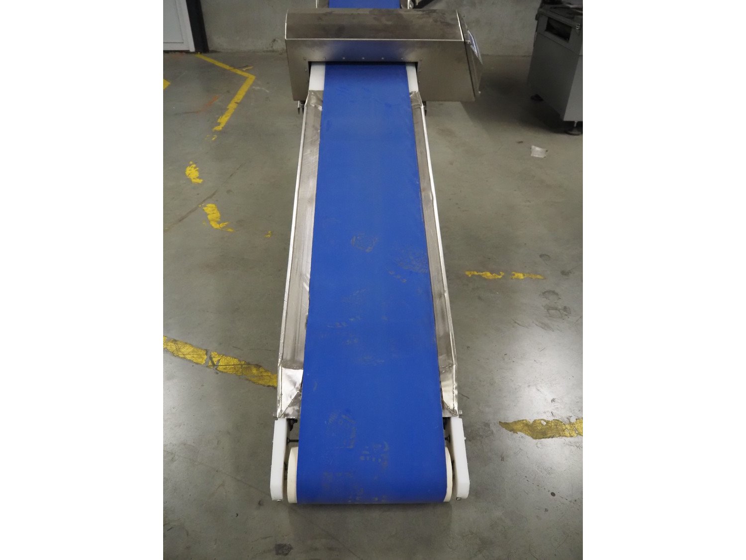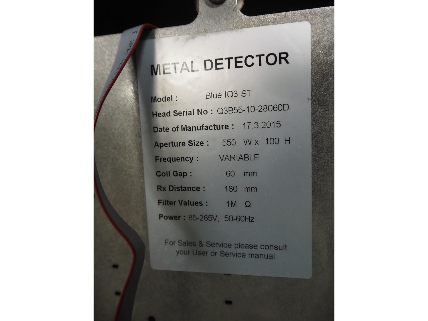 Loma Systems metal detector on mobile elevating belt, type: Blue IQ3 ST, serial number: Q3B55-10-28060D, year of construction: 17.3.2015, 110-240 V, 1 Ph, 50/60 Hz, 0.3-0.6 A, plastic belt, belt width: 410, clearance: 550 mm x 30 mm, elevating height: 1750 mm, total dimensions: 4600 mm x 1030 mm x 1760 mm.
