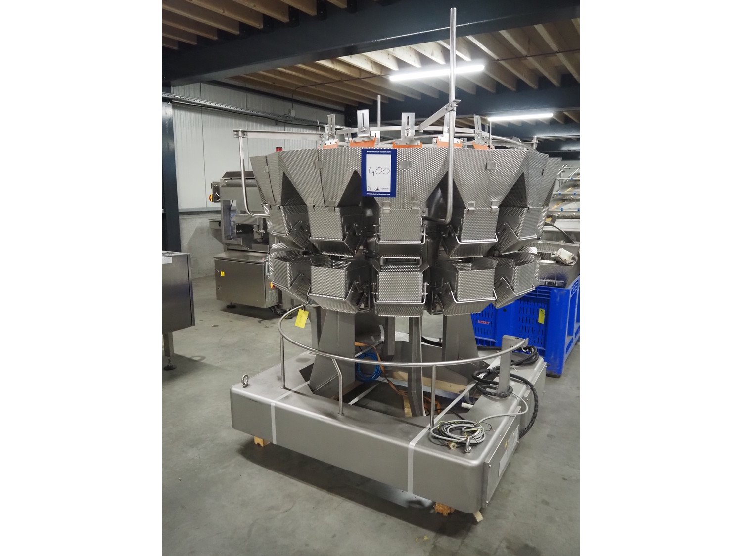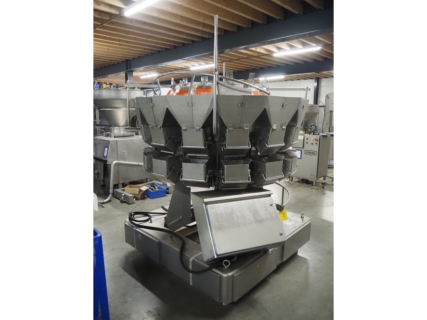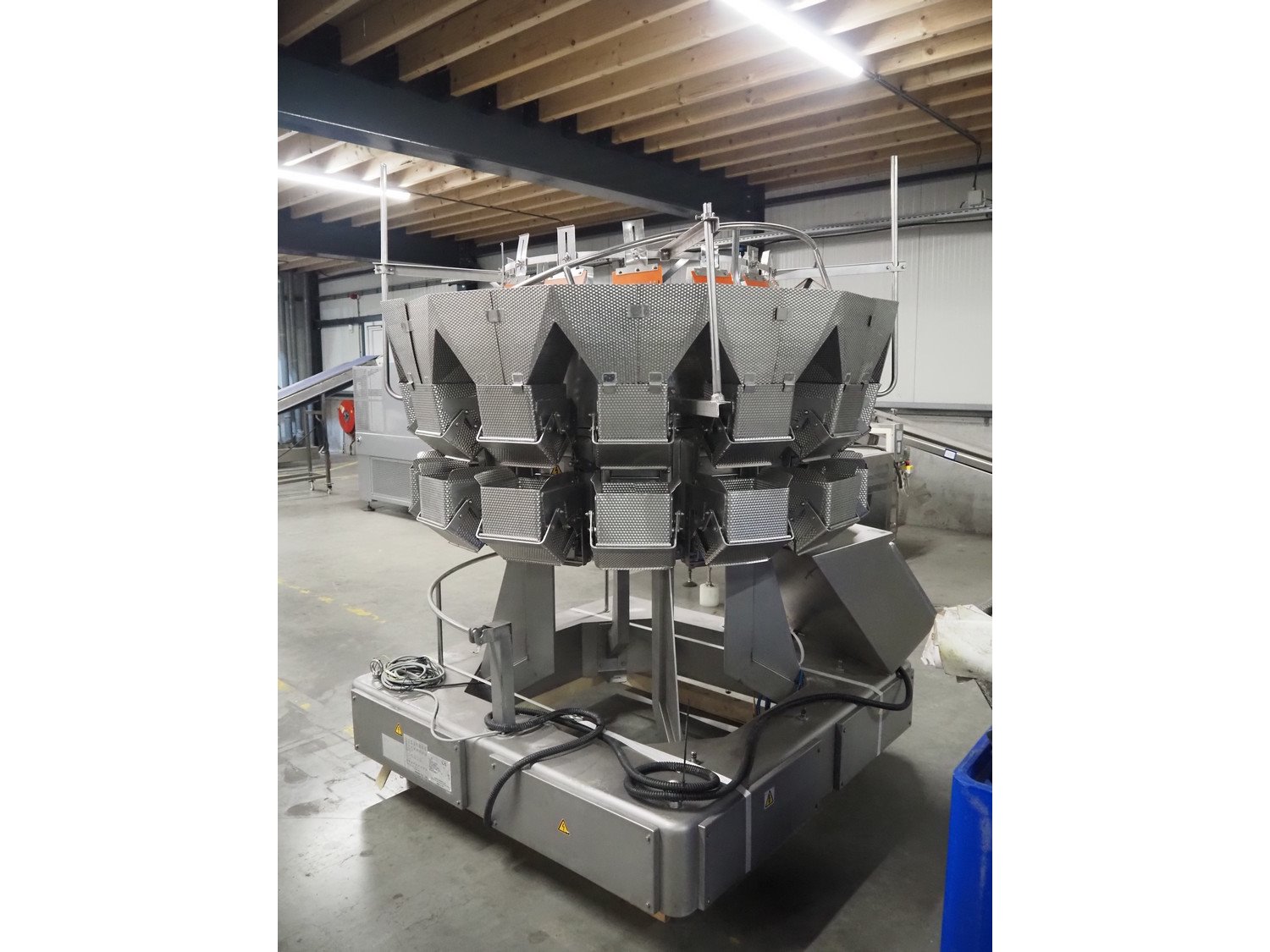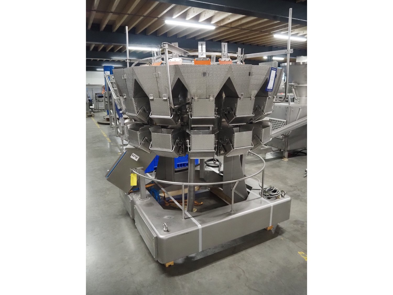 Ishida 14-heads multihead weigher, model: CCW-EM-214W-S/50-WR, serial number: 555175, year of construction: 2005, 220 V, 1 Ph, 50 Hz, 7 A, weight: 920 kg, dimensions: 1850 mm x 1700 mm x 2200 mm. Including pallet box with parts, dimensions pallet box: 1200 mm x 1000 mm x 1250 mm.