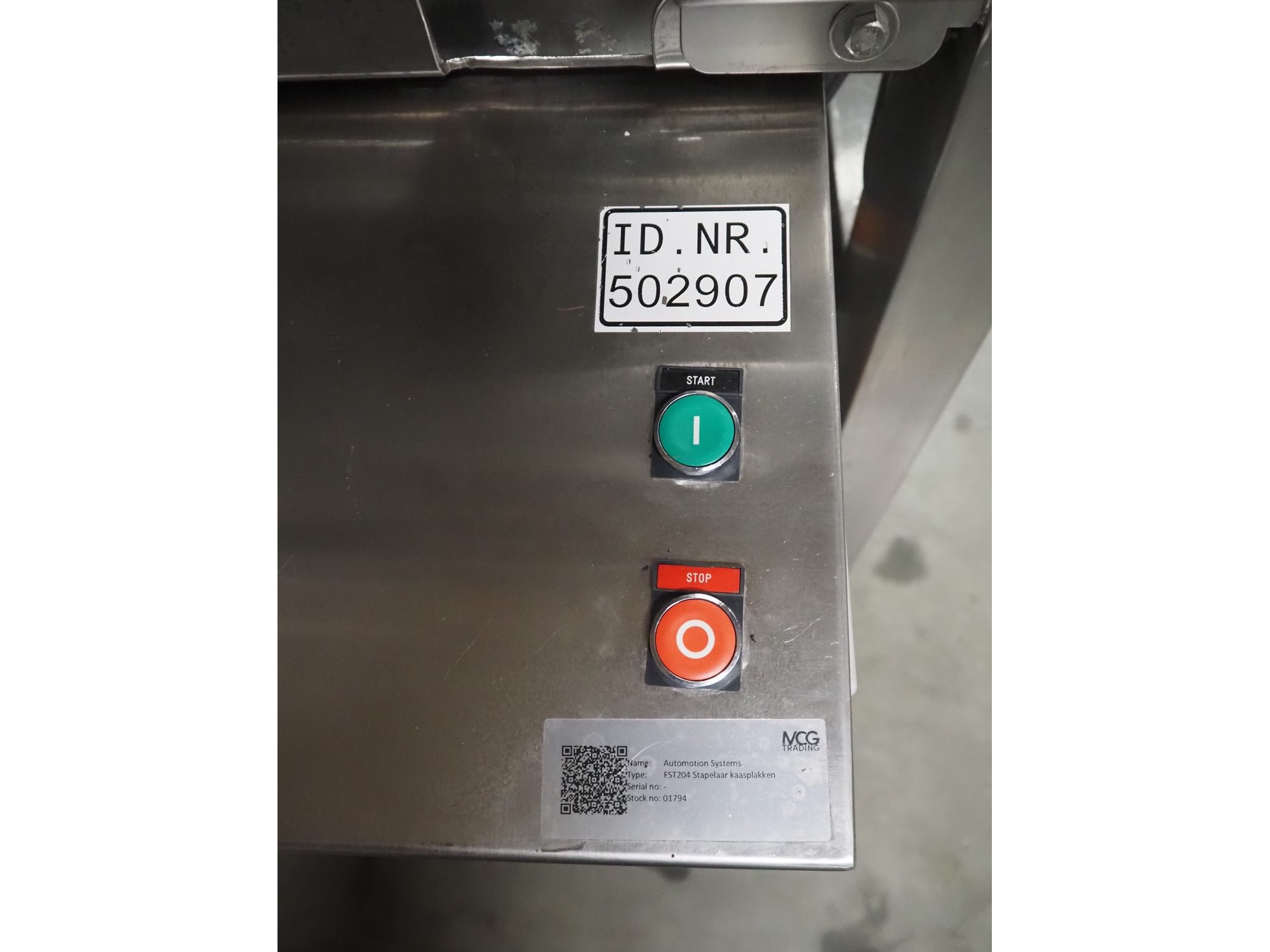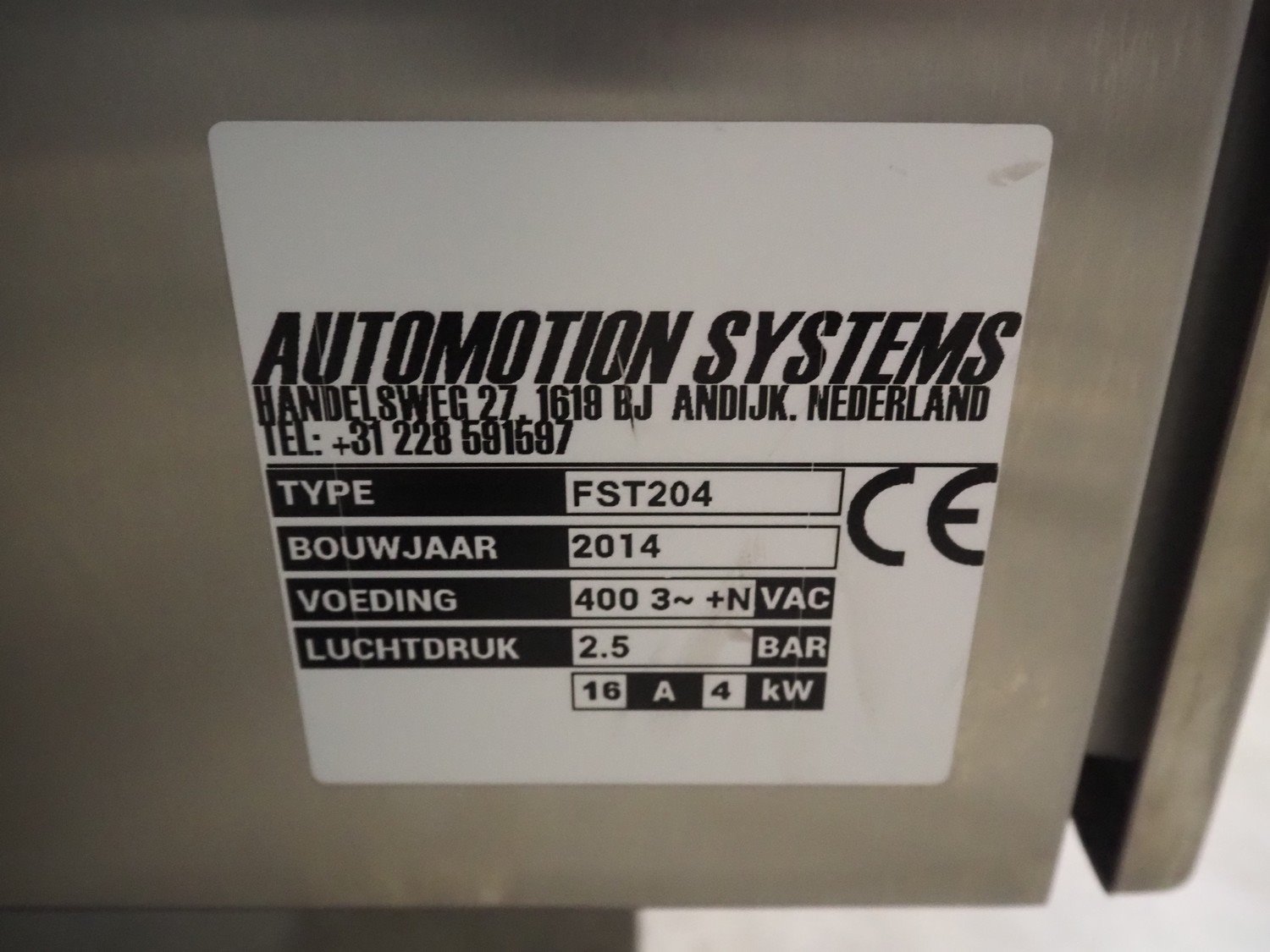 Automotion Systems tray filling machine, type: FST204, year of construction: 2014, 400 V, 3 Ph, 16 A, 4 kW, 2.5 bar, plastic belt with dividers, belt width: 165 mm, distance between dividers: 150 mm, divider height: 150 mm, total dimensions tray filler: 1000 mm x 1400 mm x 2000 mm, including infeed belt, belt width: 265 mm, total dimensions: 1900 mm x 500 mm x 1000 mm. Including t ransport belt, s/s frame, plastic belt, belt width: 285 mm, total dimensions transport belt: 3850 mm x 430 mm x 1060 mm.