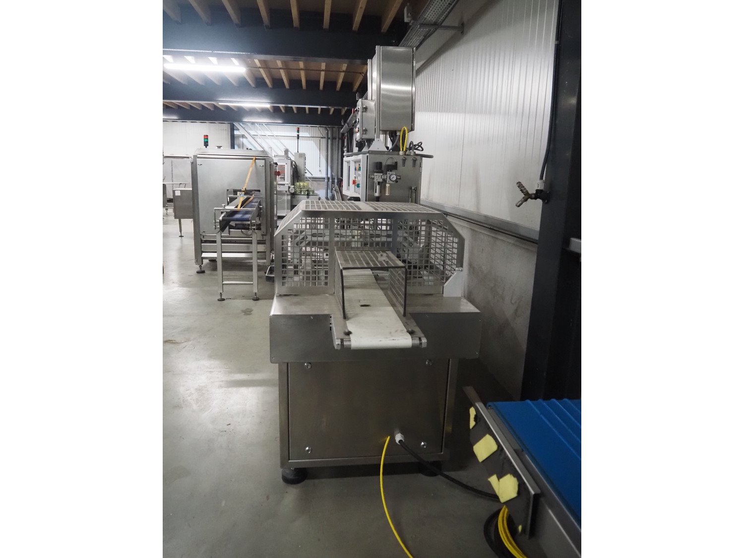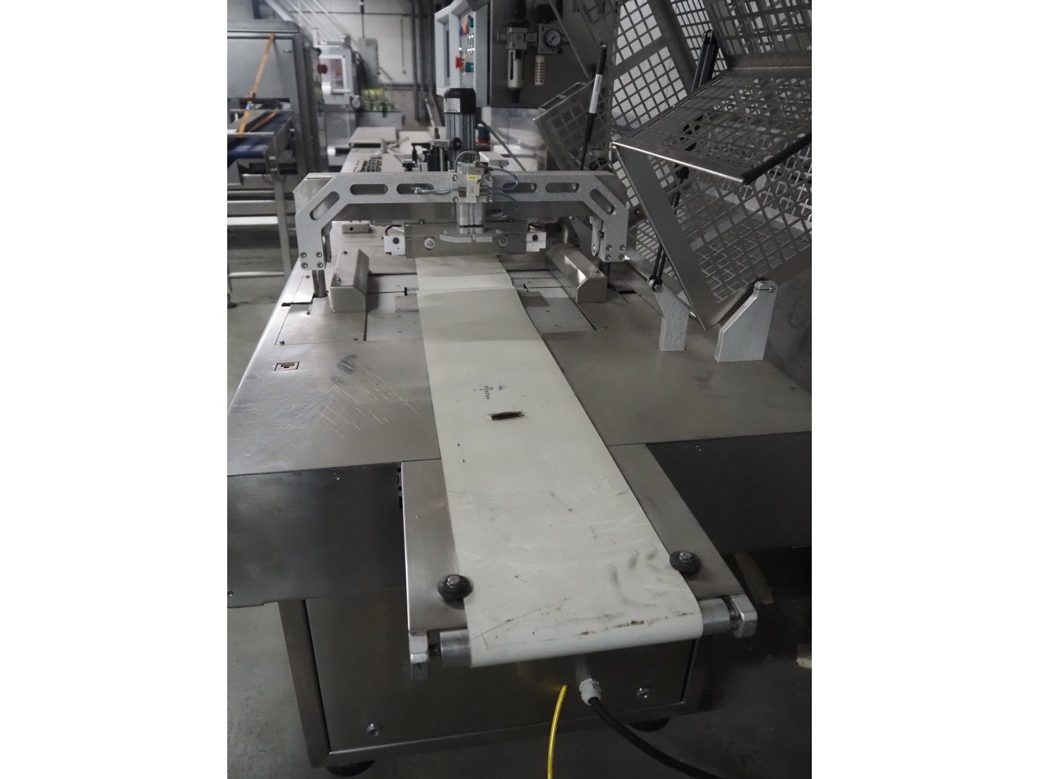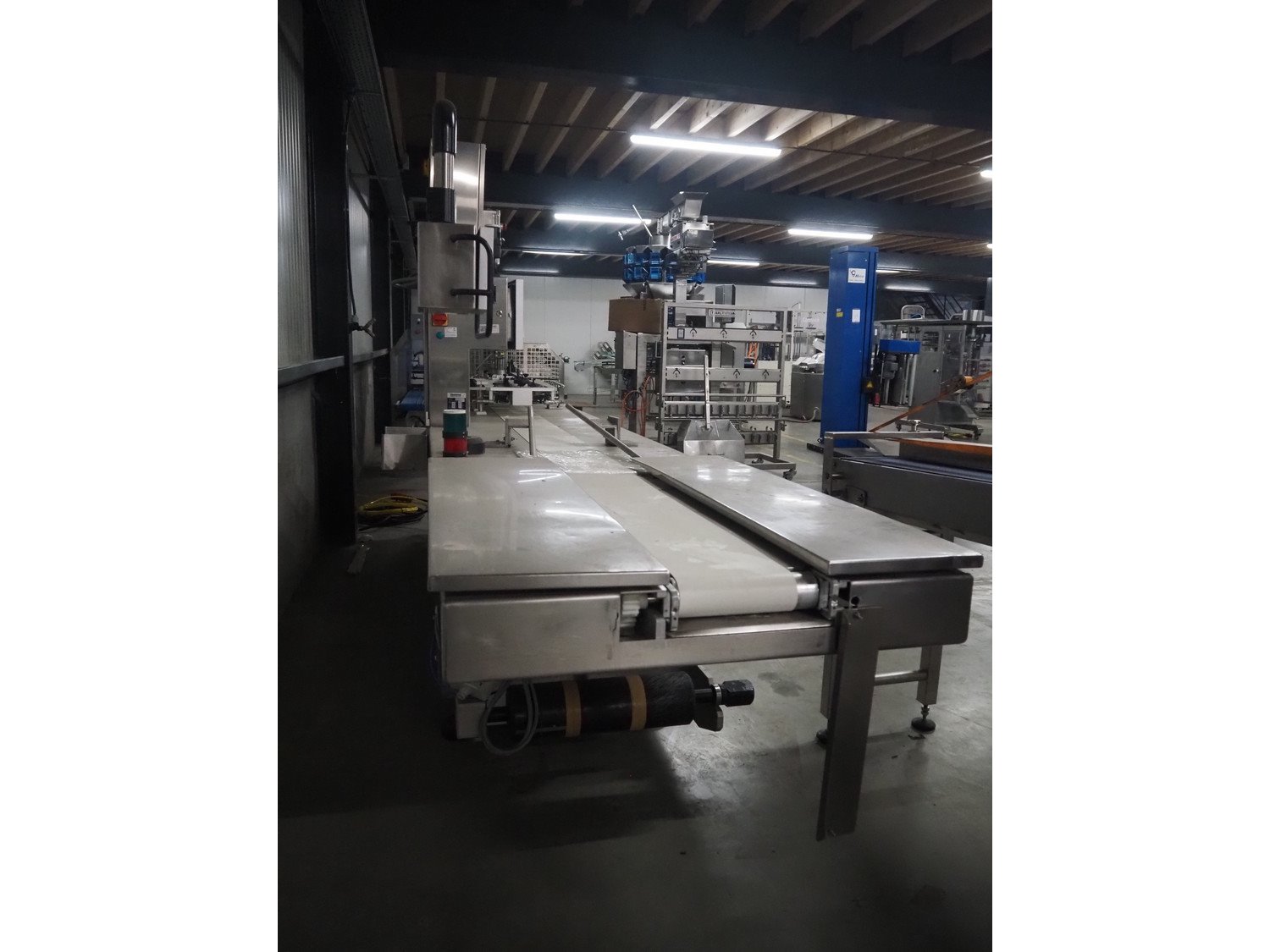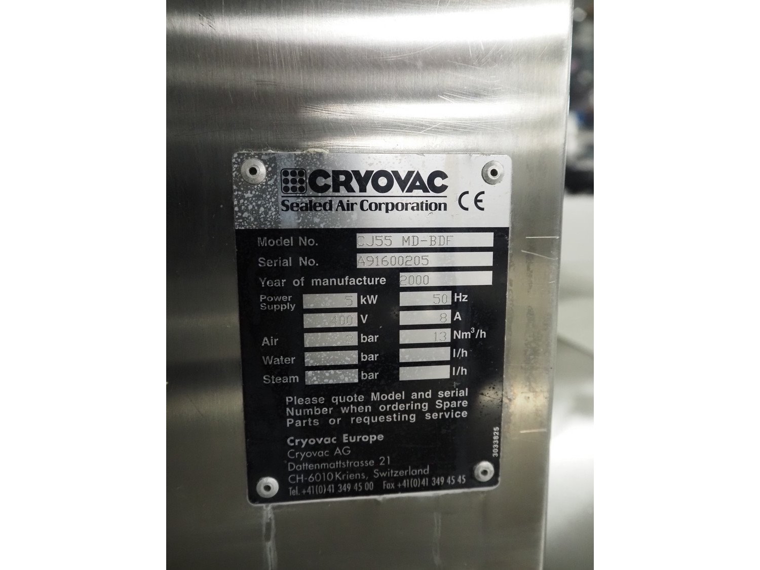 Cryovac horizontal form, fill and seal machine, type: CJ55 MD-BDF, serial number: A91600205, year of construction: 2000, 400 V, 50 Hz, 8 A, 5 kW, plastic belt, belt width: (2x) 200 mm, seal width: 250 mm, clearance: 200 mm x 60 mm, total dimensions: 5000 mm x 1100 mm x 2300 mm.