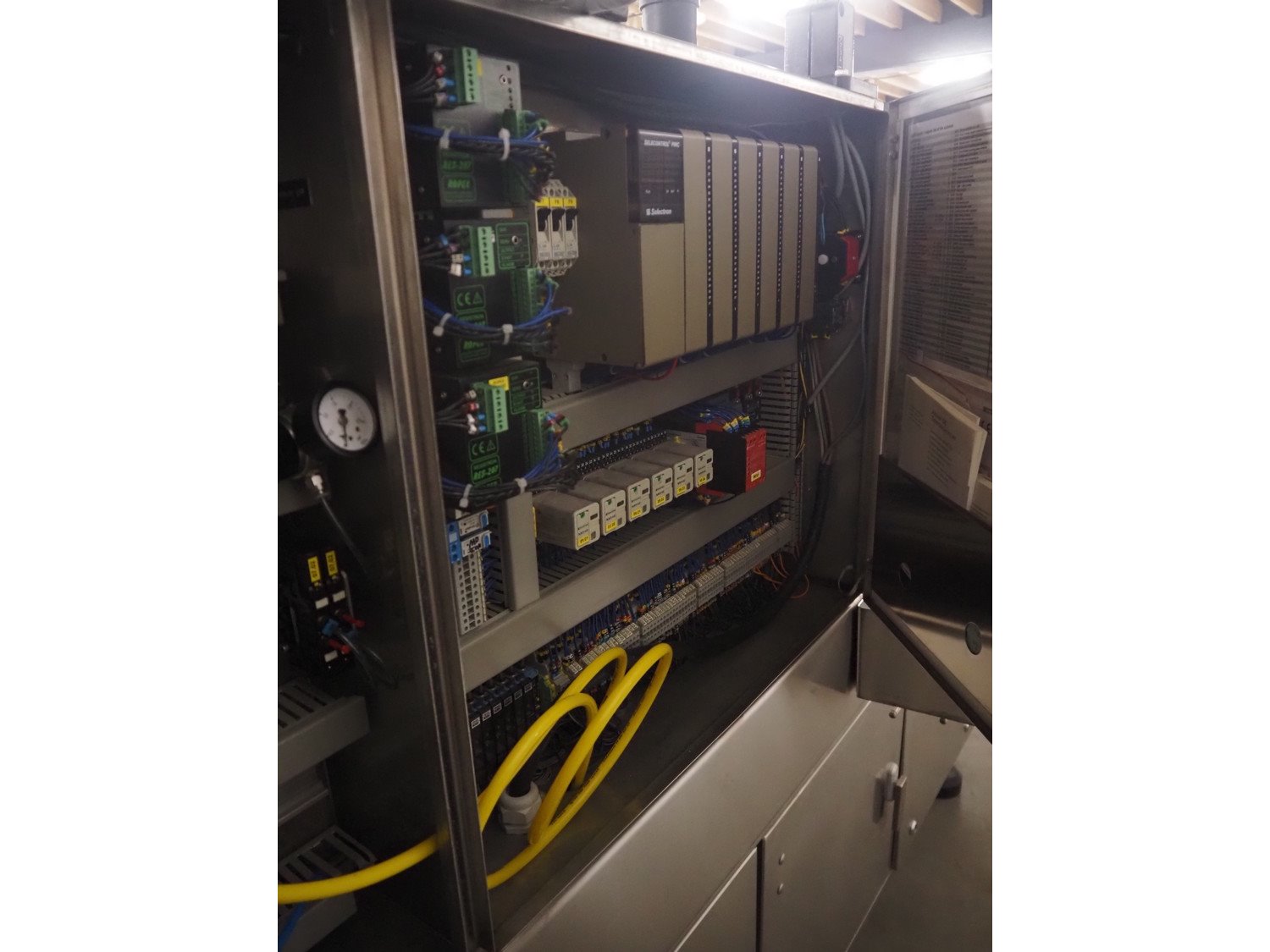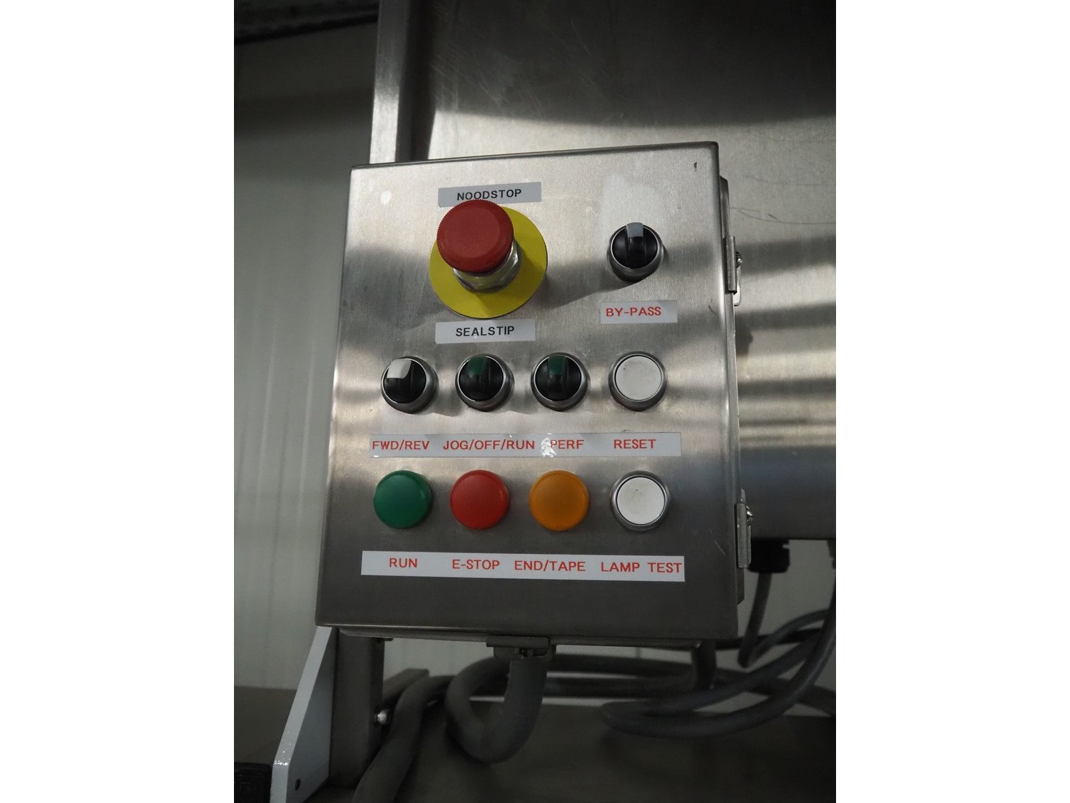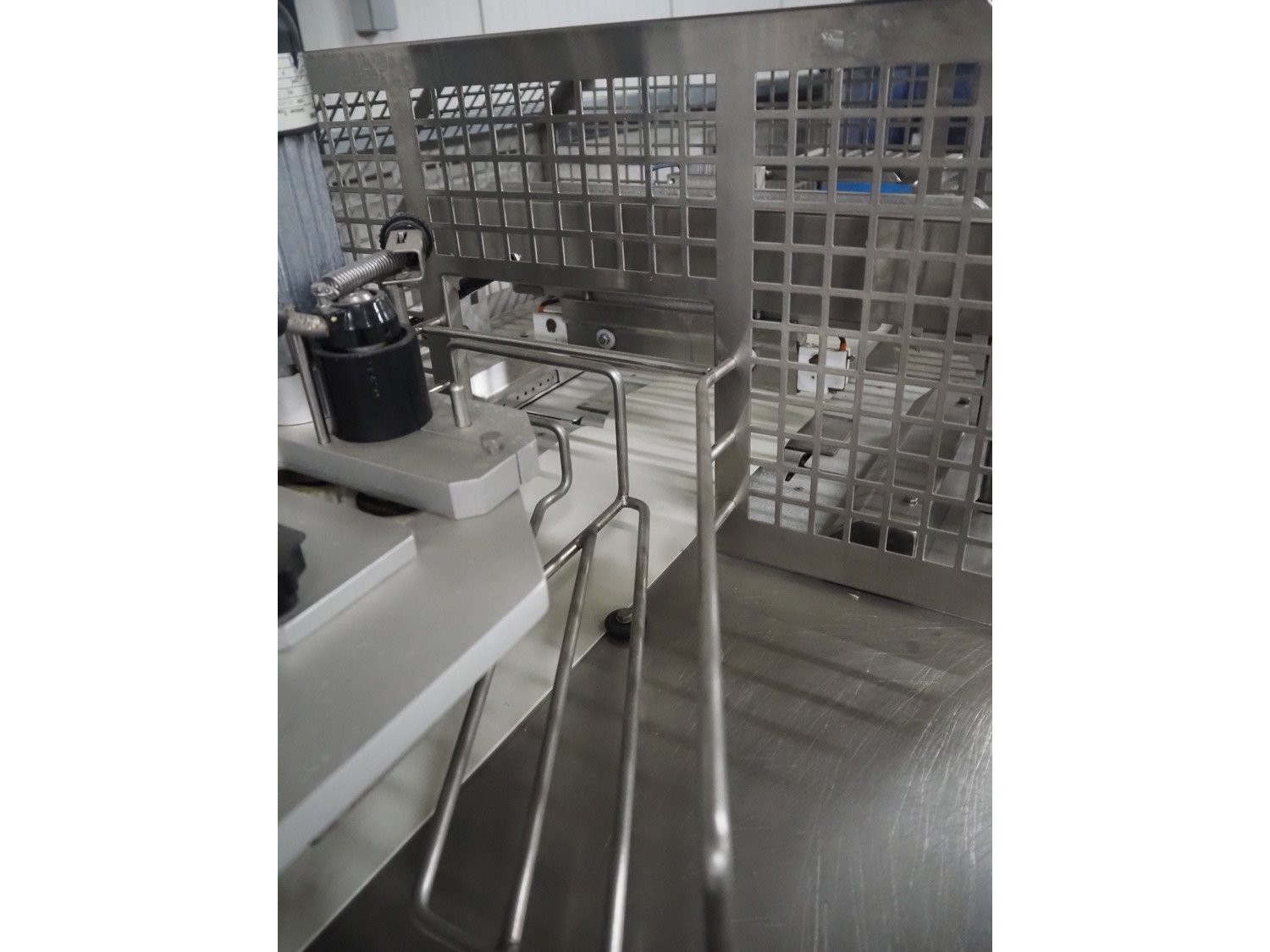 Cryovac horizontal form, fill and seal machine, type: CJ55 MD-BDF, serial number: A91600205, year of construction: 2000, 400 V, 50 Hz, 8 A, 5 kW, plastic belt, belt width: (2x) 200 mm, seal width: 250 mm, clearance: 200 mm x 60 mm, total dimensions: 5000 mm x 1100 mm x 2300 mm.