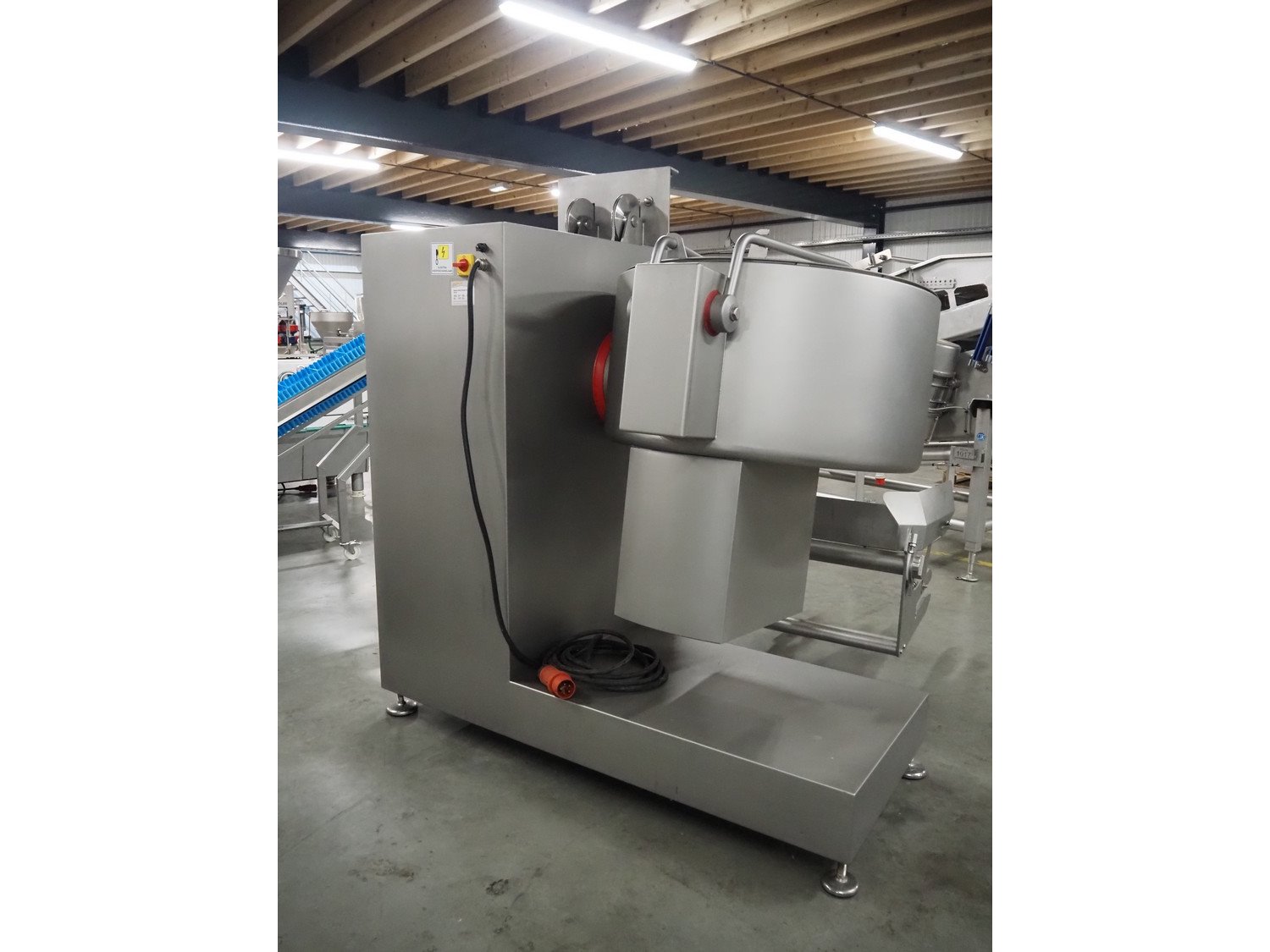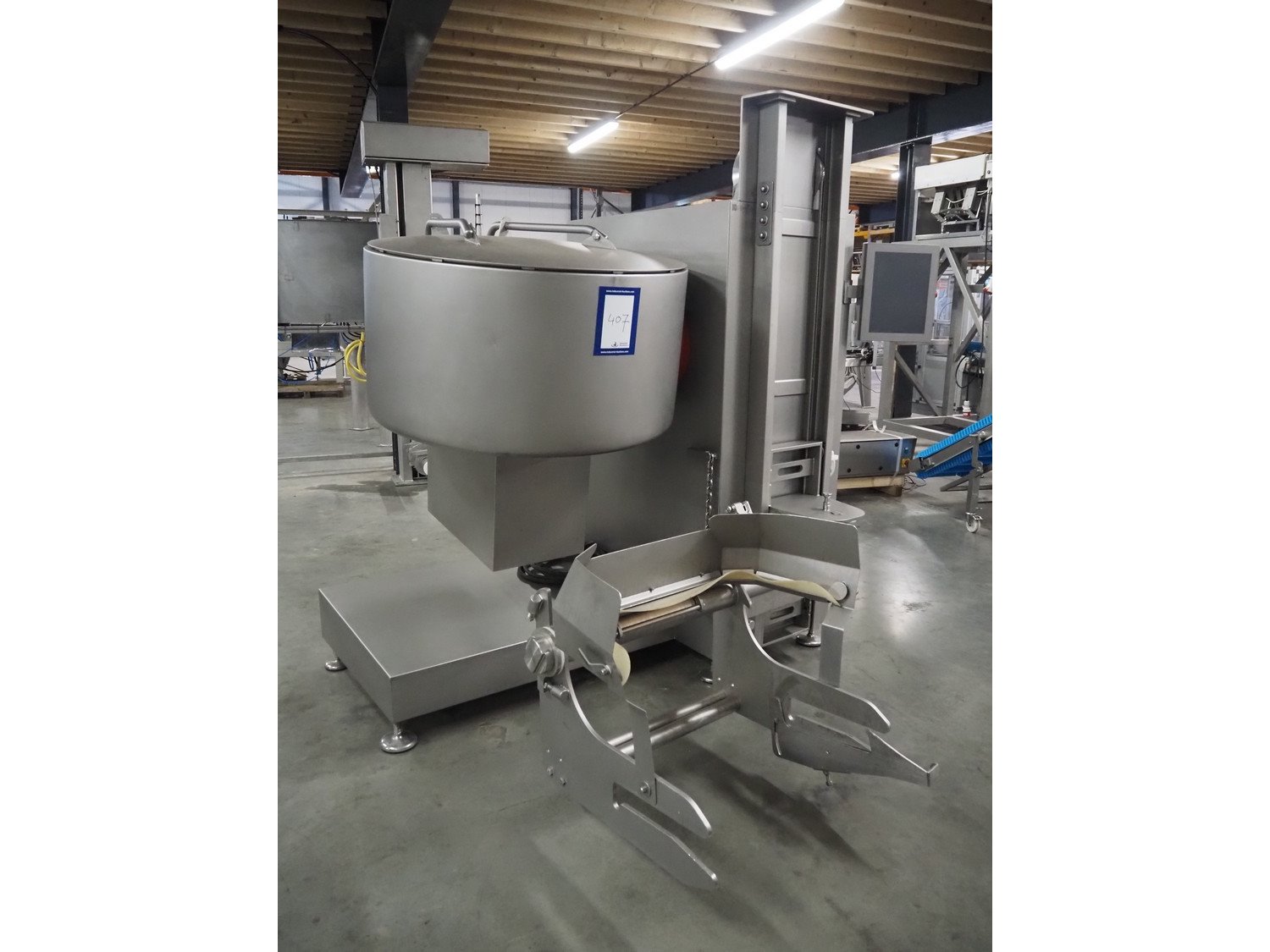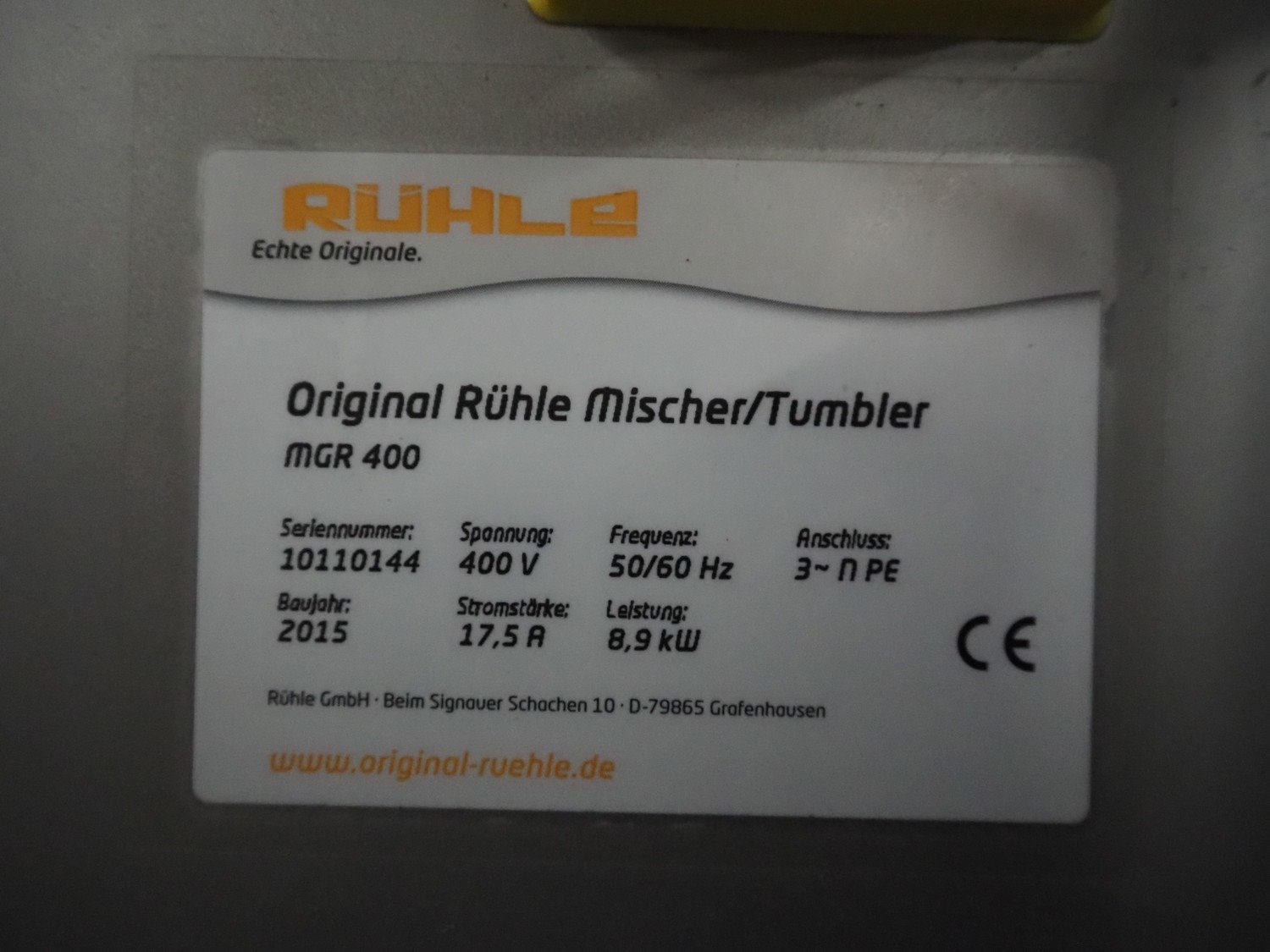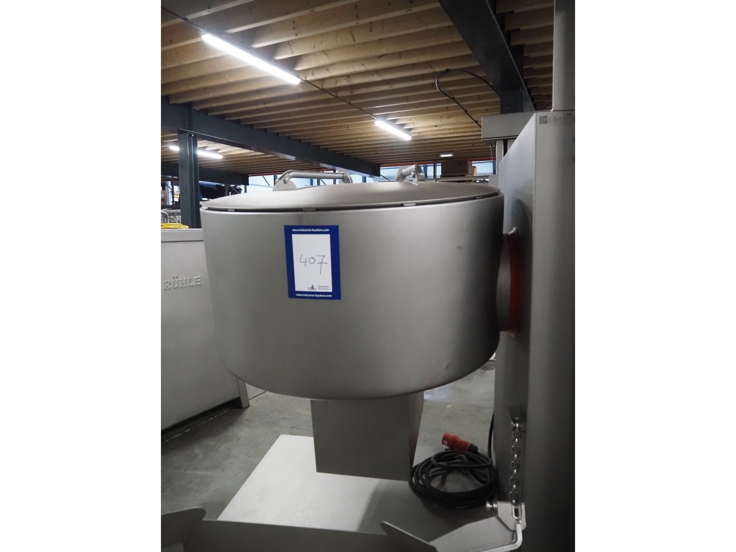 Rühle cooled vacuum tumbler / mixer with lifter for 200 liter meat bins, model: MGR 400, serial number: 10110144, year of construction: 2015, 400 V, 50 Hz, 8.9 kW, volume: 400 liter, Busch vacuum pump, capacity: 10 m³ per hour, dimensions: 2200 mm x 2100 mm x 2200 mm.