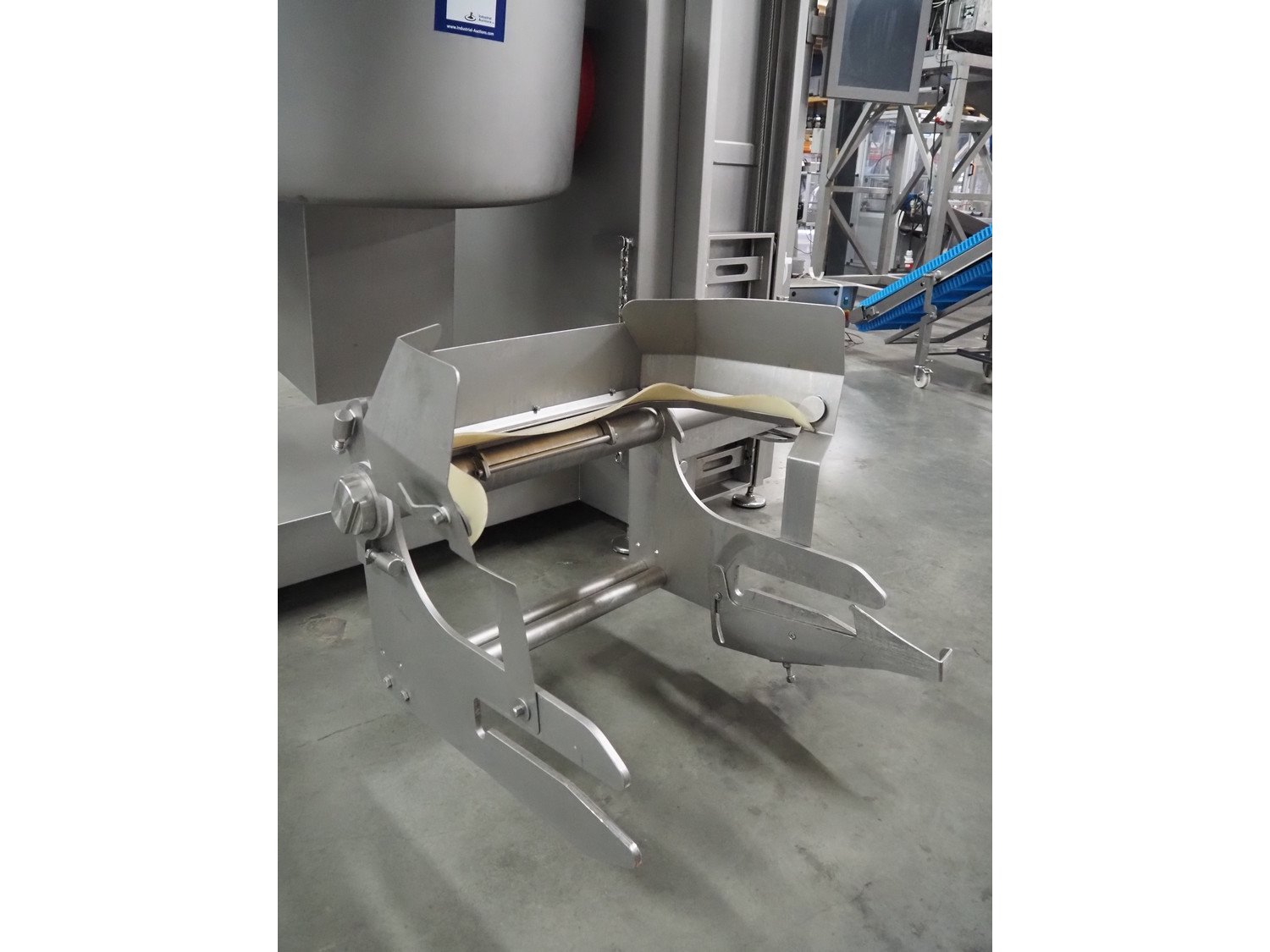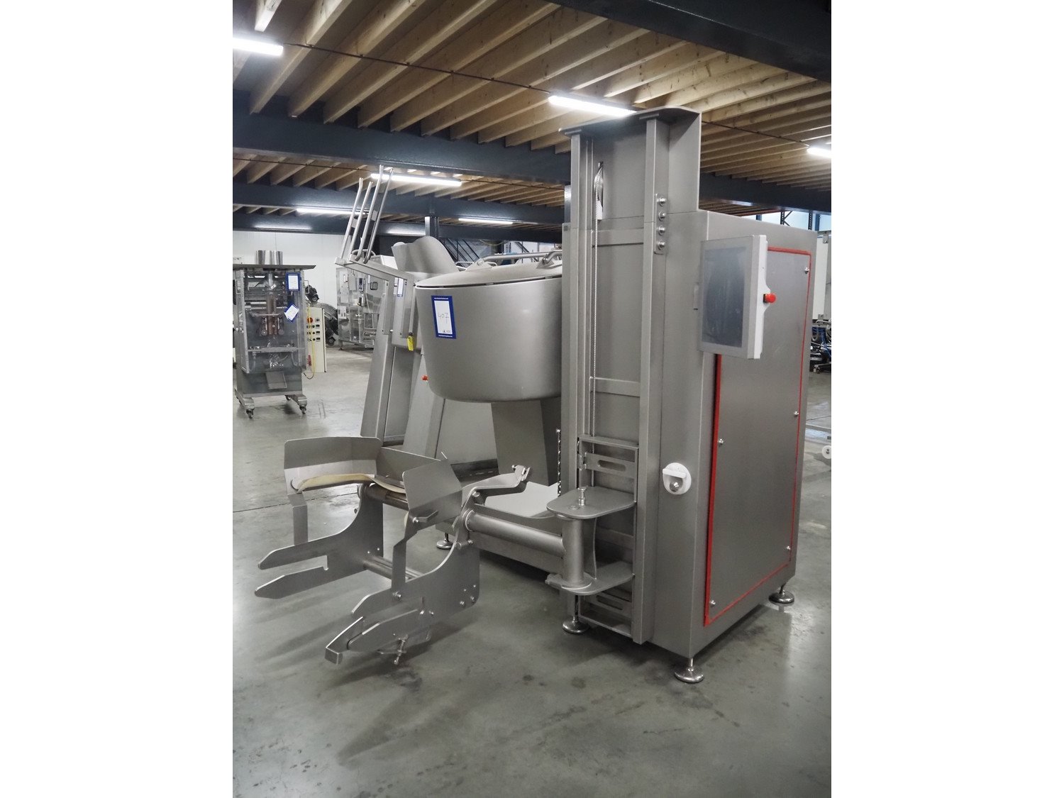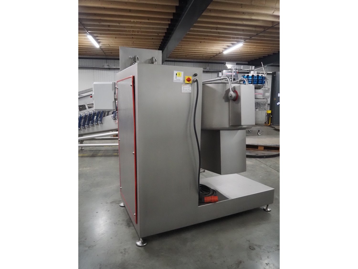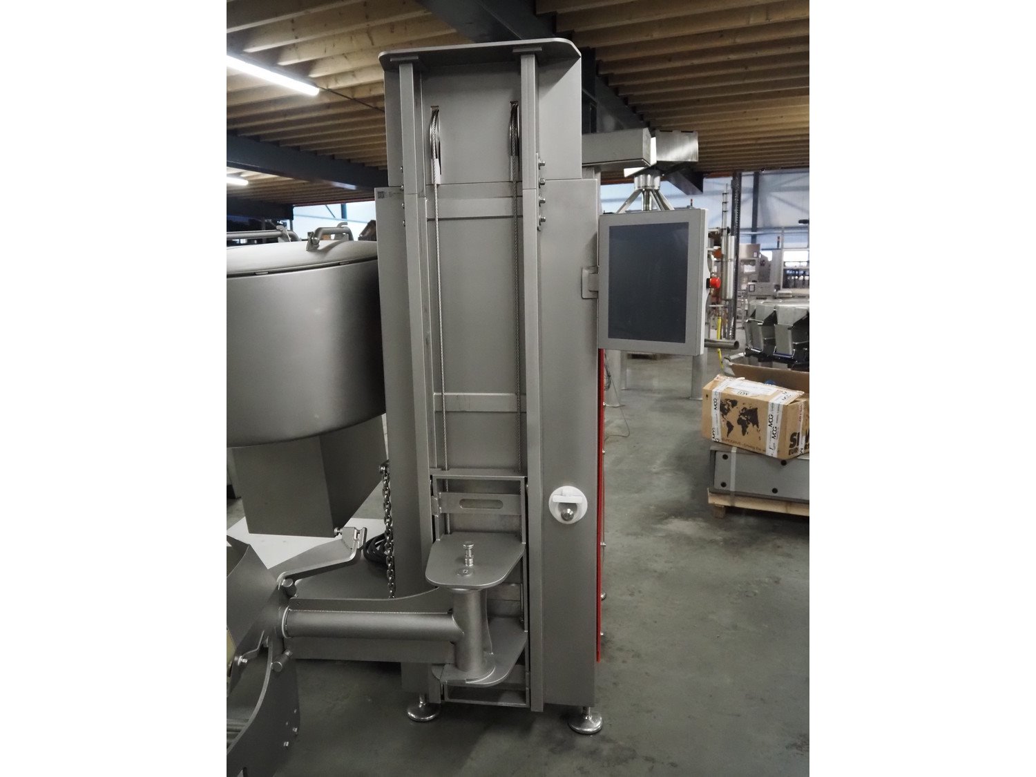 Rühle cooled vacuum tumbler / mixer with lifter for 200 liter meat bins, model: MGR 400, serial number: 10110144, year of construction: 2015, 400 V, 50 Hz, 8.9 kW, volume: 400 liter, Busch vacuum pump, capacity: 10 m³ per hour, dimensions: 2200 mm x 2100 mm x 2200 mm.