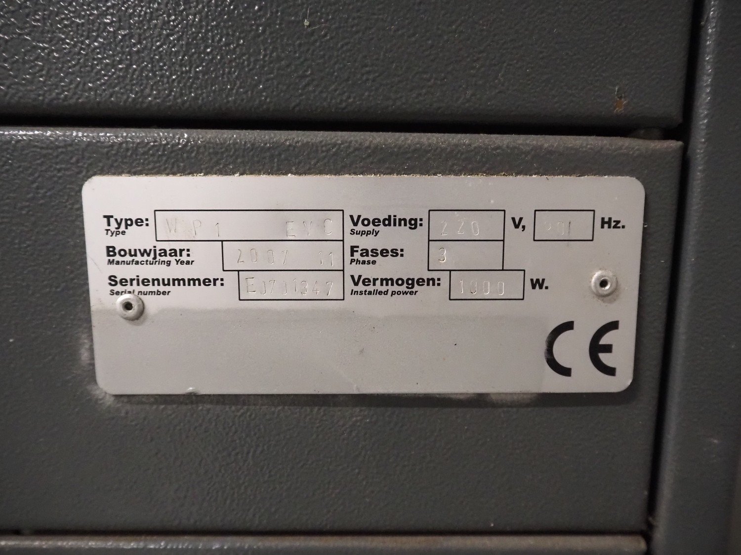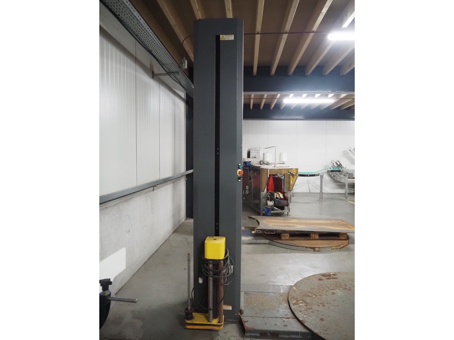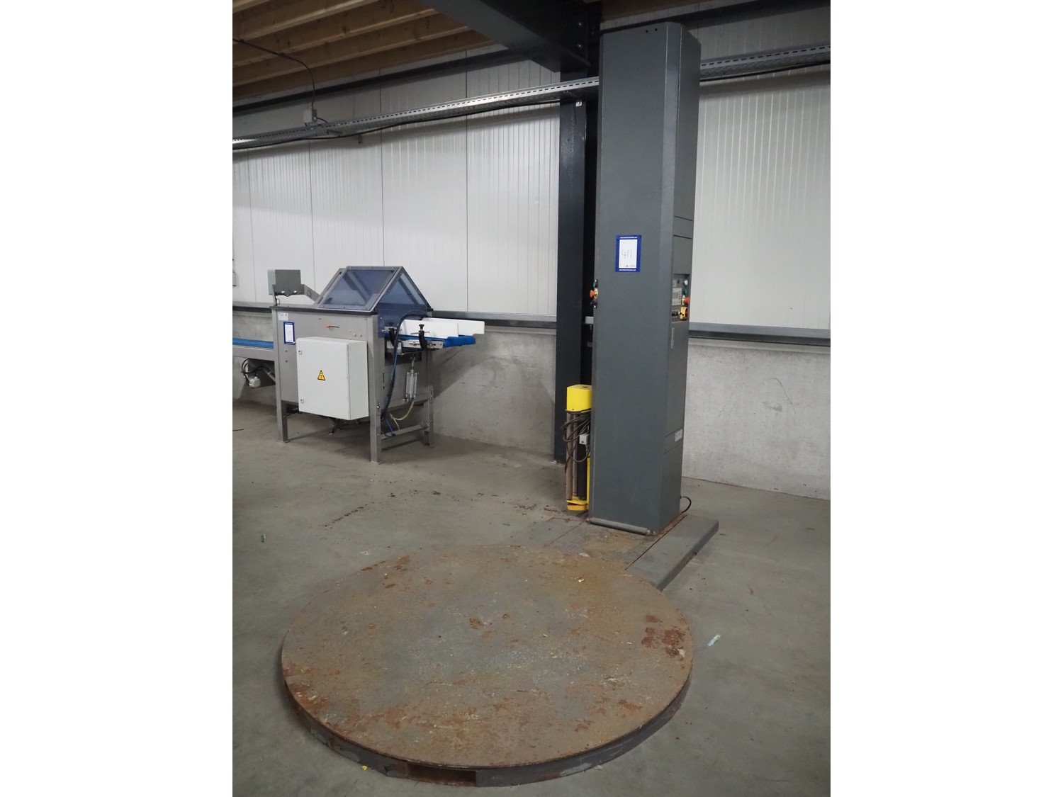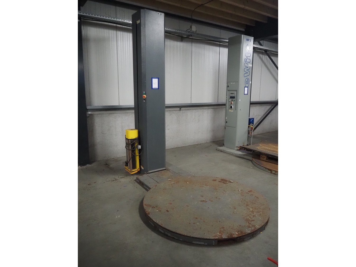 Meiwa pallet wrapper, type: WP1 EVC, serial number: E0701347, year of construction: 11/2007, 220 V, 60 Hz, 1000 W, steel platform, diameter platform: 1650 mm, total dimensions: 2650 mm x 1650 mm x 2820 mm.