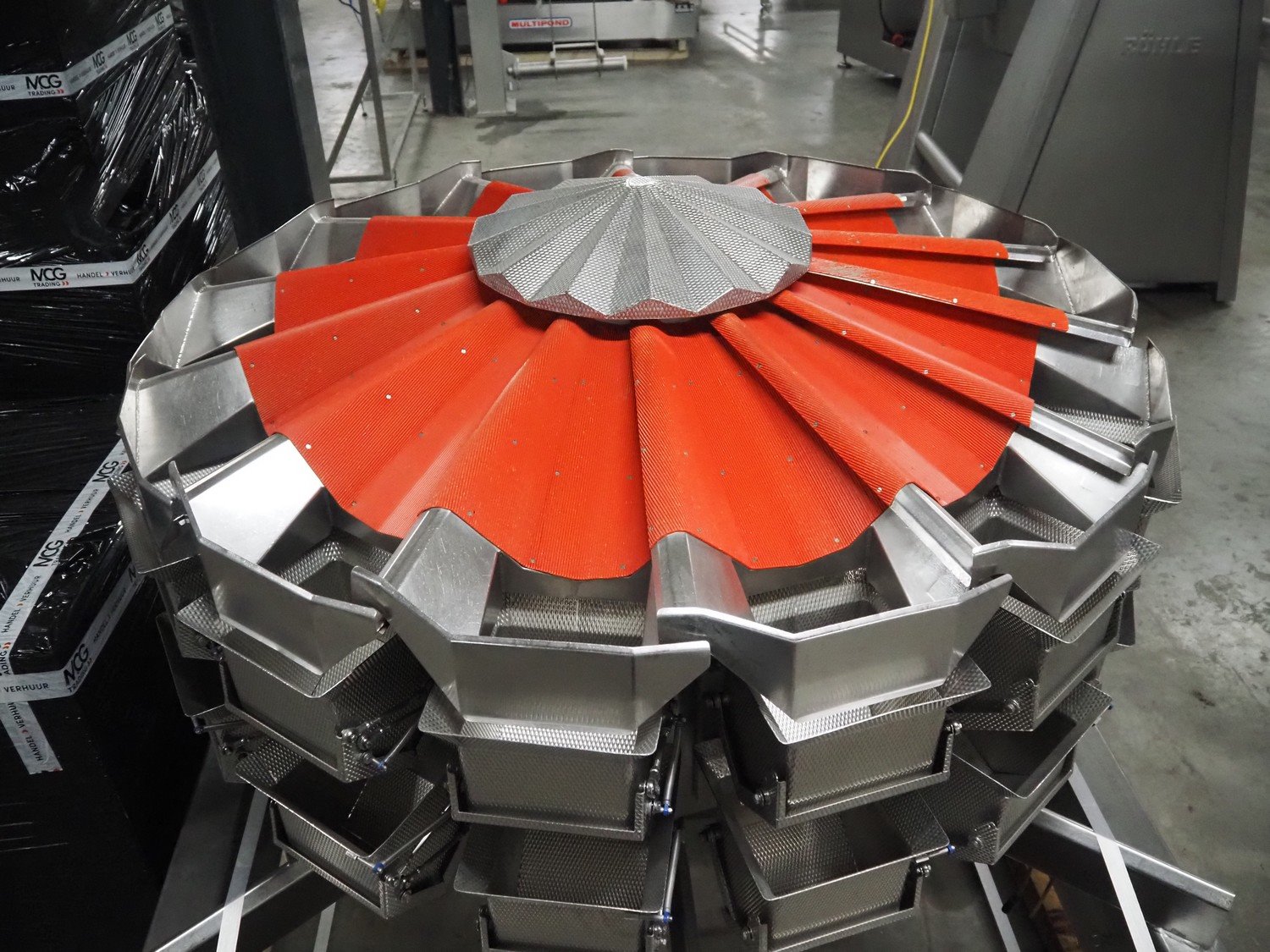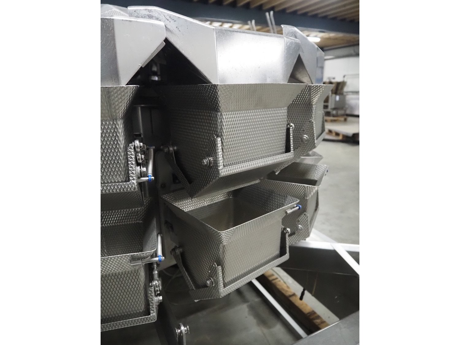 Multipond 14-heads multihead weigher, type: MP 1434-F, fabrication number: M 1420, year of construction: 2001, 230 V, 50 Hz, maximum weight: 2400/6000 gram, e=: 1/2 gram, dimensions: 1550 mm x 1900 mm x 1300 mm.