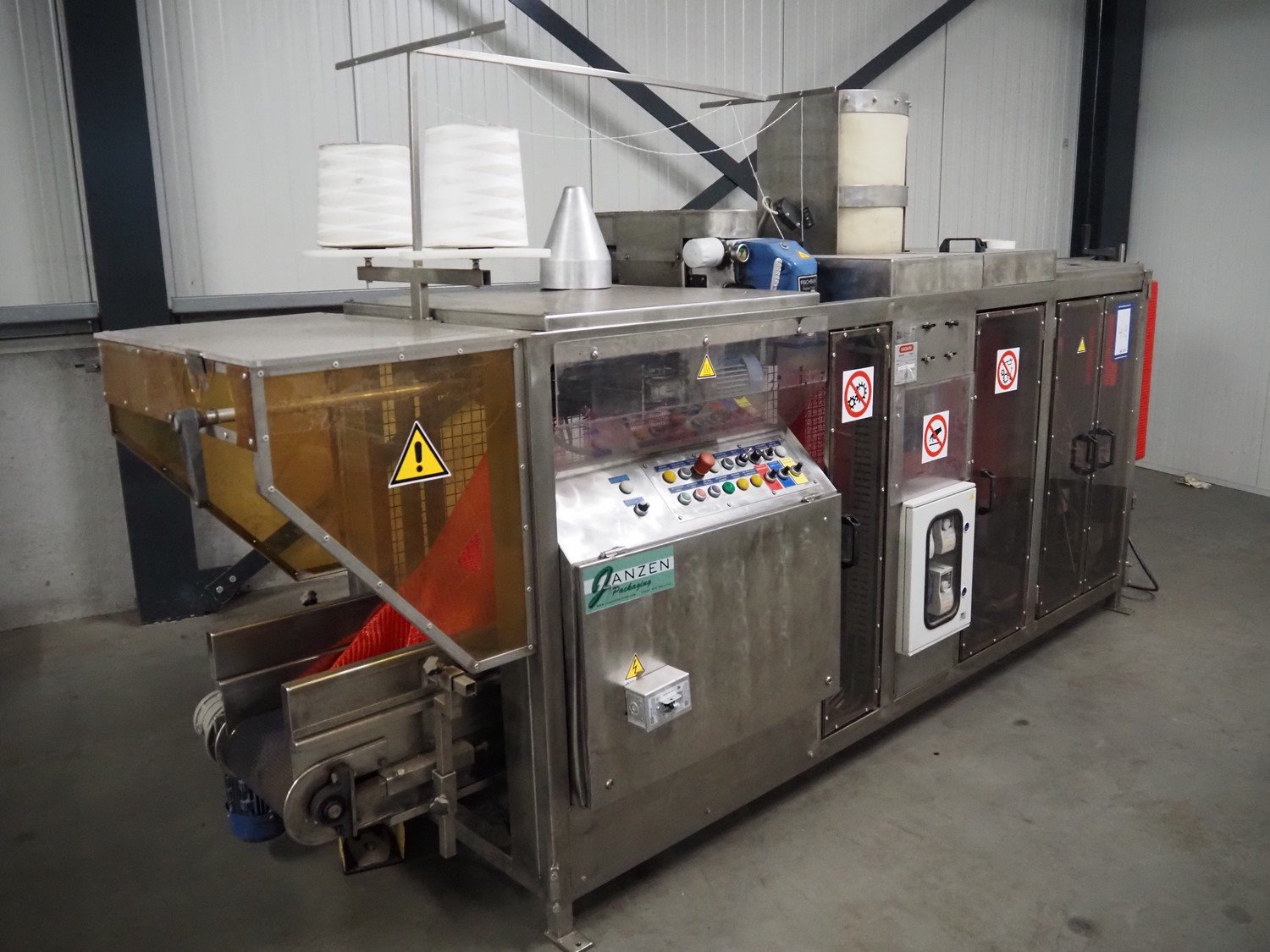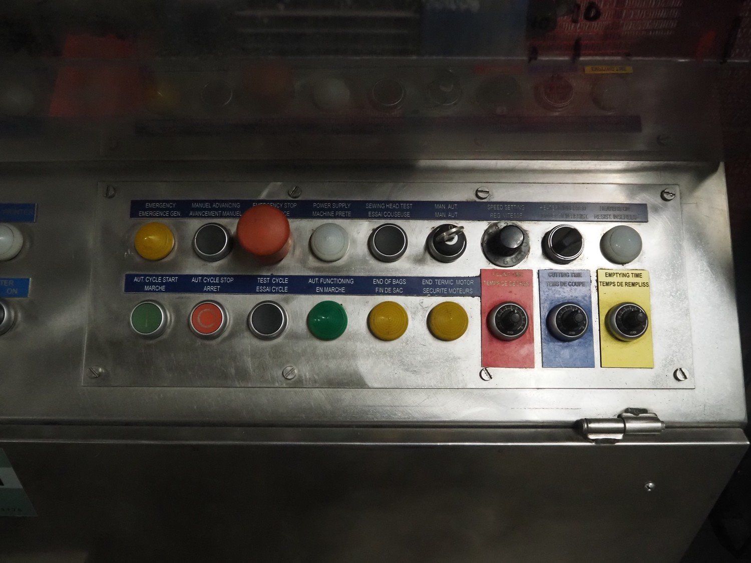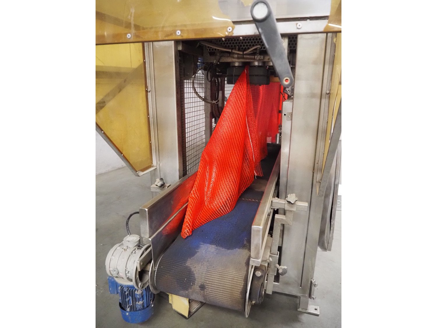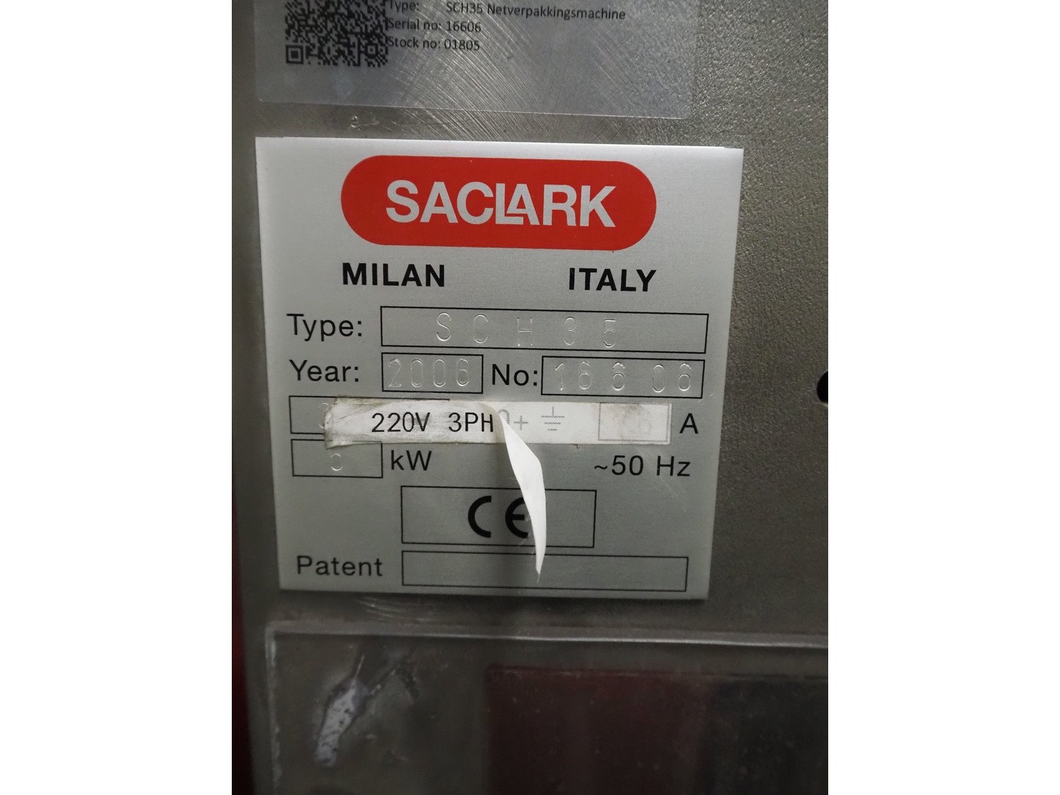 Saclark rollstock bag filling machine, type: SCH 35, number: 166 06, year of construction: 2006, 220 V, 3 Ph, 50 Hz, net width: 900 mm, plastic belt, belt width: 300 mm, total dimensions: 4000 mm x 1000 mm x 1800 mm.
