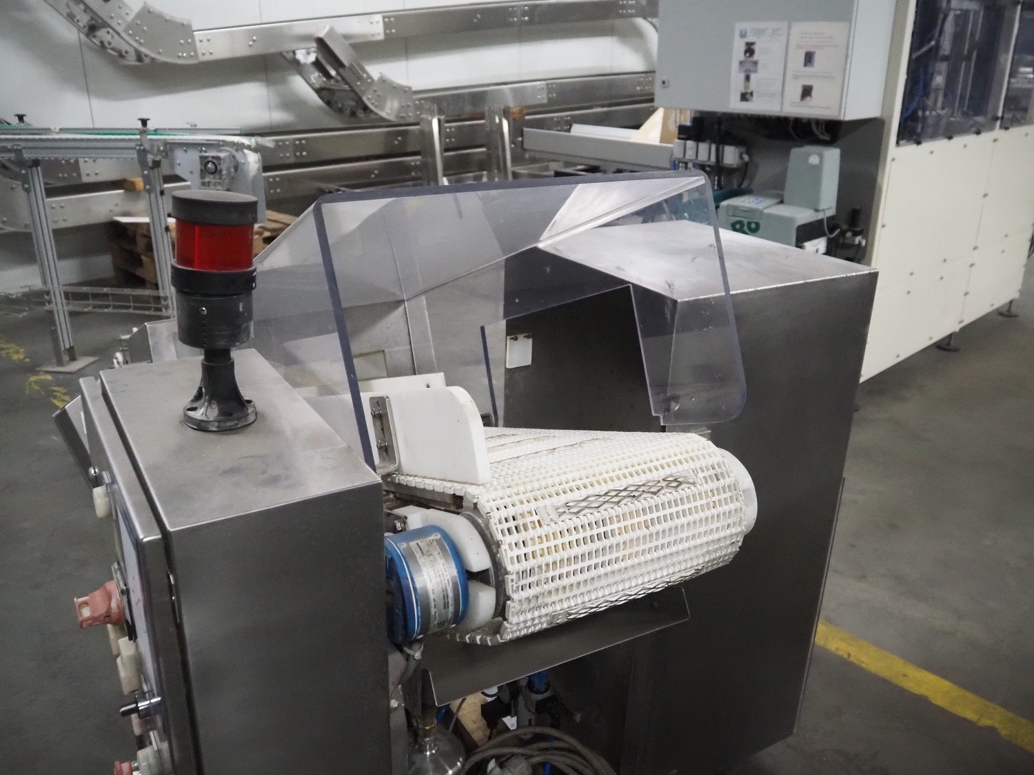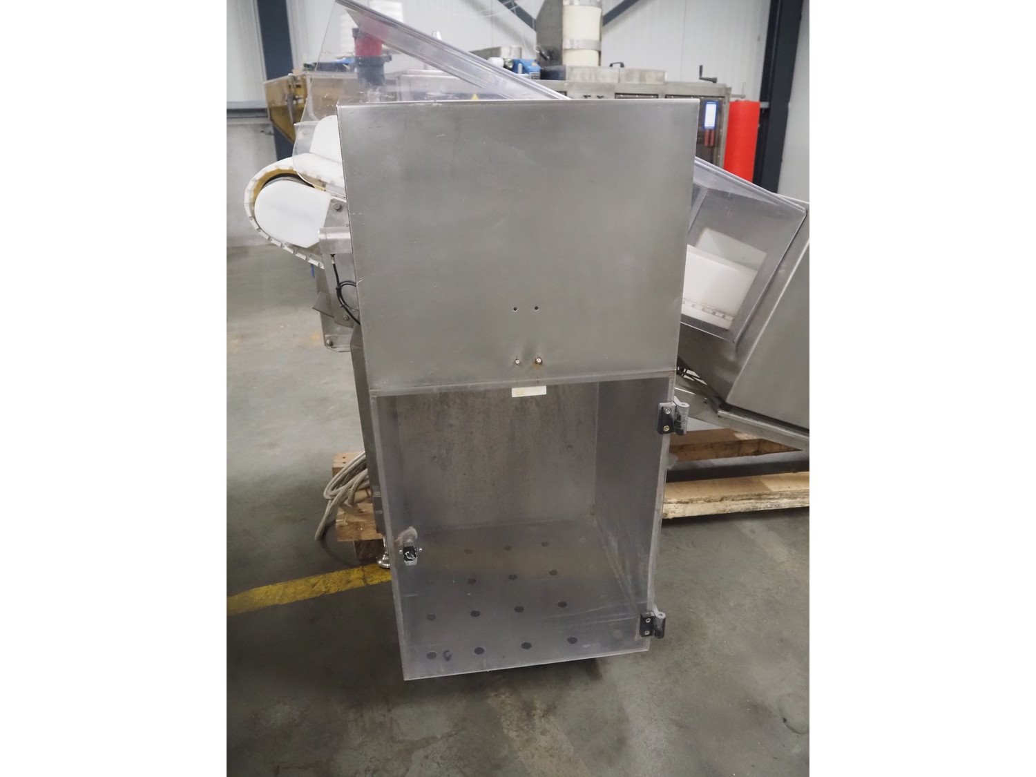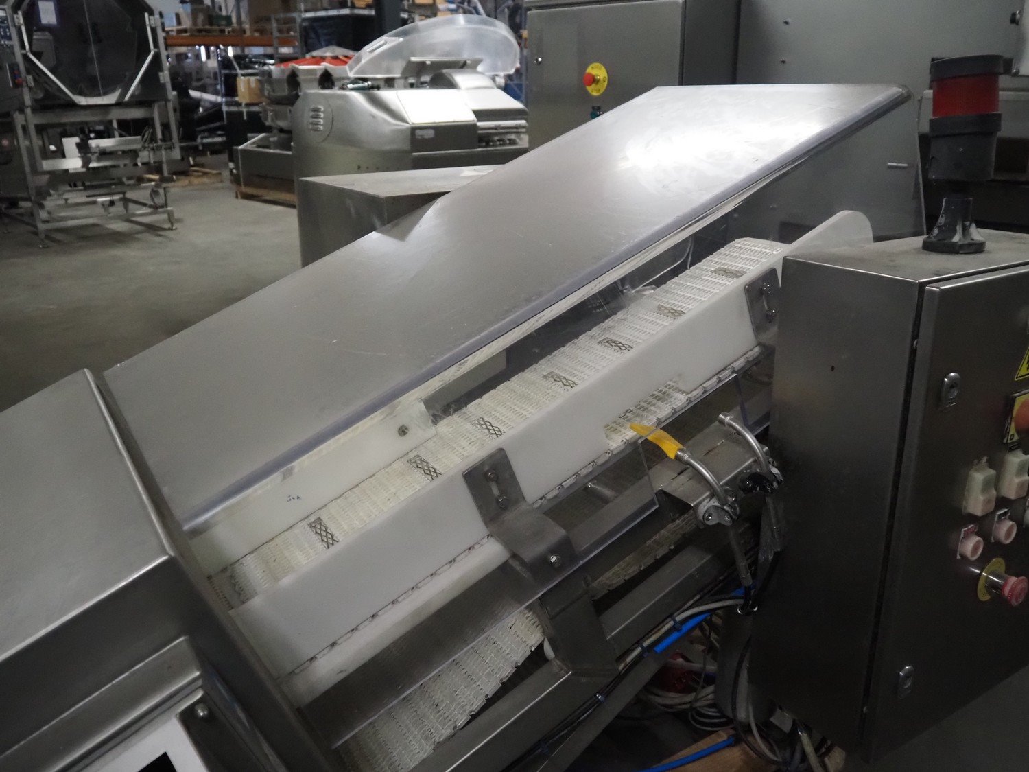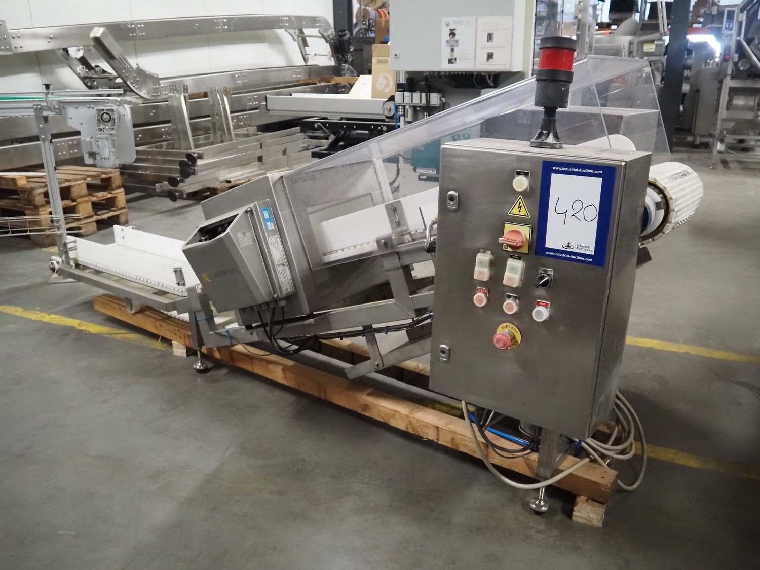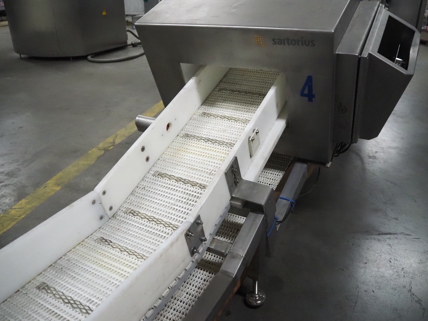 Sartorius metaldetector on elevating belt, plastic mesh belt, belt width: 304 mm, clearance: 350 mm x 160 mm, elevating height: 950 mm, total dimensions: 2900 mm x 1150 mm x 2220 mm. Incomplete.