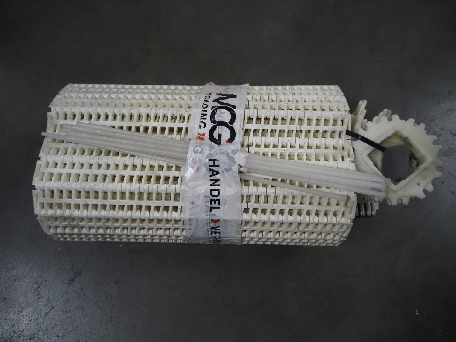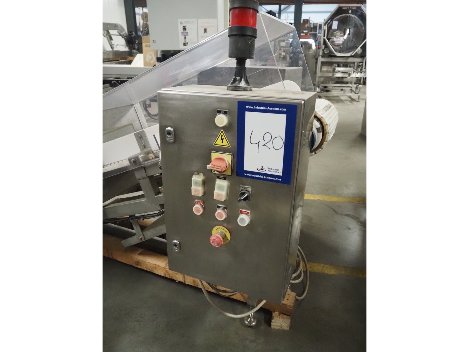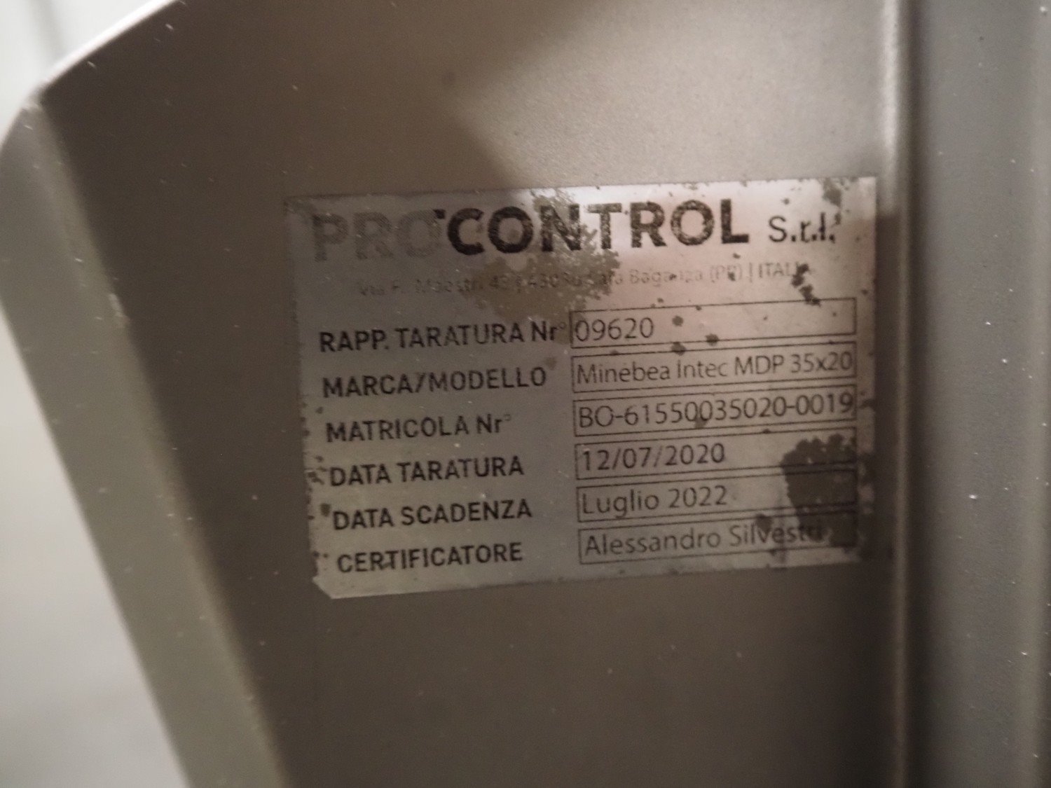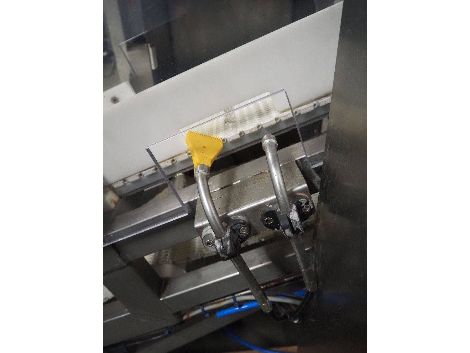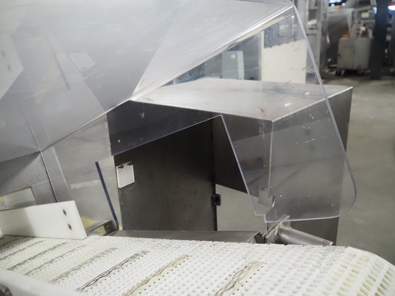 Sartorius metaldetector on elevating belt, plastic mesh belt, belt width: 304 mm, clearance: 350 mm x 160 mm, elevating height: 950 mm, total dimensions: 2900 mm x 1150 mm x 2220 mm. Incomplete.