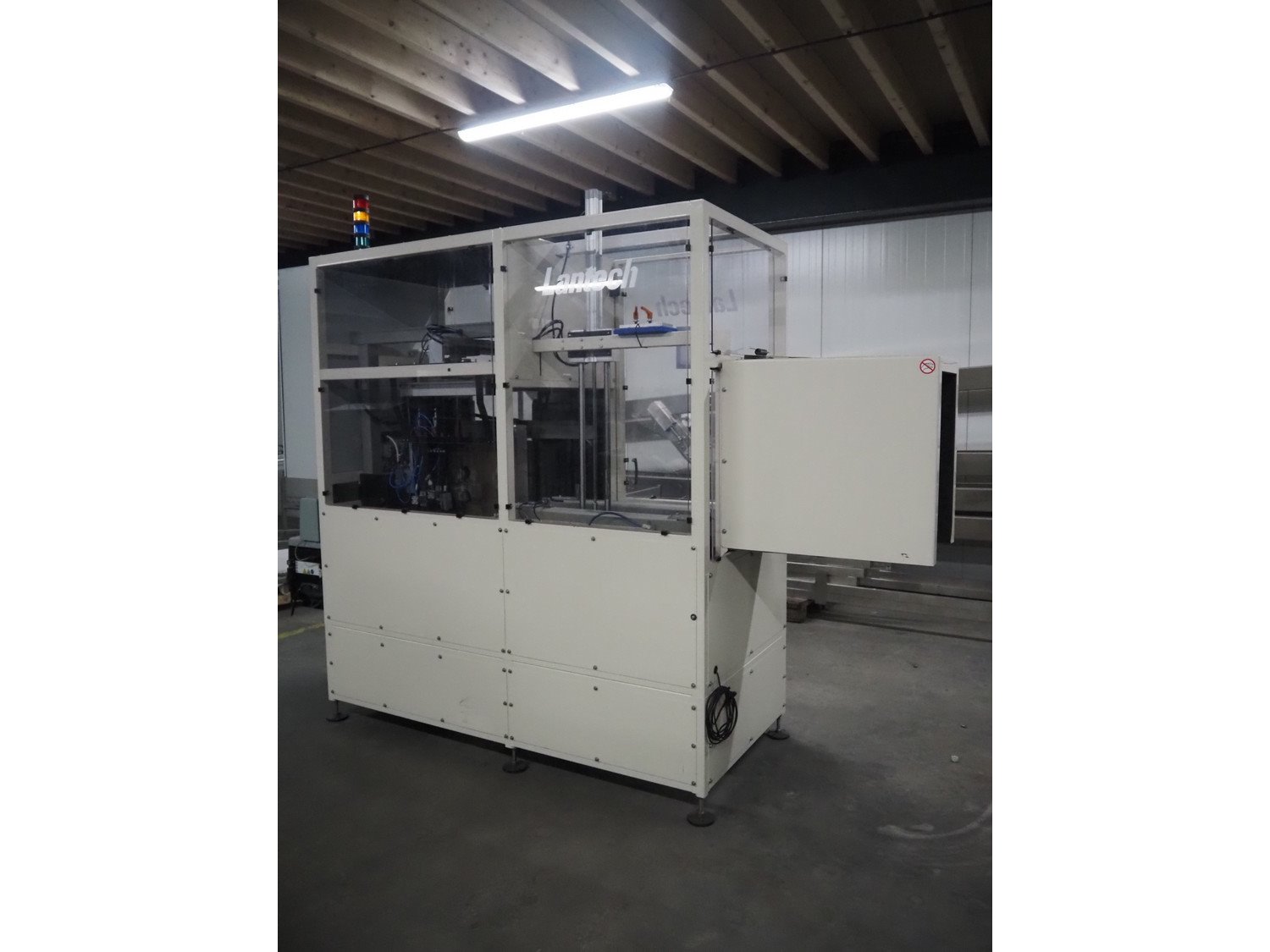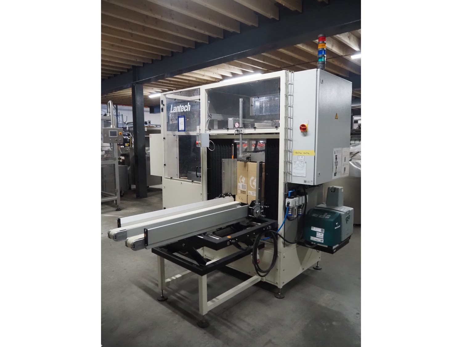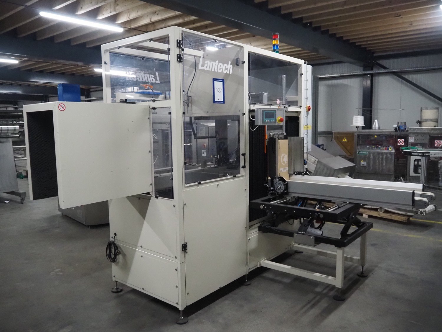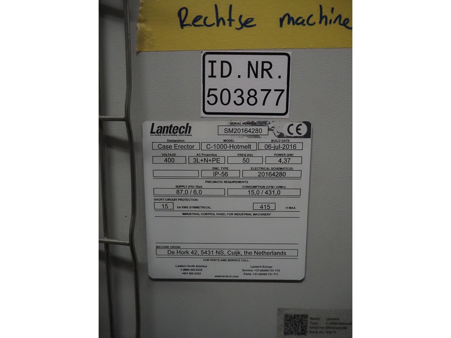 Lantech carton erecter, model C-1000-Hotmelt, serial number: SM20164280, year of construction: 06-jul-2016, 400 V, 3 Ph, 50 Hz, 4.37 kW, Robatech glue unit, type: Concept C 5/2, serial number: 11111103-001, year of construction: 2016, plastic belts, belt width: 65 mm, dimensions plano: 680 mm x 450 mm, total dimensions: 2400 mm x 2300 mm x 2600 mm.