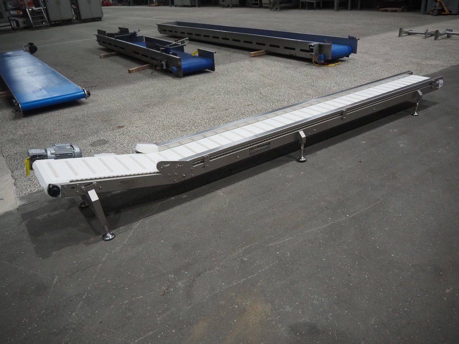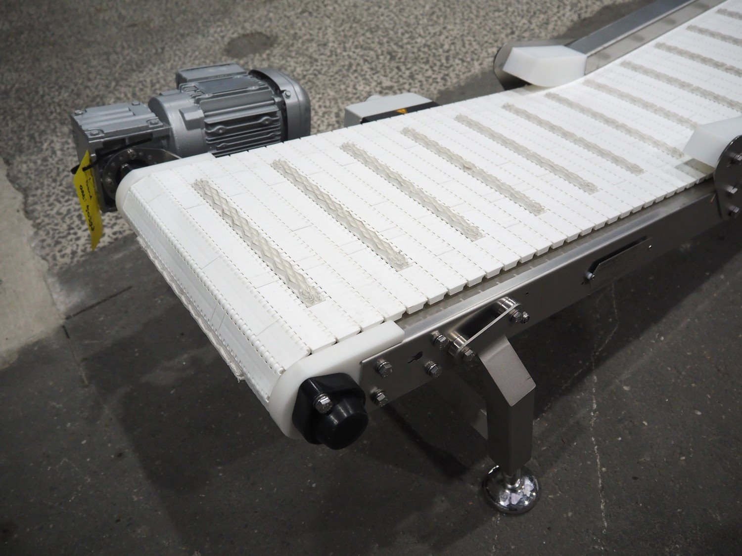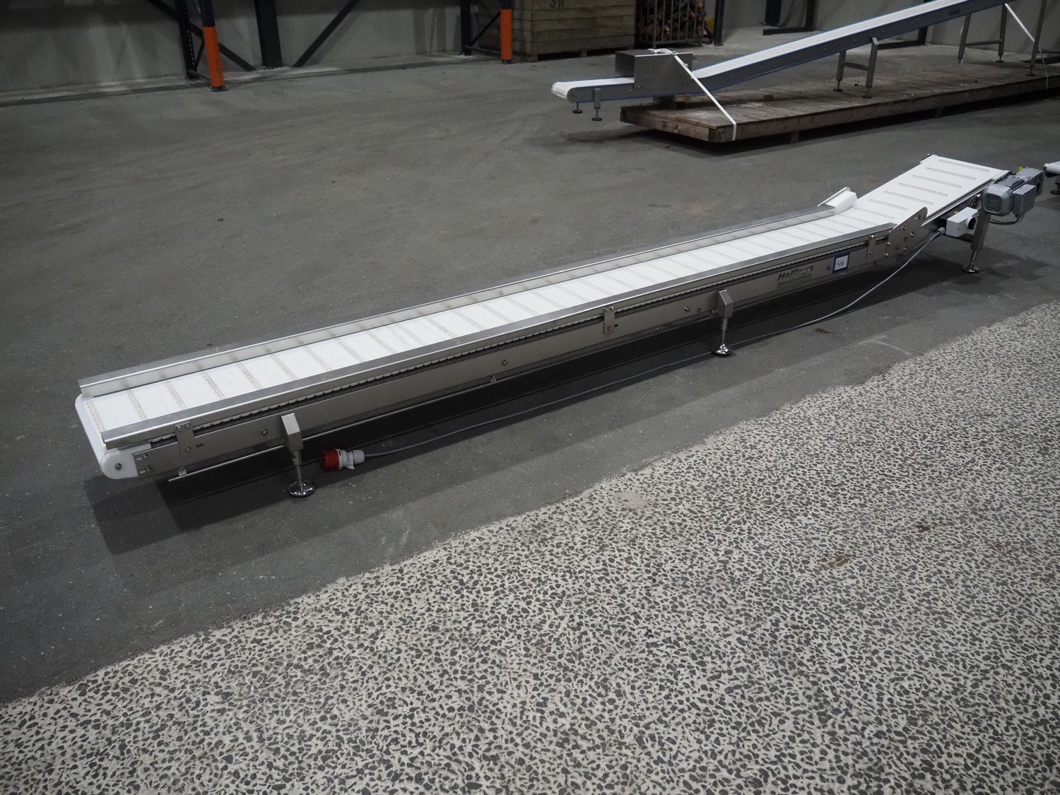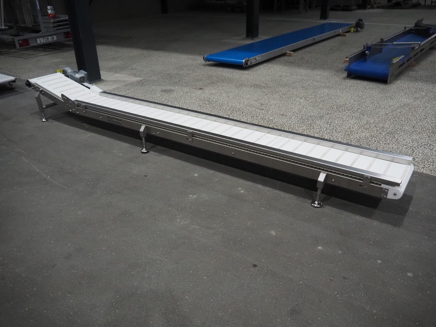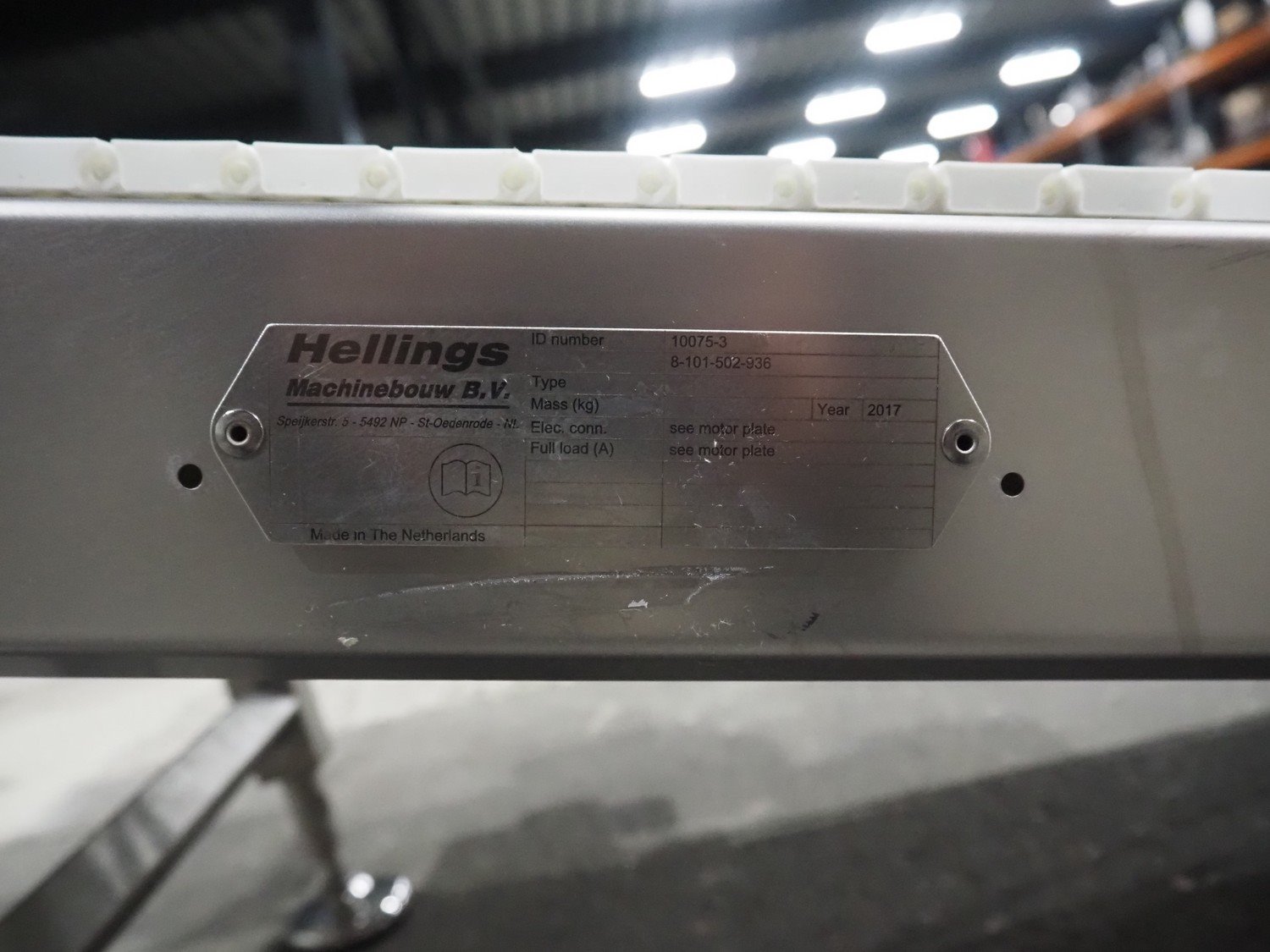 Hellings Machinebouw B.V. transport belt, year of construction: 2017, plastic belt with dividers, belt width: 370 mm, divider height: 10 mm, distance between dividers: 90 mm, total dimensions: 4150 mm x 700 mm x 500 mm.