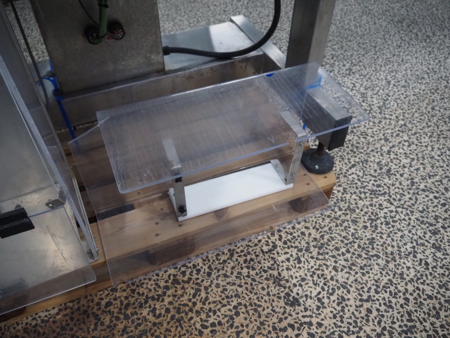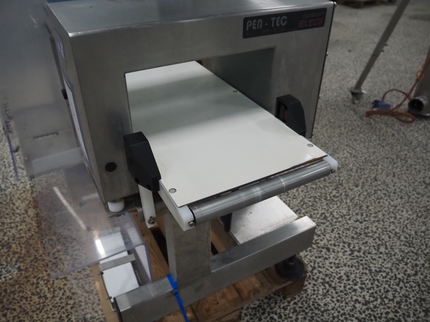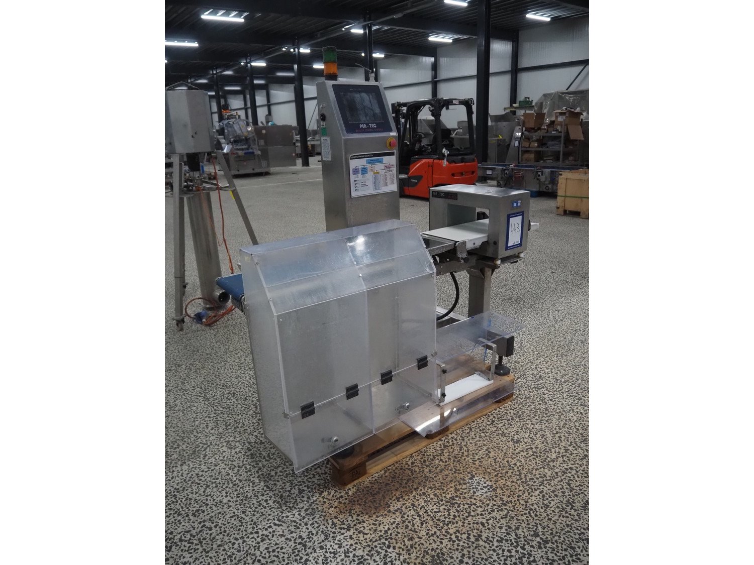 Pen-Tec metal detector with checkweigher and rejecter, model metal detector: PenTec DUAL FREQUENCY, number: 09820, clearance: 300 mm x 135 mm, plastic belt, belt width: 240 mm, model checkweigher: MSR-1200, serial number: P01215, year of construction: 2015, 230 V, 50 Hz, 4 A, maximum weight: 1200 gram, minimum weight: 50 gram, T= -750 gram, e=d= 0.5 gram, total dimensions: 1800 mm x 950 mm x 1800 mm.
