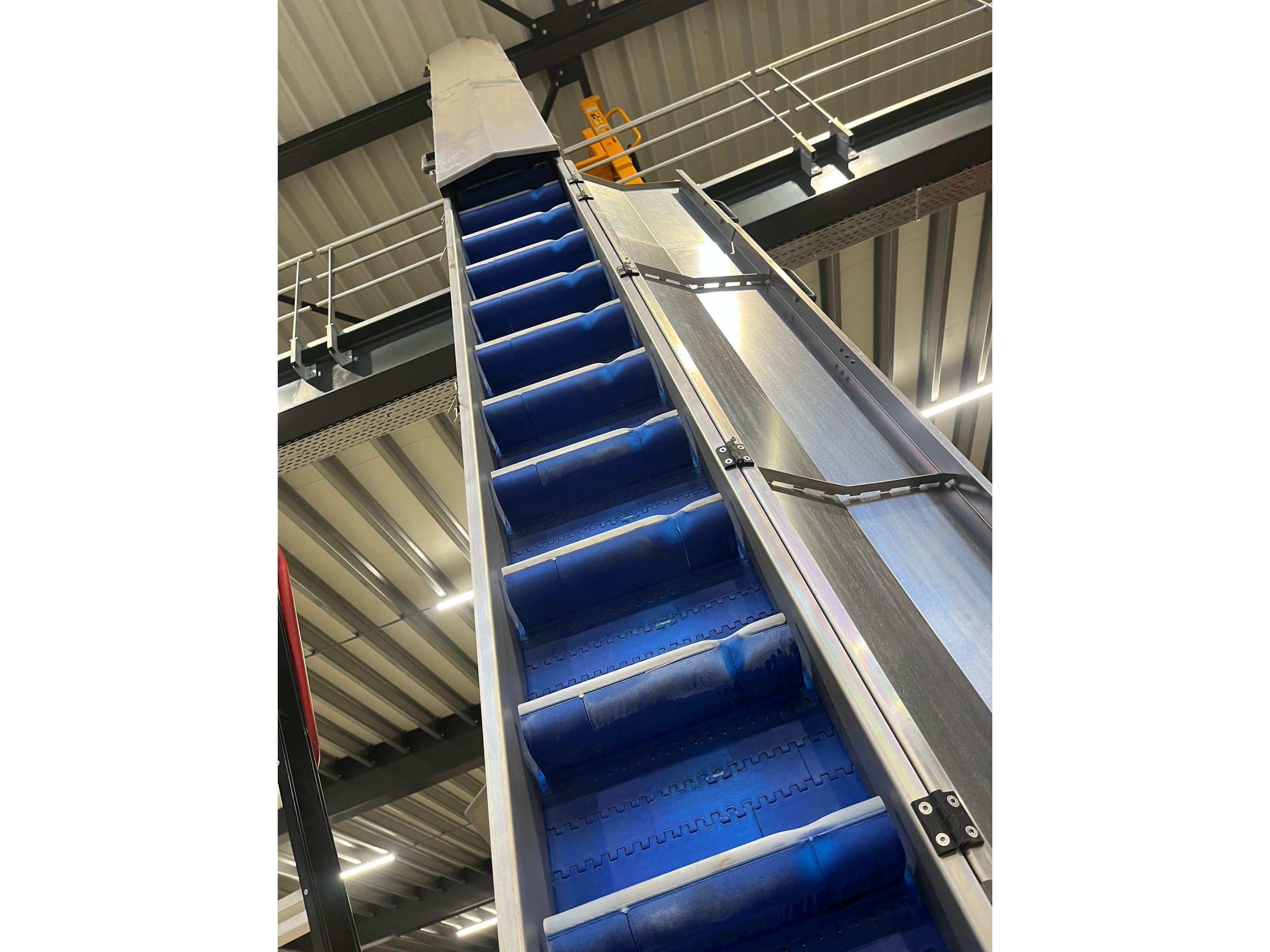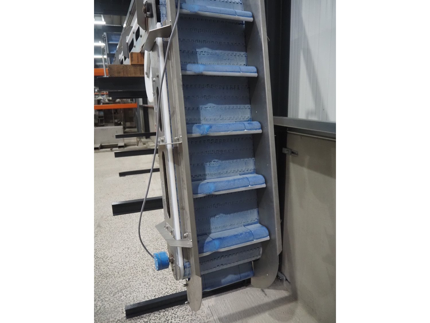 Elevating belt, plastic belt with dividers, belt width: 380 mm, divider height: 110 mm, distance between dividers: 200 mm, elevating height: 7200 mm, total dimensions: 3000 mm x 650 mm x 7400 mm.