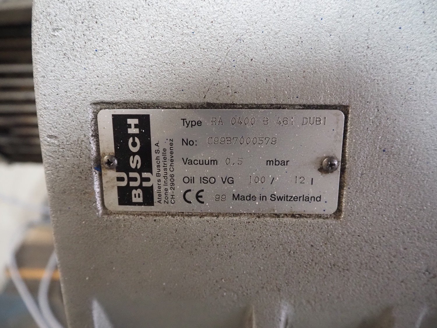 Busch vacuum pump, type: RA 0400 B 461 DUBI, number: C9937000579, capacity: 400 m³ per hour, dimensions: 1300 mm x 850 mm x 1400 mm.