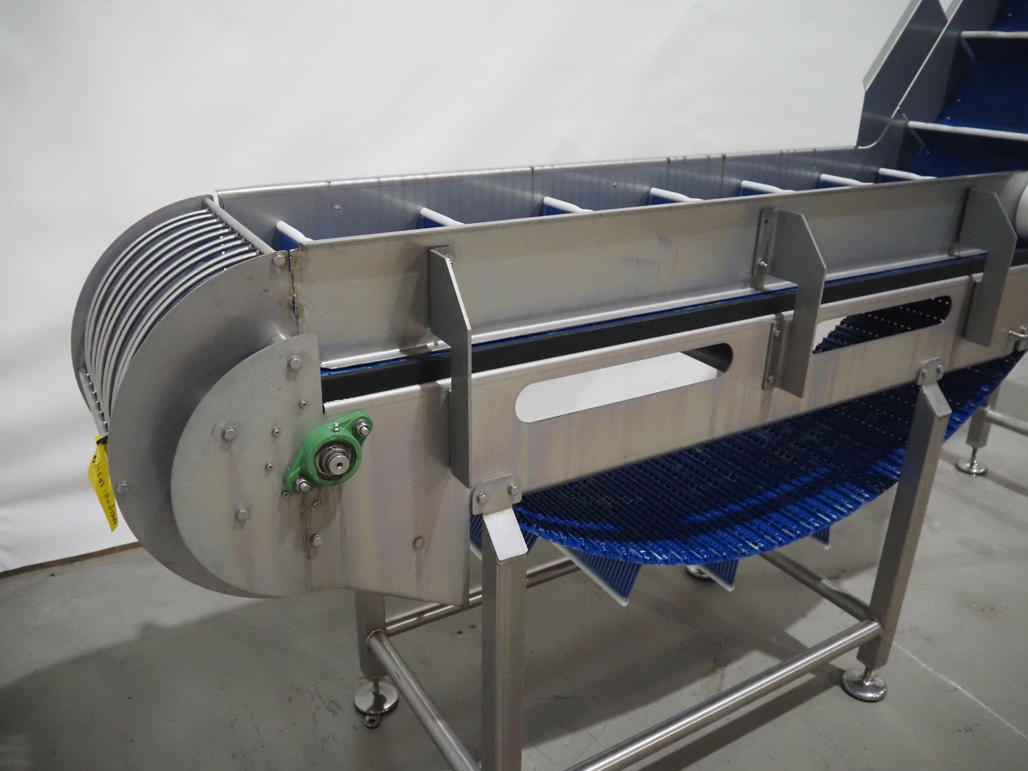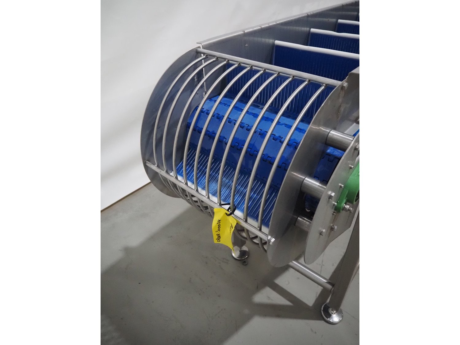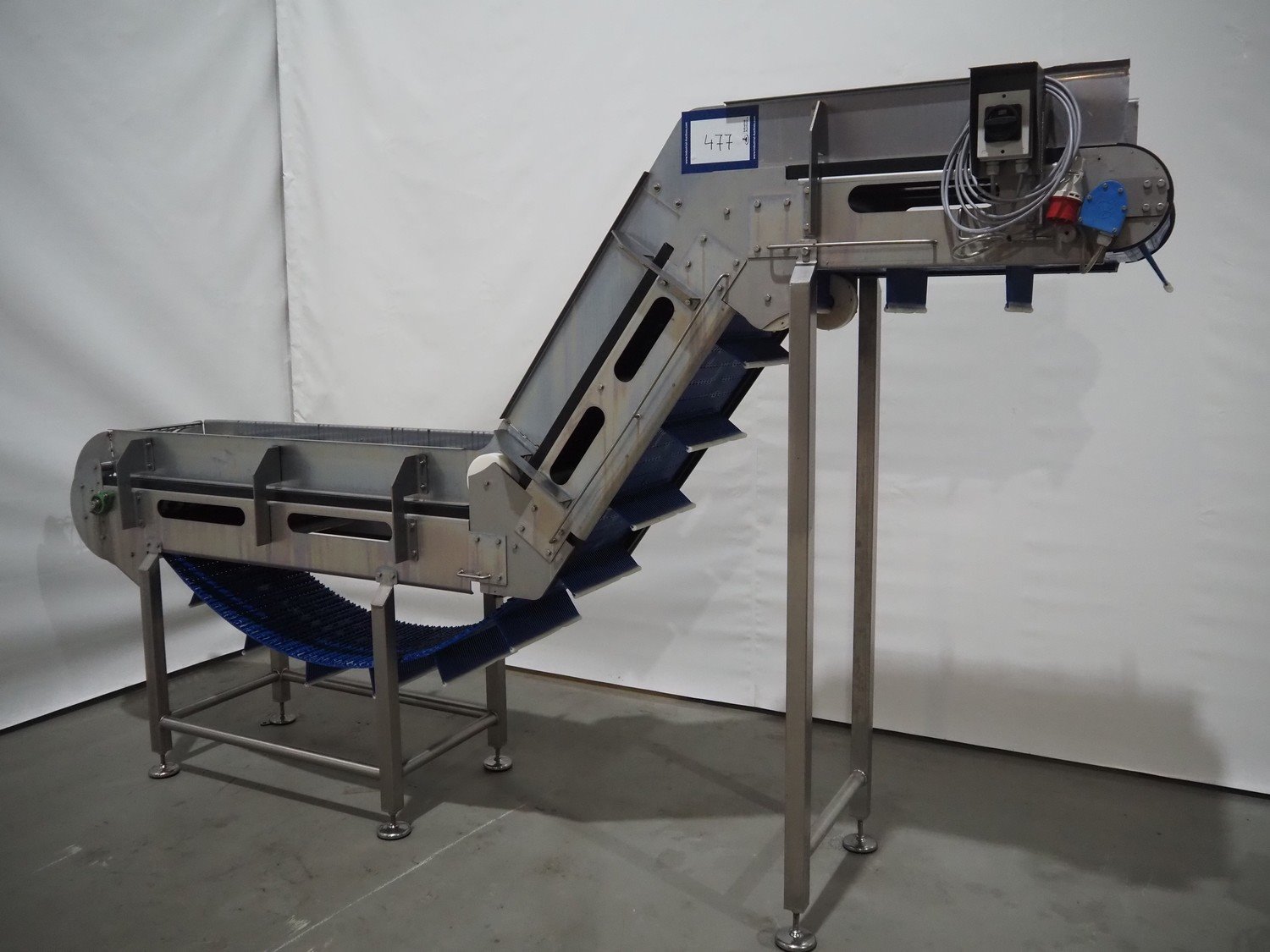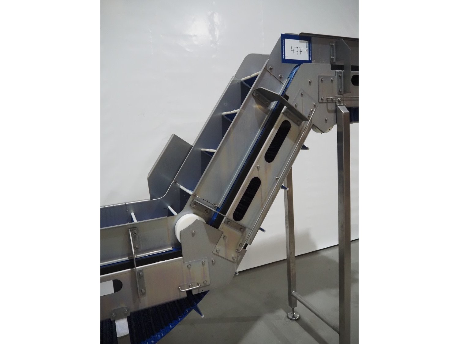 Elevating belt, s/s frame, plastic belt with dividers, belt width: 400 mm, distance between dividers: 250 mm, divider height: 100 mm, elevating height: 1800 mm, total dimensions: 3600 mm x 600 mm x 2000 mm.