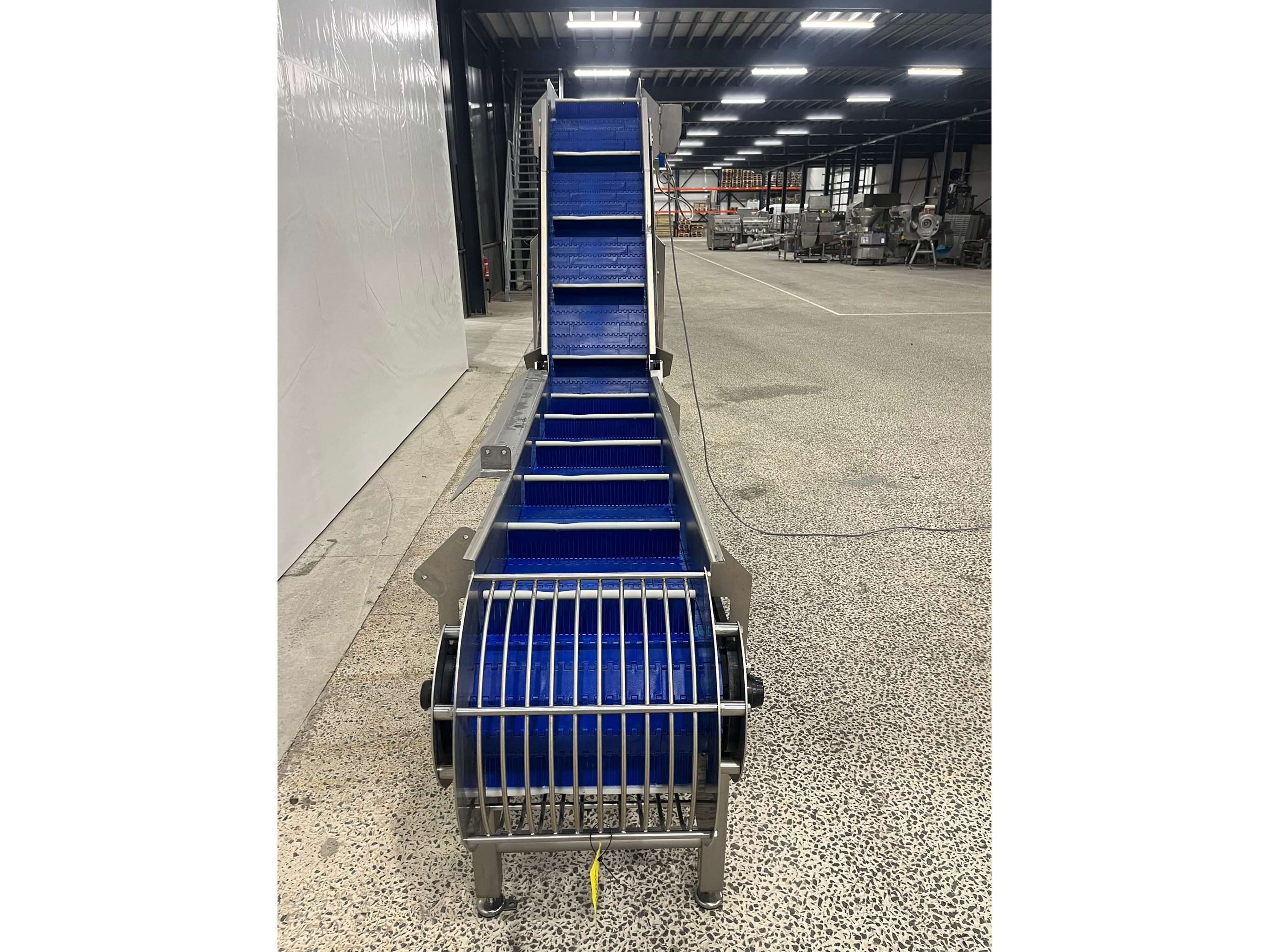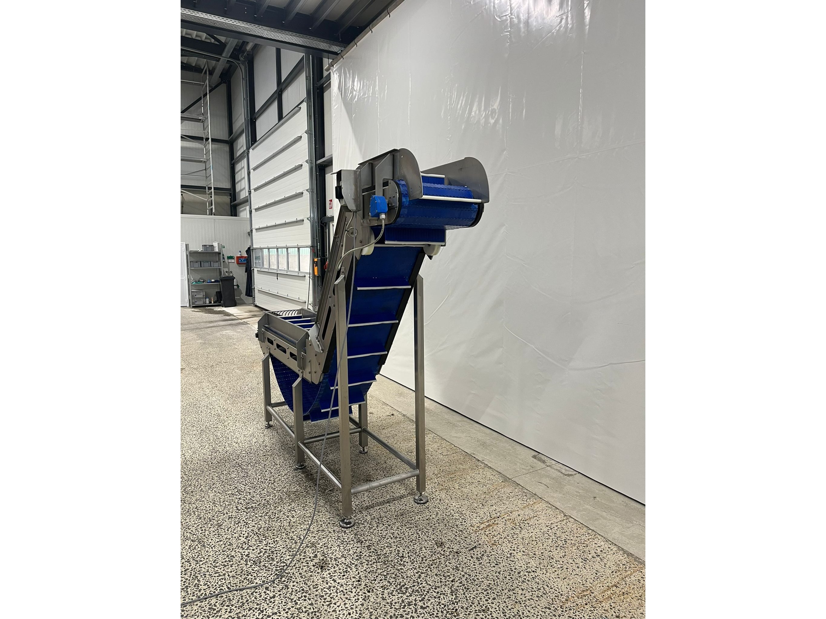Elevating belt, s/s frame, plastic belt with dividers, belt width: 400 mm, divider height: 100 mm, elevating height: 1900 mm, total dimensions: 3200 mm x 650 mm x 2200 mm.