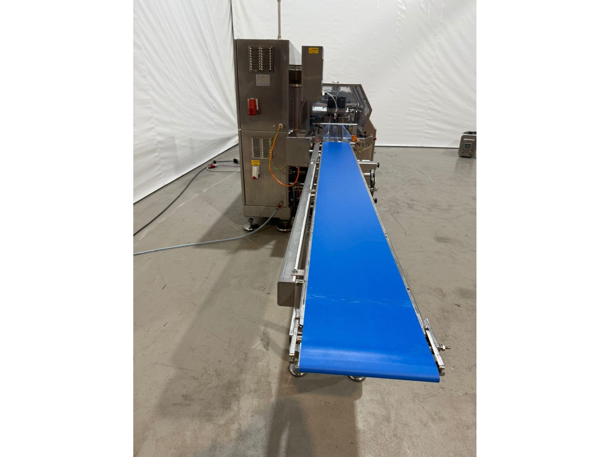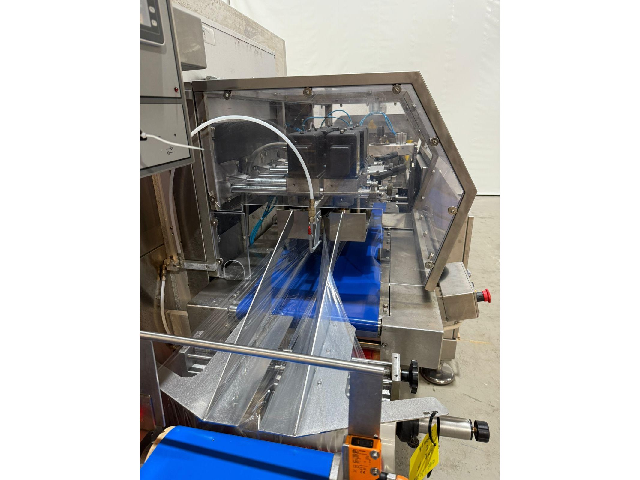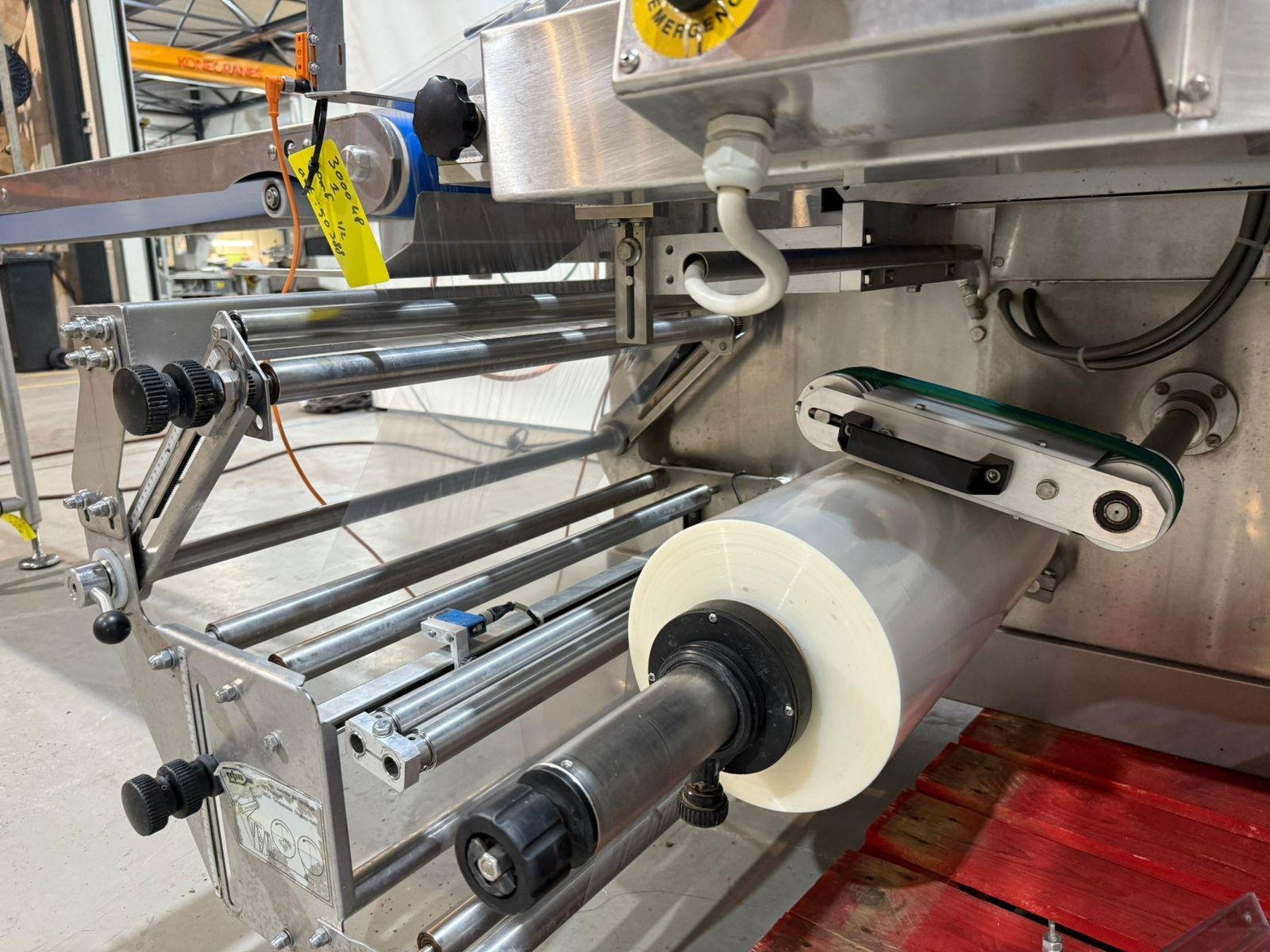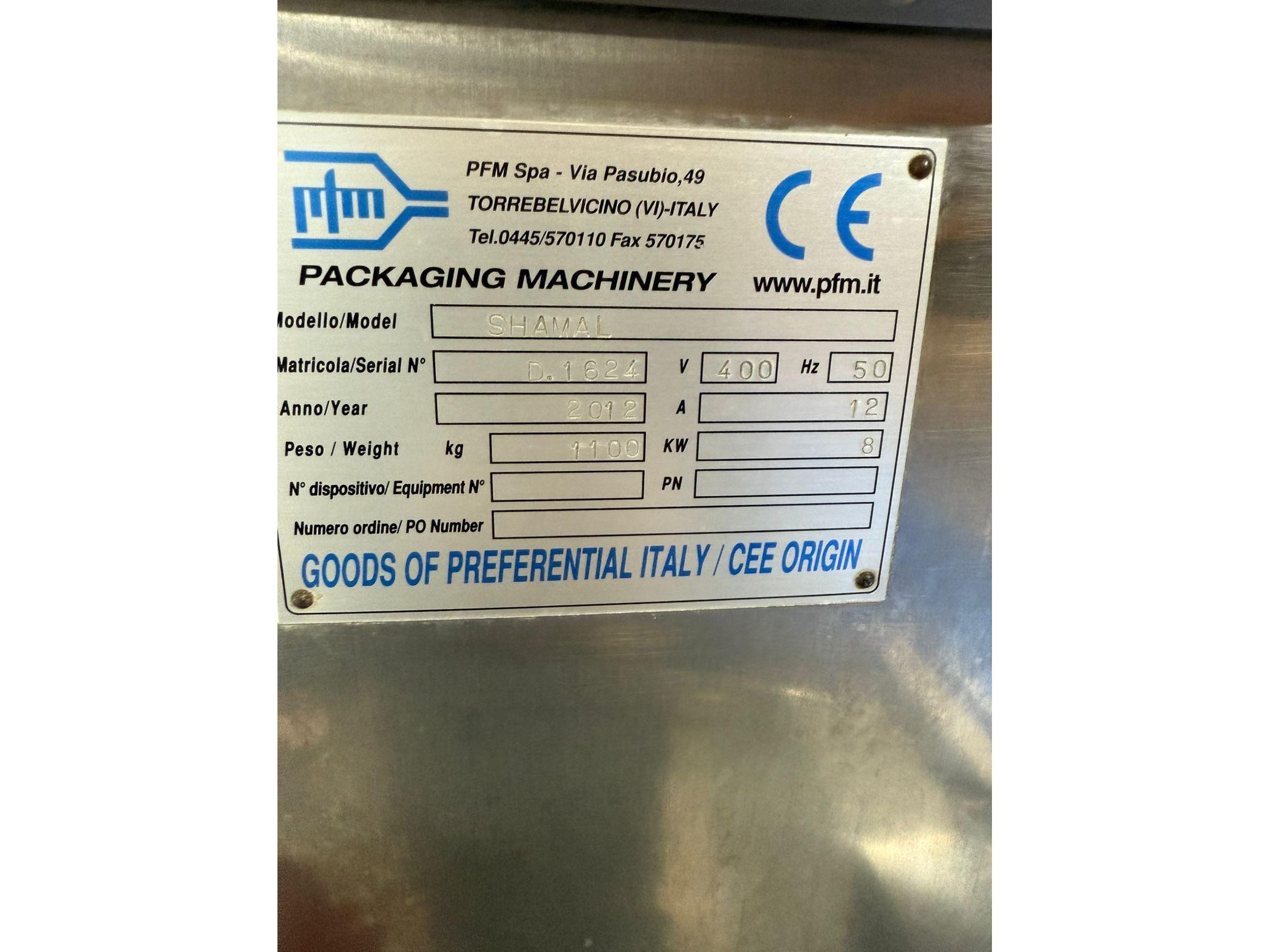 PFM flowpacker with Smipack shrink tunnel, model: Shamal, serial number: D.1624, year of construction: 2012, 400 V, 50 Hz, 12 A, 8 kW, 1100 kg, plastic belt, belt width: 250 mm, seal width: 340 mm, total dimensions flowpacker: 5400 mm x 1500 mm x 1600 mm, type Smipack: T452, serial number: 80237, year of construction: 2021, 380-415 V, 50-60 Hz, 19 A, 12750 W, total dimensions shrink tunnel: 1800 mm x 800 mm x 1500 mm.