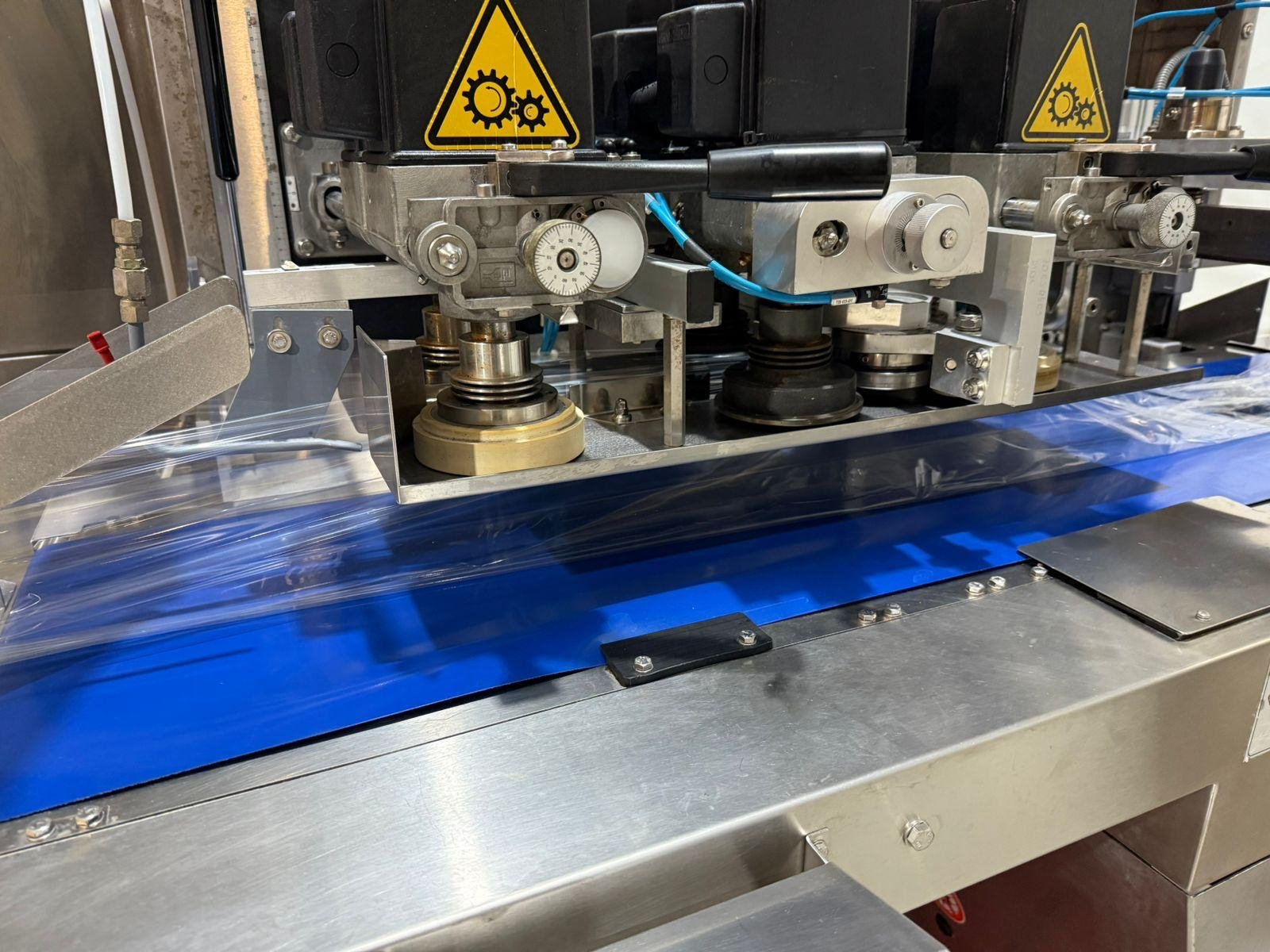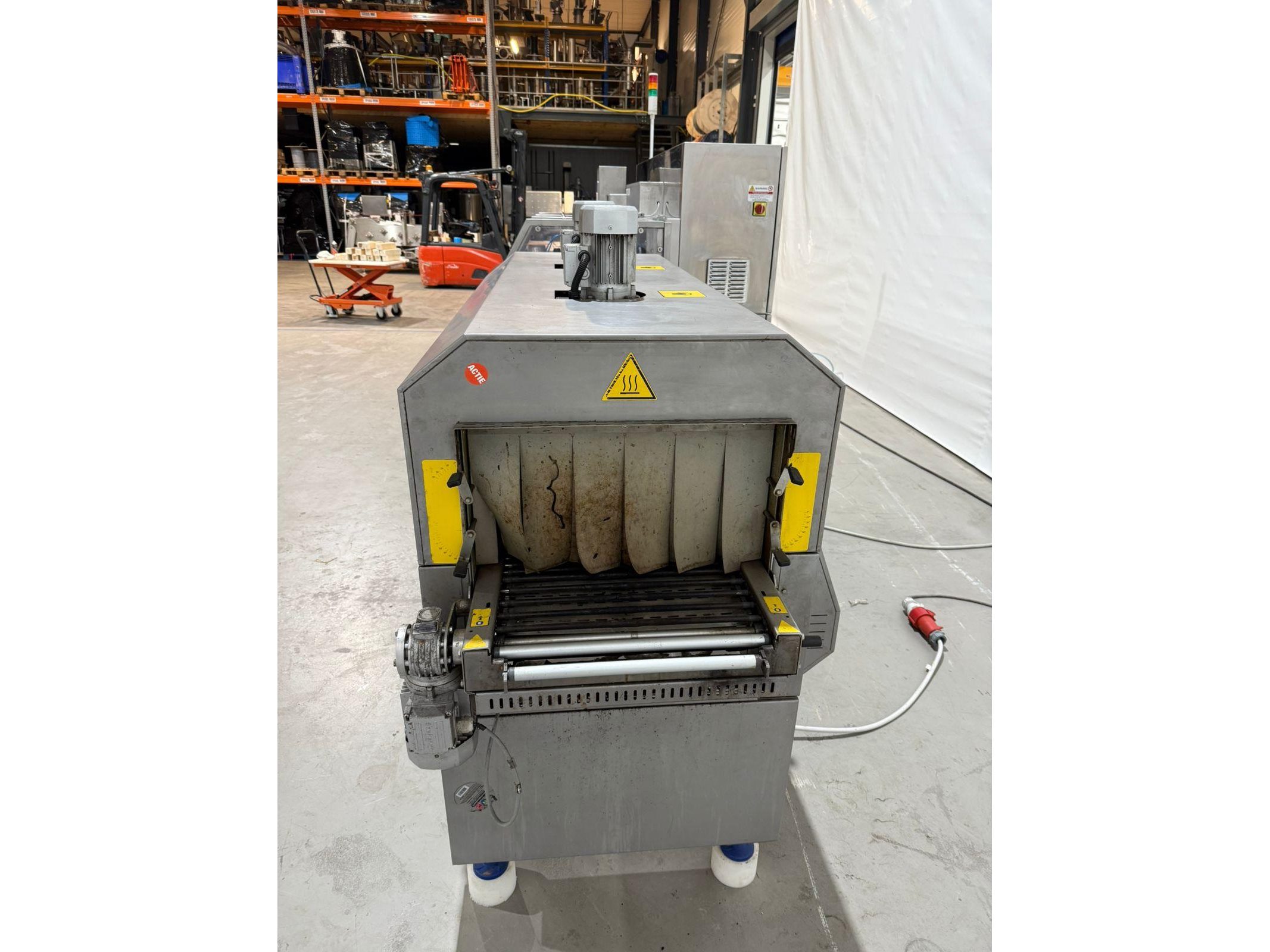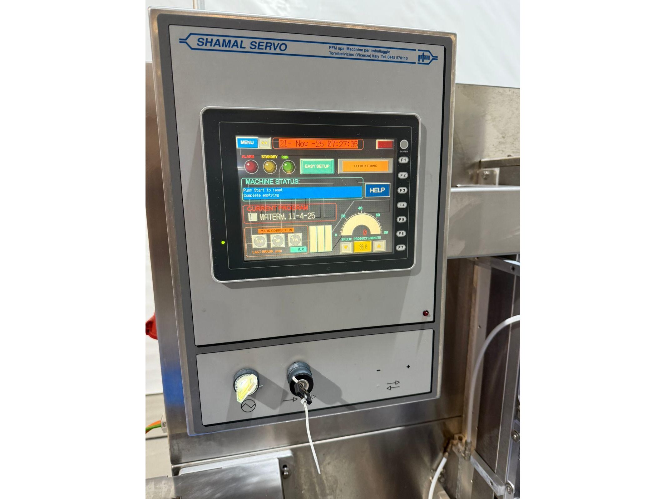 PFM flowpacker with Smipack shrink tunnel, model: Shamal, serial number: D.1624, year of construction: 2012, 400 V, 50 Hz, 12 A, 8 kW, 1100 kg, plastic belt, belt width: 250 mm, seal width: 340 mm, total dimensions flowpacker: 5400 mm x 1500 mm x 1600 mm, type Smipack: T452, serial number: 80237, year of construction: 2021, 380-415 V, 50-60 Hz, 19 A, 12750 W, total dimensions shrink tunnel: 1800 mm x 800 mm x 1500 mm.