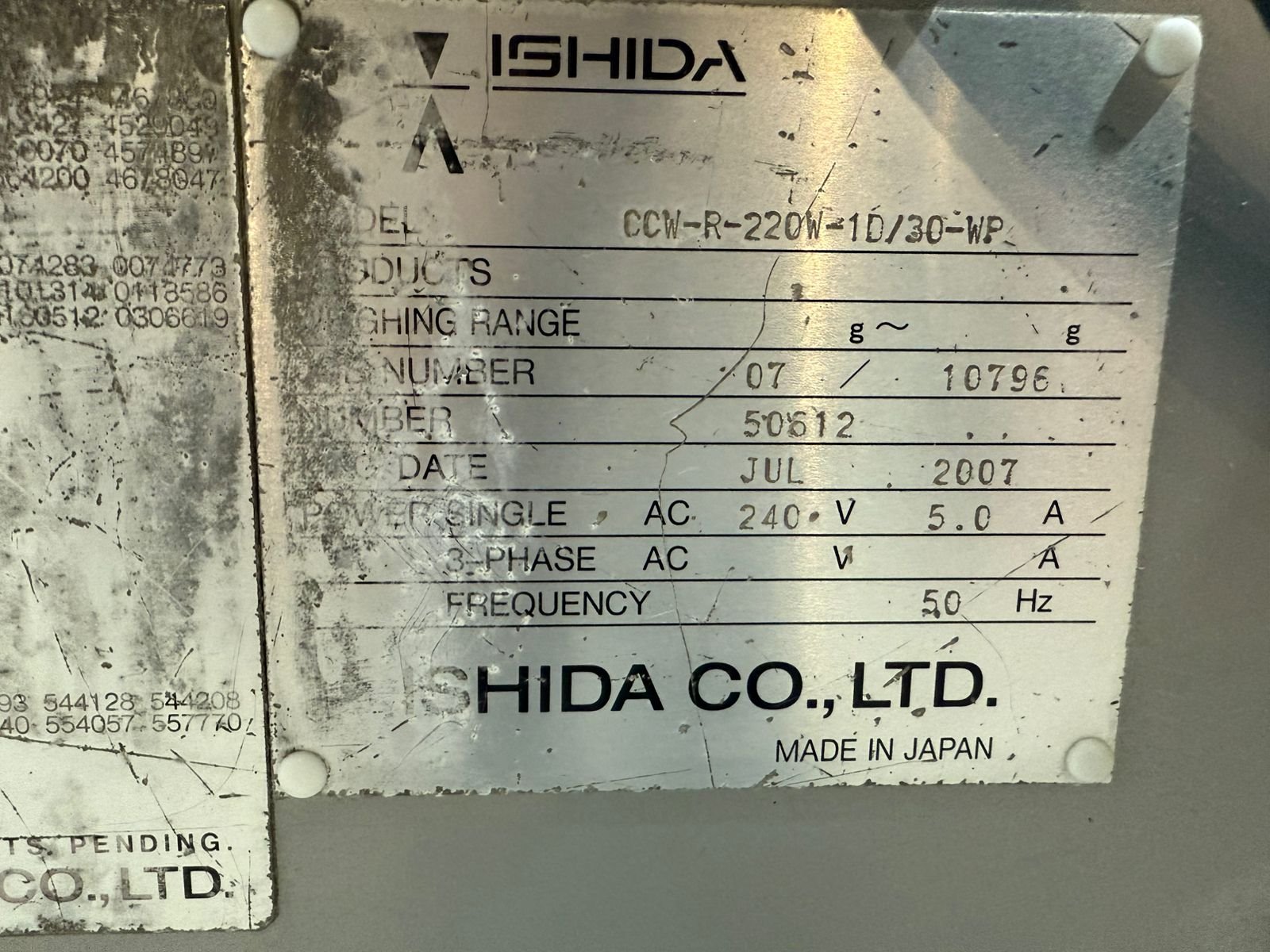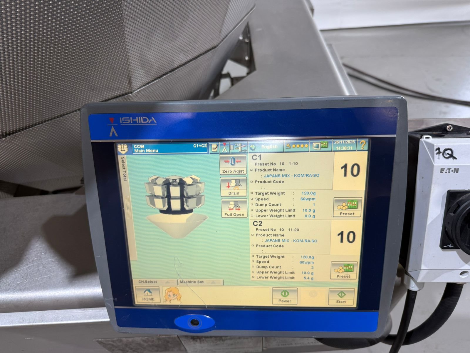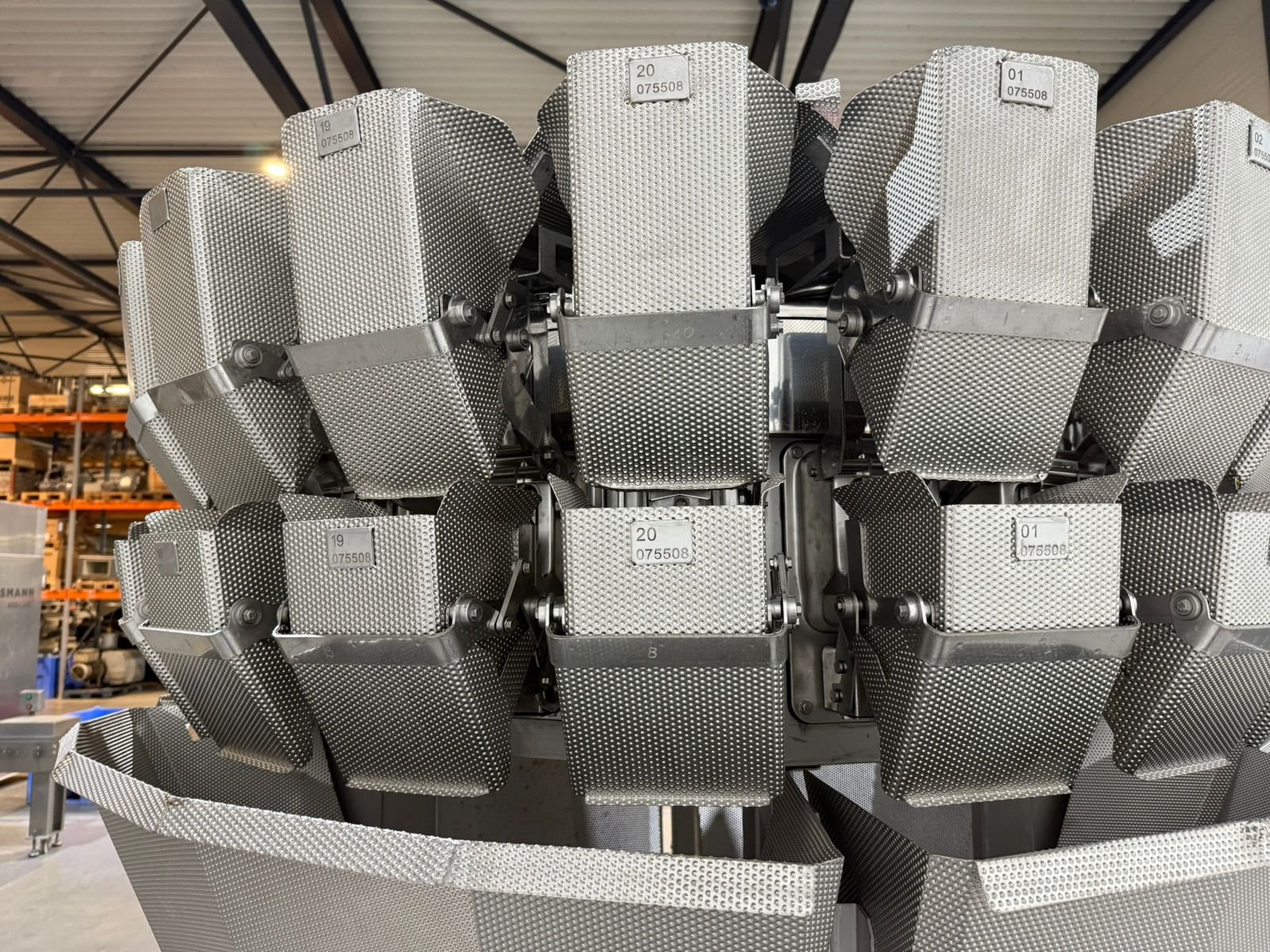 Ishida 20 heads multihead weigher, model: CCW-R-220W-1D/30-WP, number: 50612, year of construction: July 2007, 240 V, 50 Hz, 5.0 A, capacity per bucket: 800 gram, dimensions: 1600 mm x 1600 mm x 2400 mm.