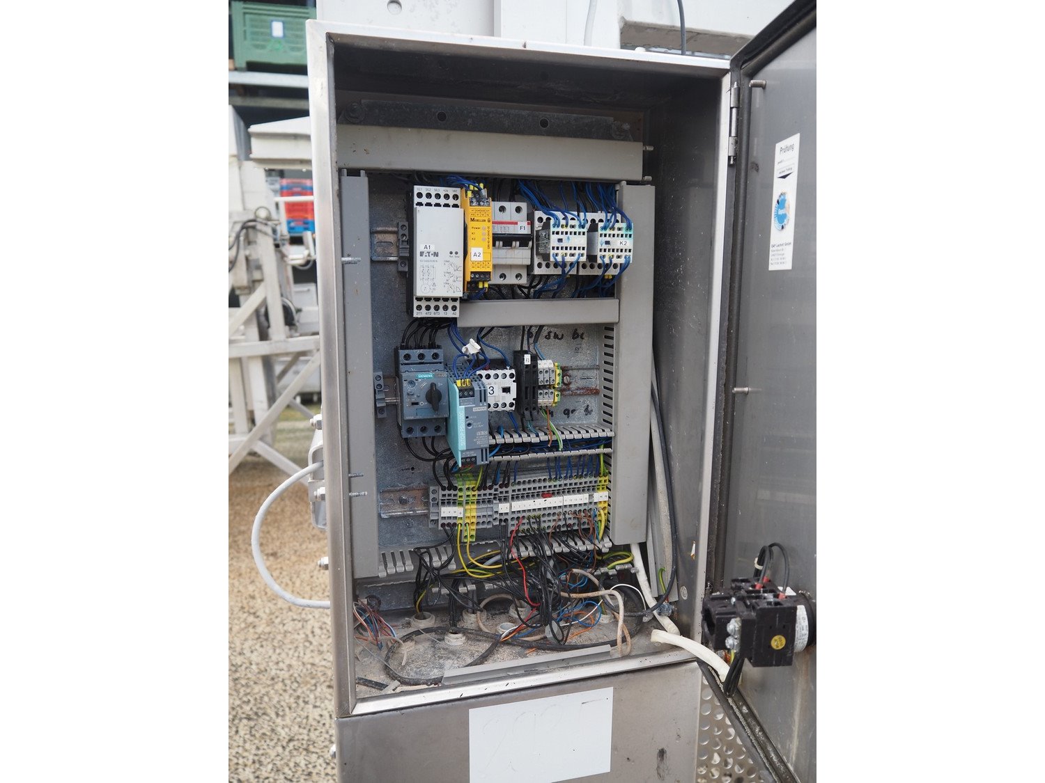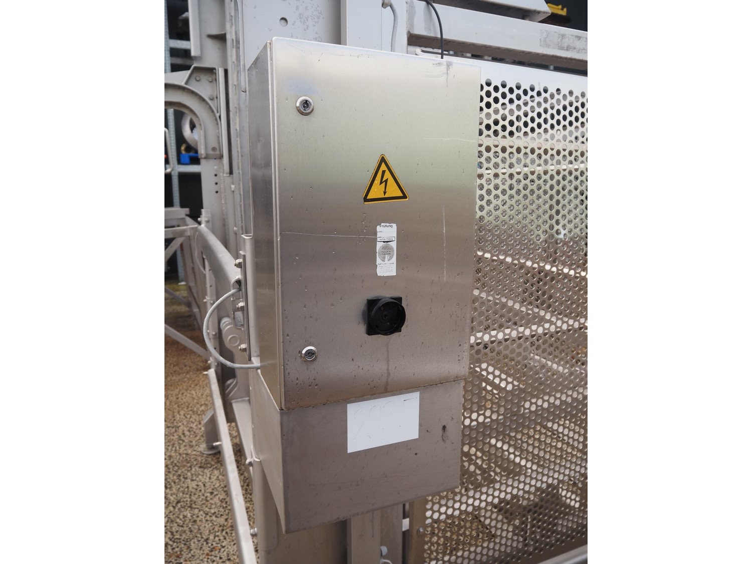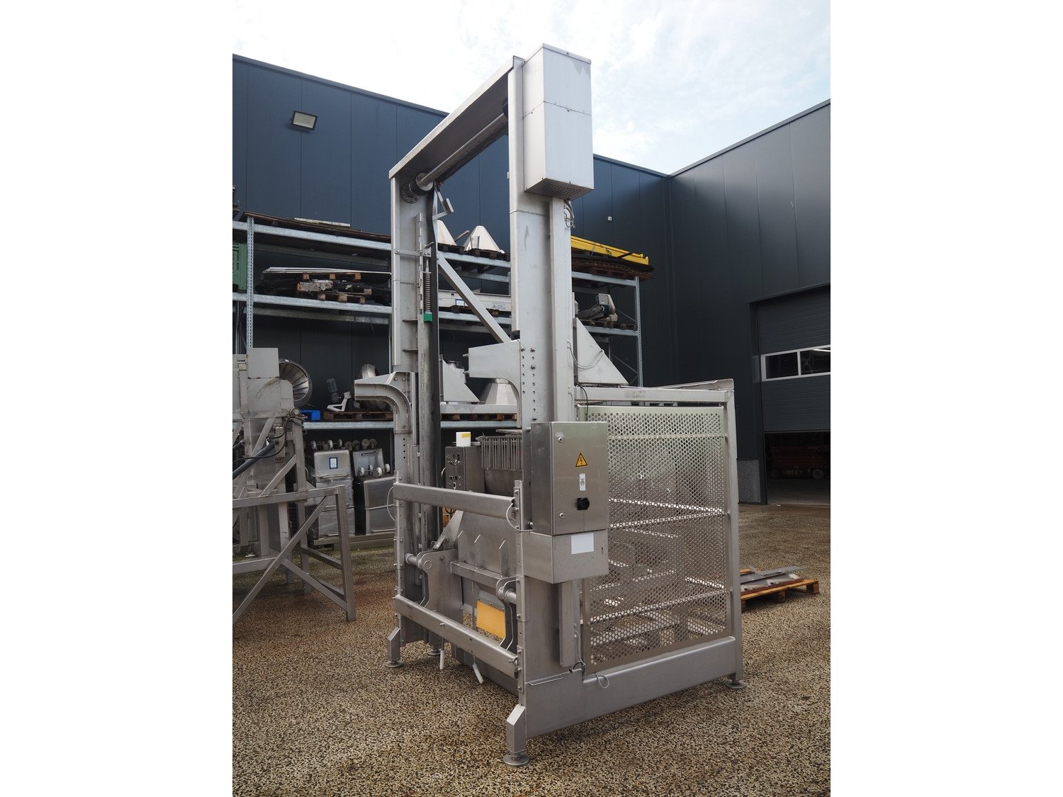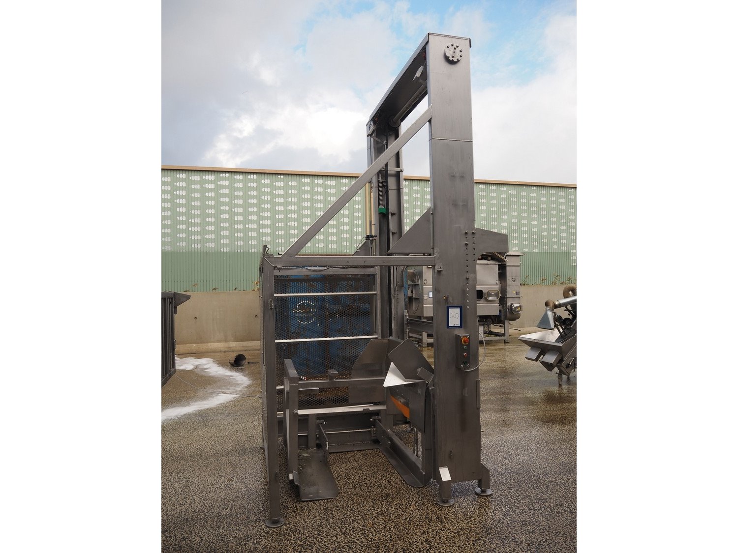 Syspal lifter for 200 liter meat bins, type: GE100-1018, serial number: K3574-2, year of construction: 2011, safe working load: 200 kg, lifting height: 2650 mm, total dimensions: 1150 mm x 1150 mm x 4170 mm. Damaged.