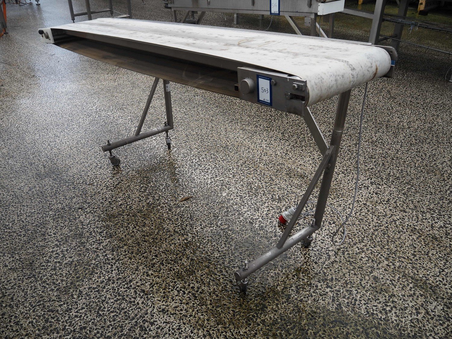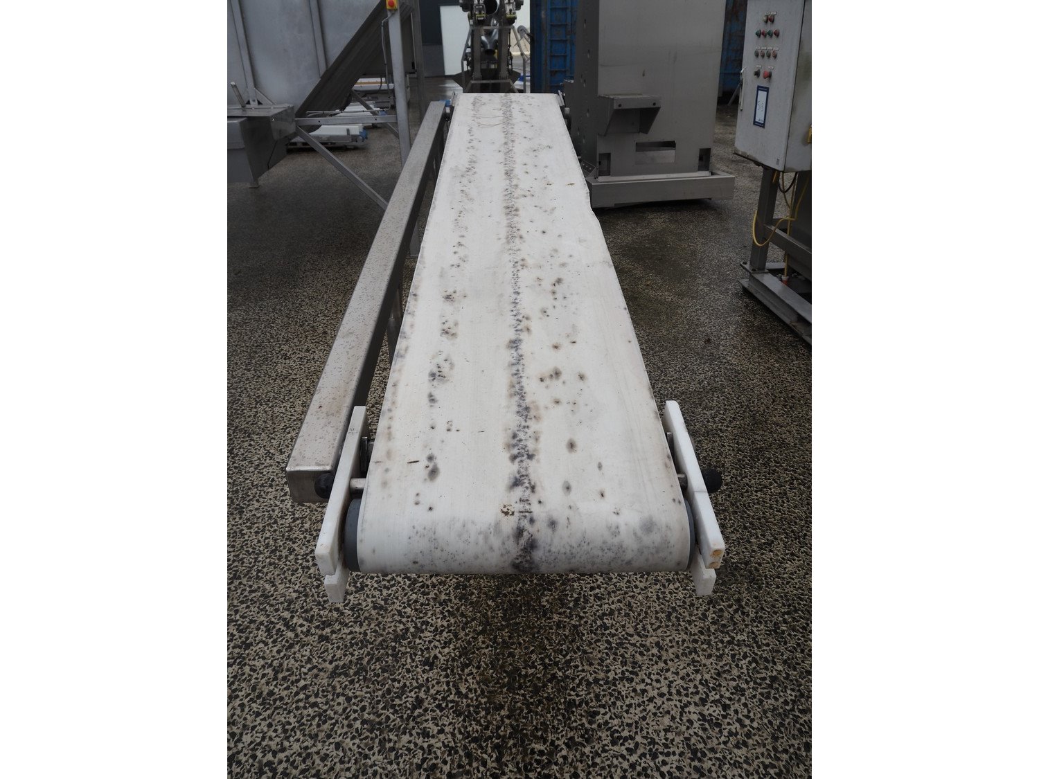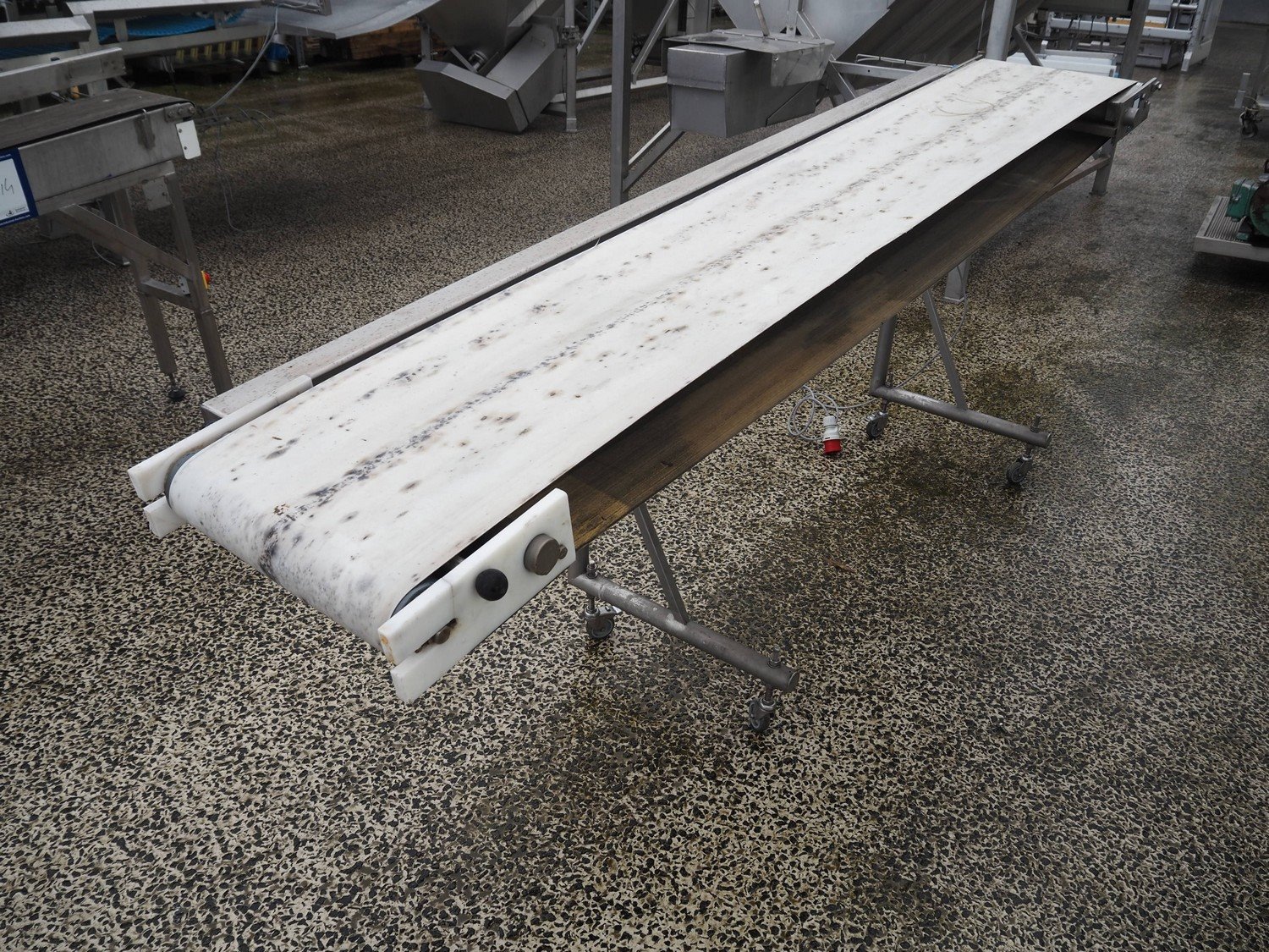Mobile elevating belt, s/s frame, plastic belt, belt width: 485 mm, elevating height: 1300 mm, total dimensions: 3000 mm x 700 mm x 1300 mm.