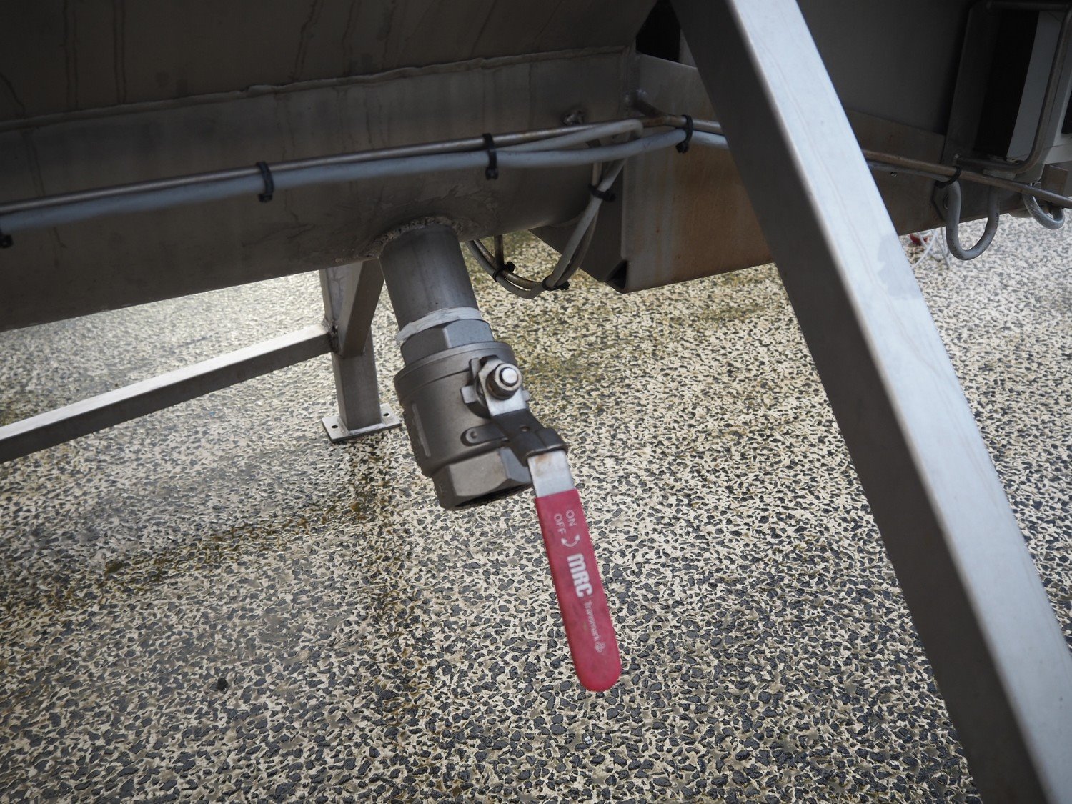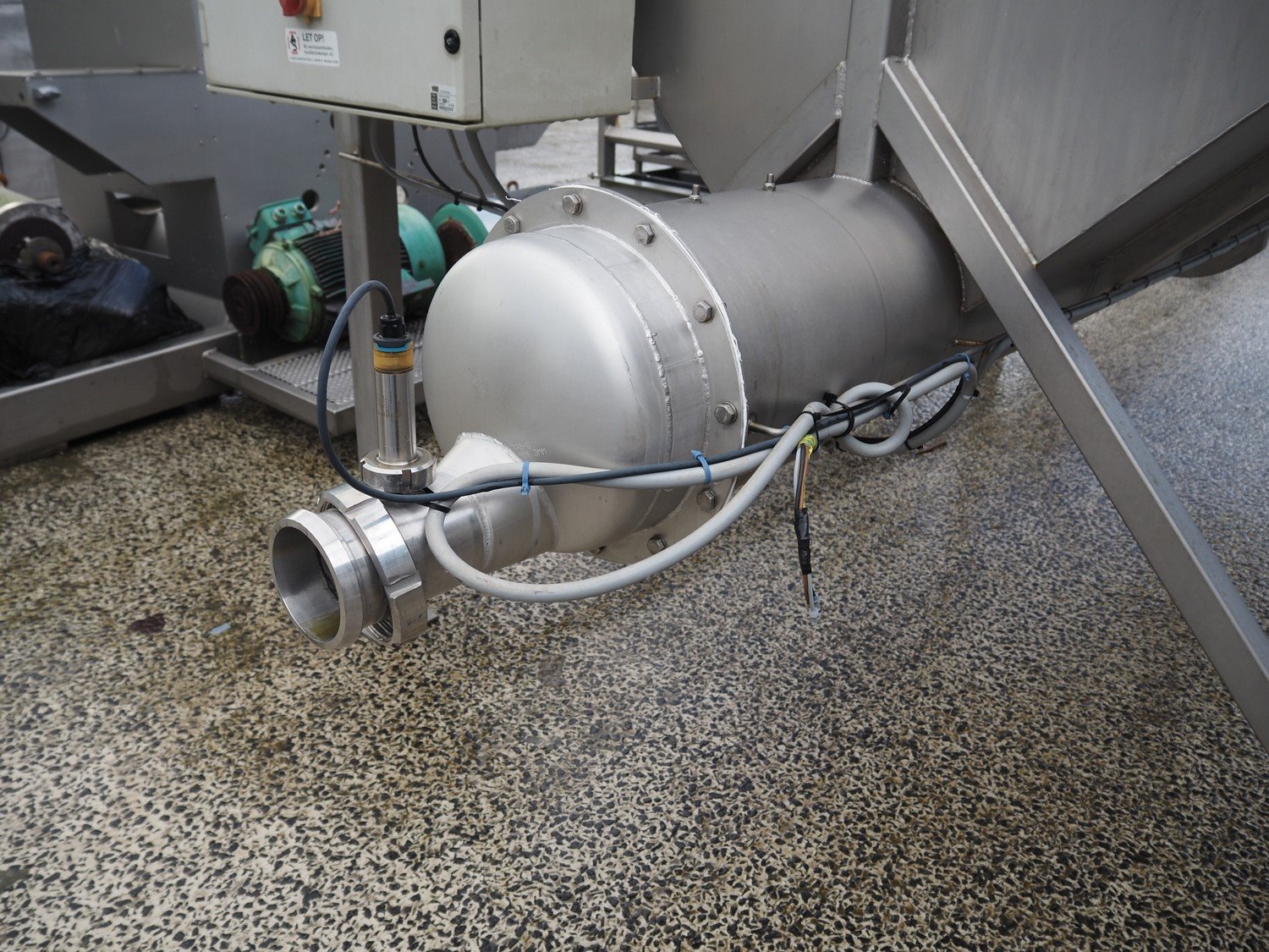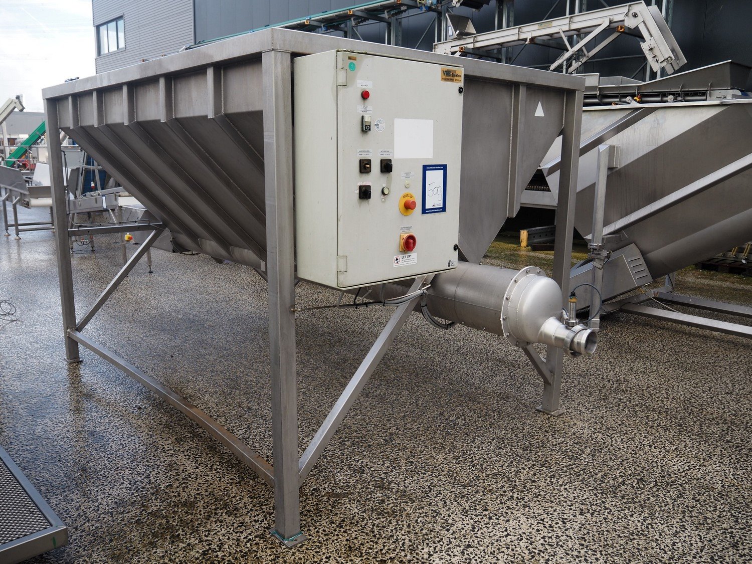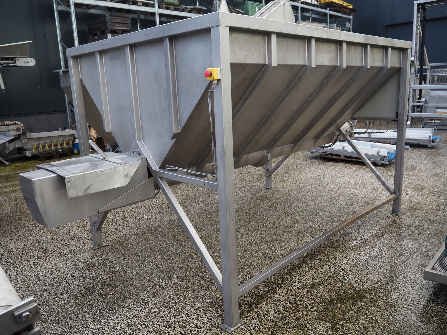 S/s infeed bunker with outfeed screw, dimensions outfeed: Ø 100 mm, inside dimensions: 3000 mm x 2000 mm x 1000 mm, total dimensions: 5000 mm x 2150 mm x 2100 mm.