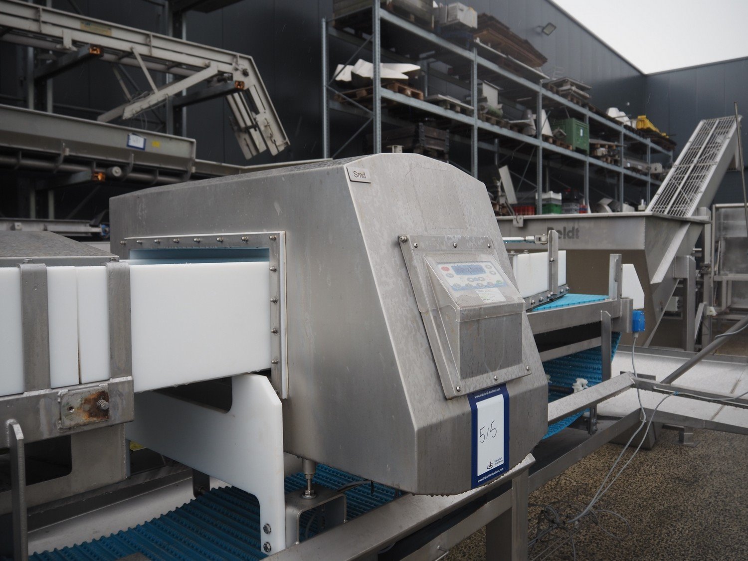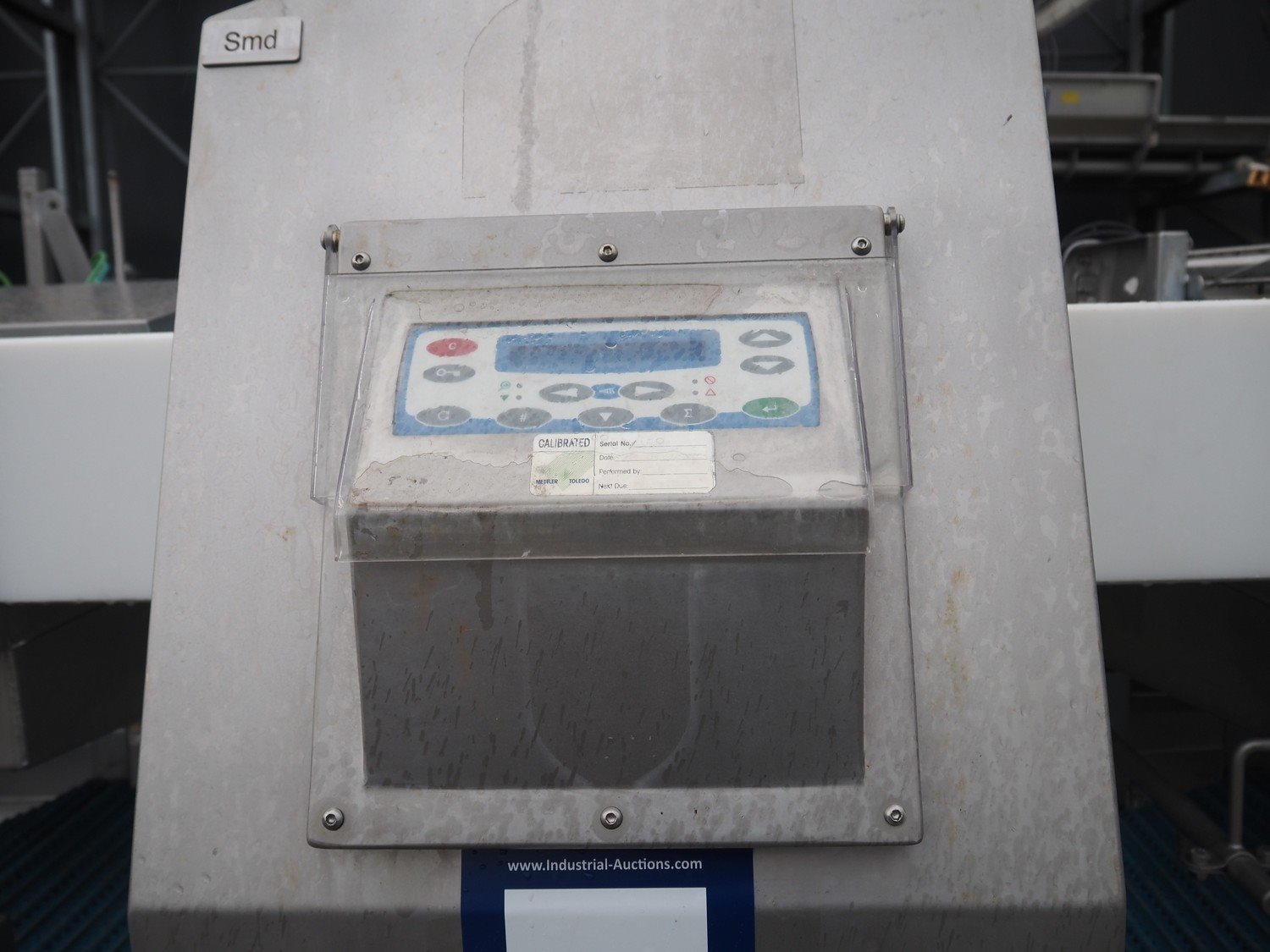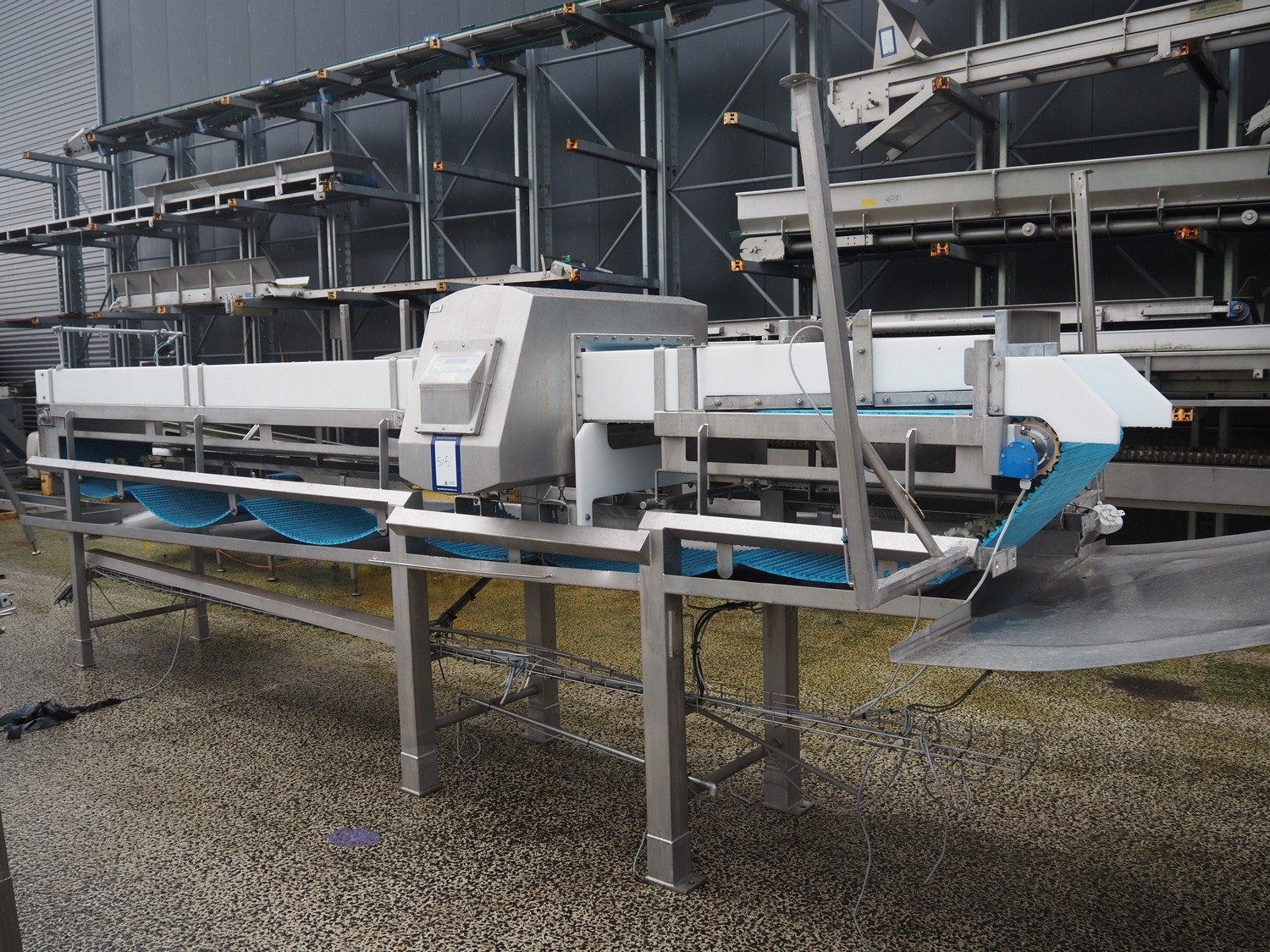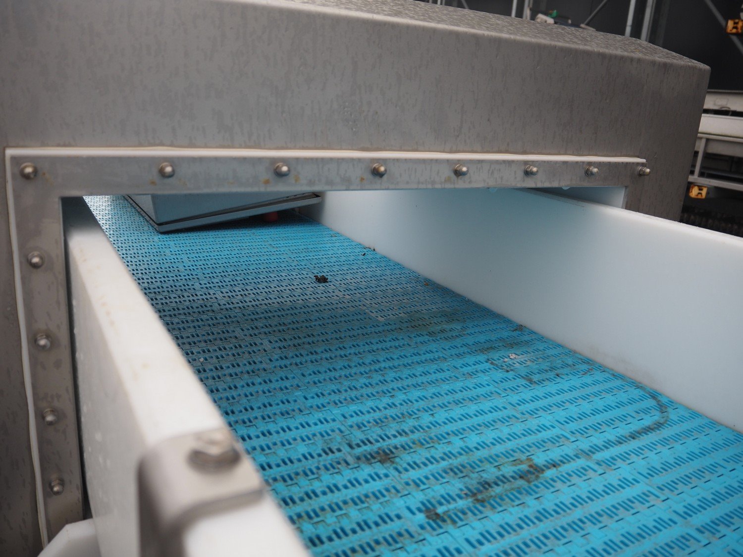 Loma metal detector with rejector, serial number: MH308-100001D, 230 V, 1 Ph, 50 Hz, 0.3 A, year of construction: 2009, plastic mesh belt, belt width: 570 mm, total dimensions: 6800 mm x 1900 mm x 2350 mm.