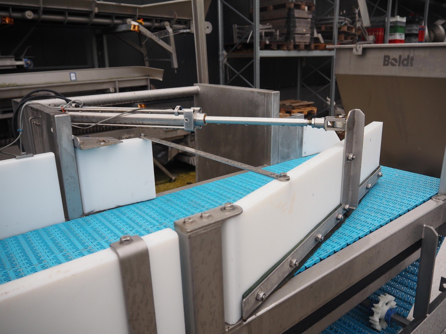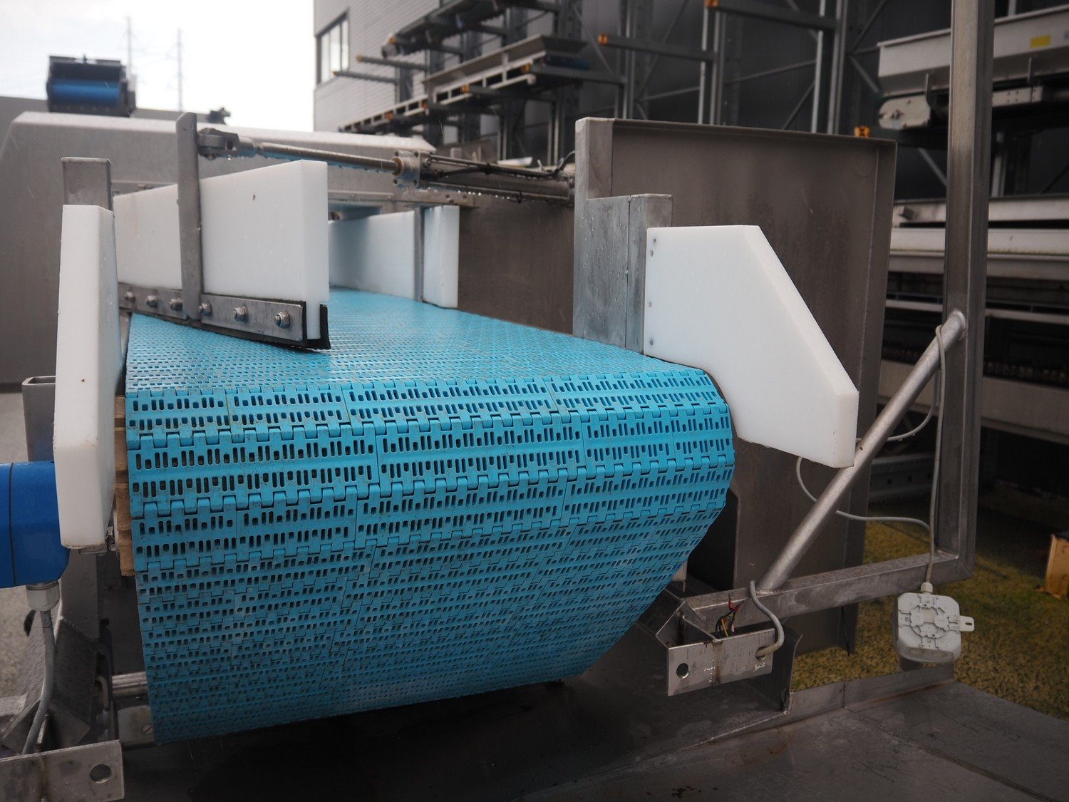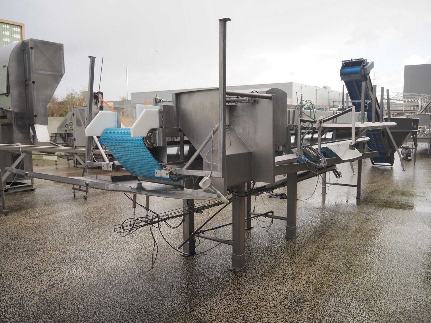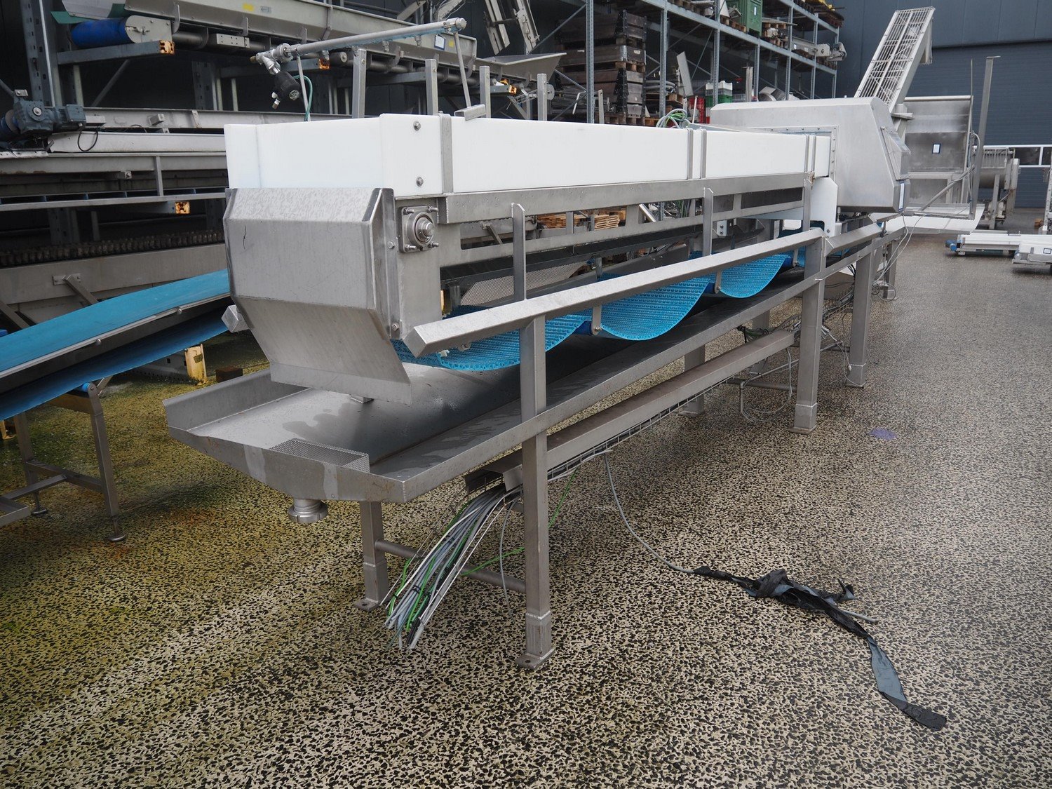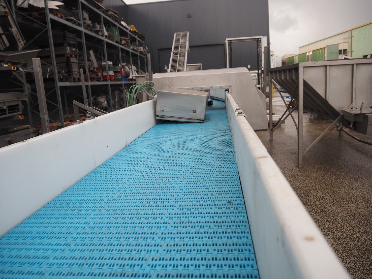 Loma metal detector with rejector, serial number: MH308-100001D, 230 V, 1 Ph, 50 Hz, 0.3 A, year of construction: 2009, plastic mesh belt, belt width: 570 mm, total dimensions: 6800 mm x 1900 mm x 2350 mm.