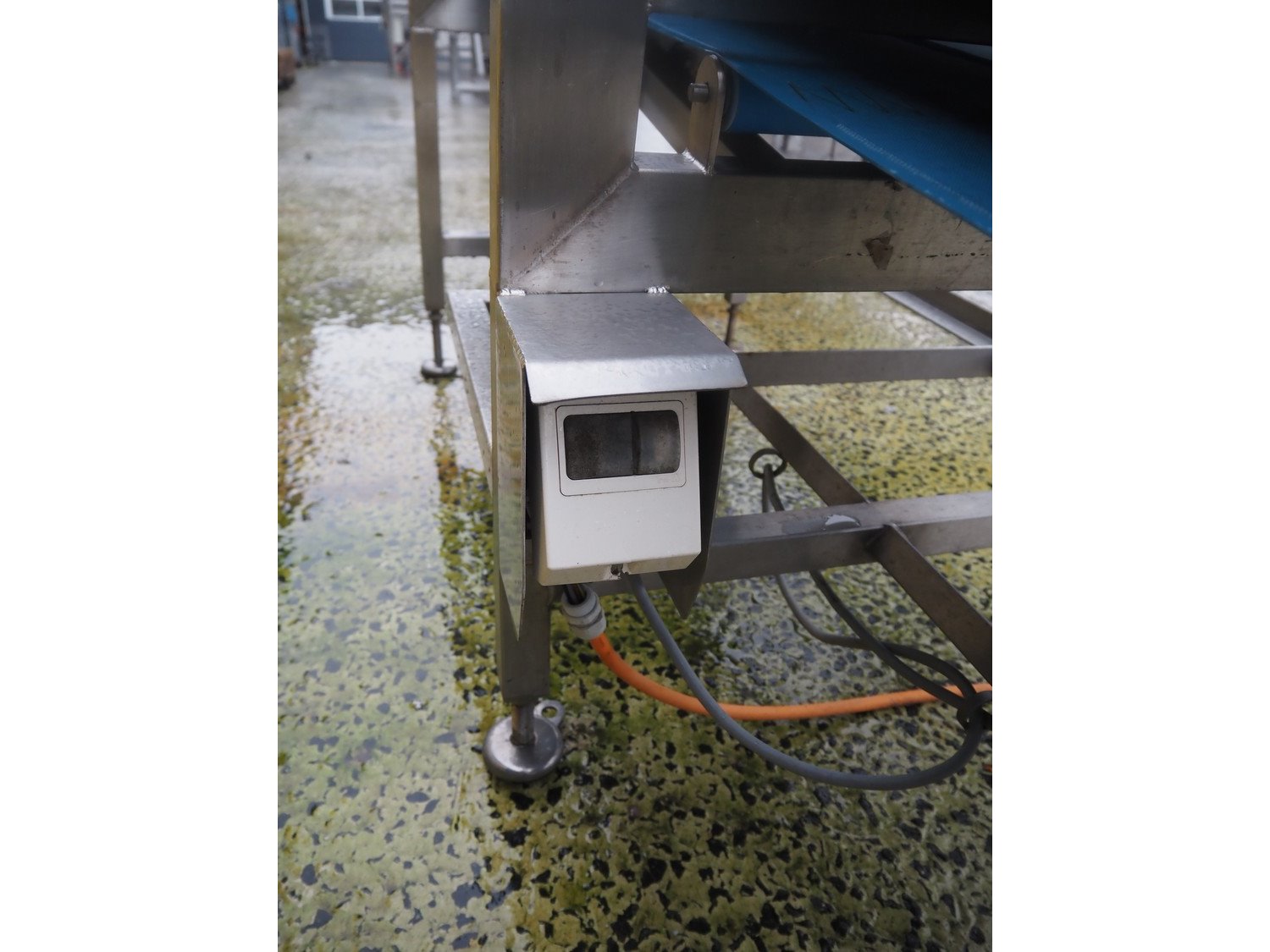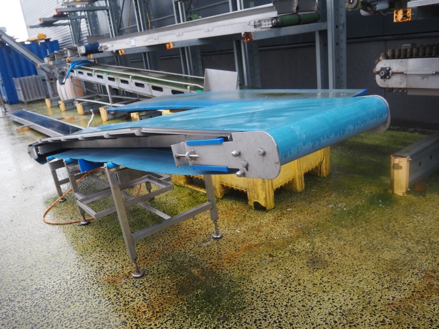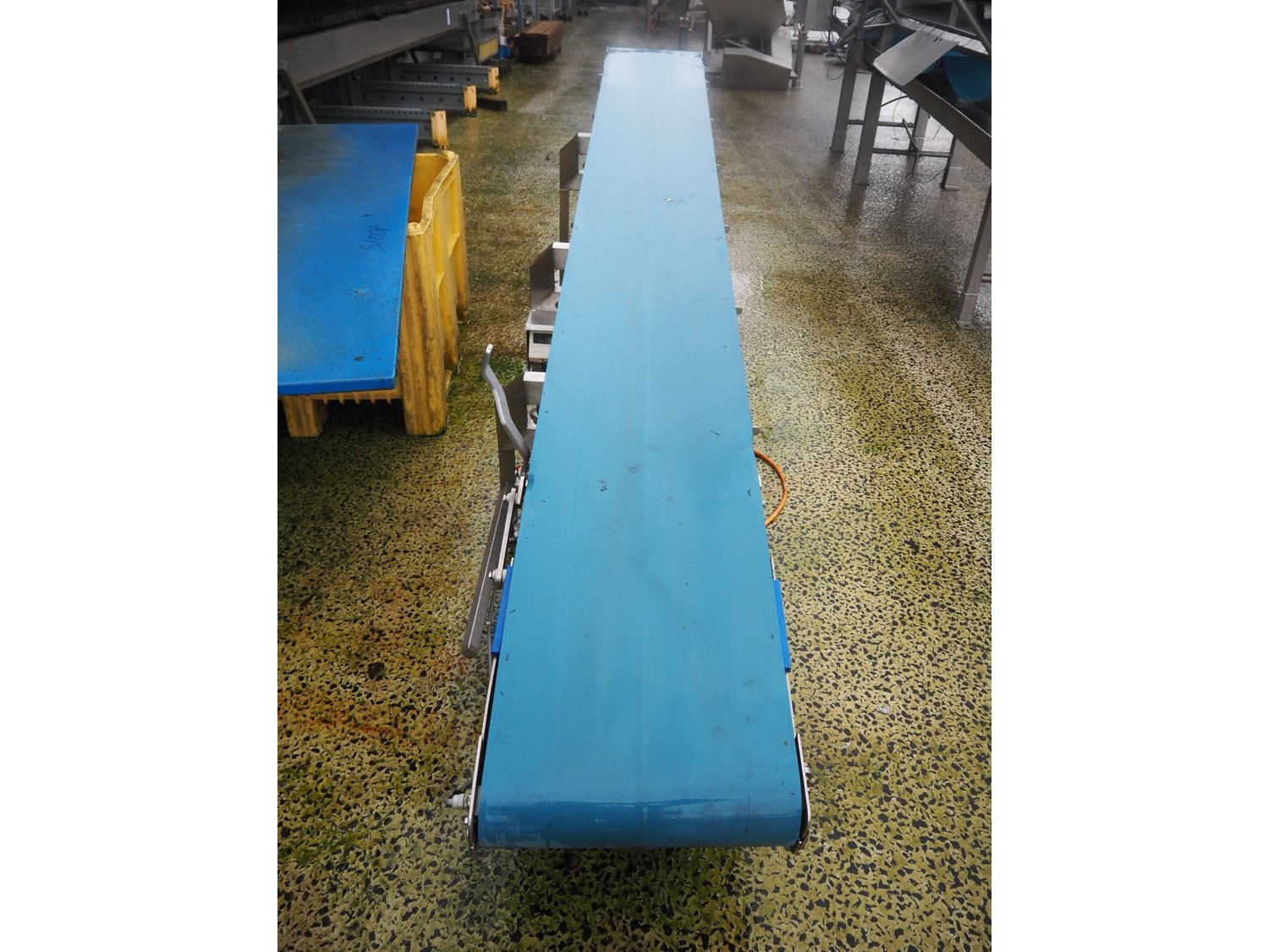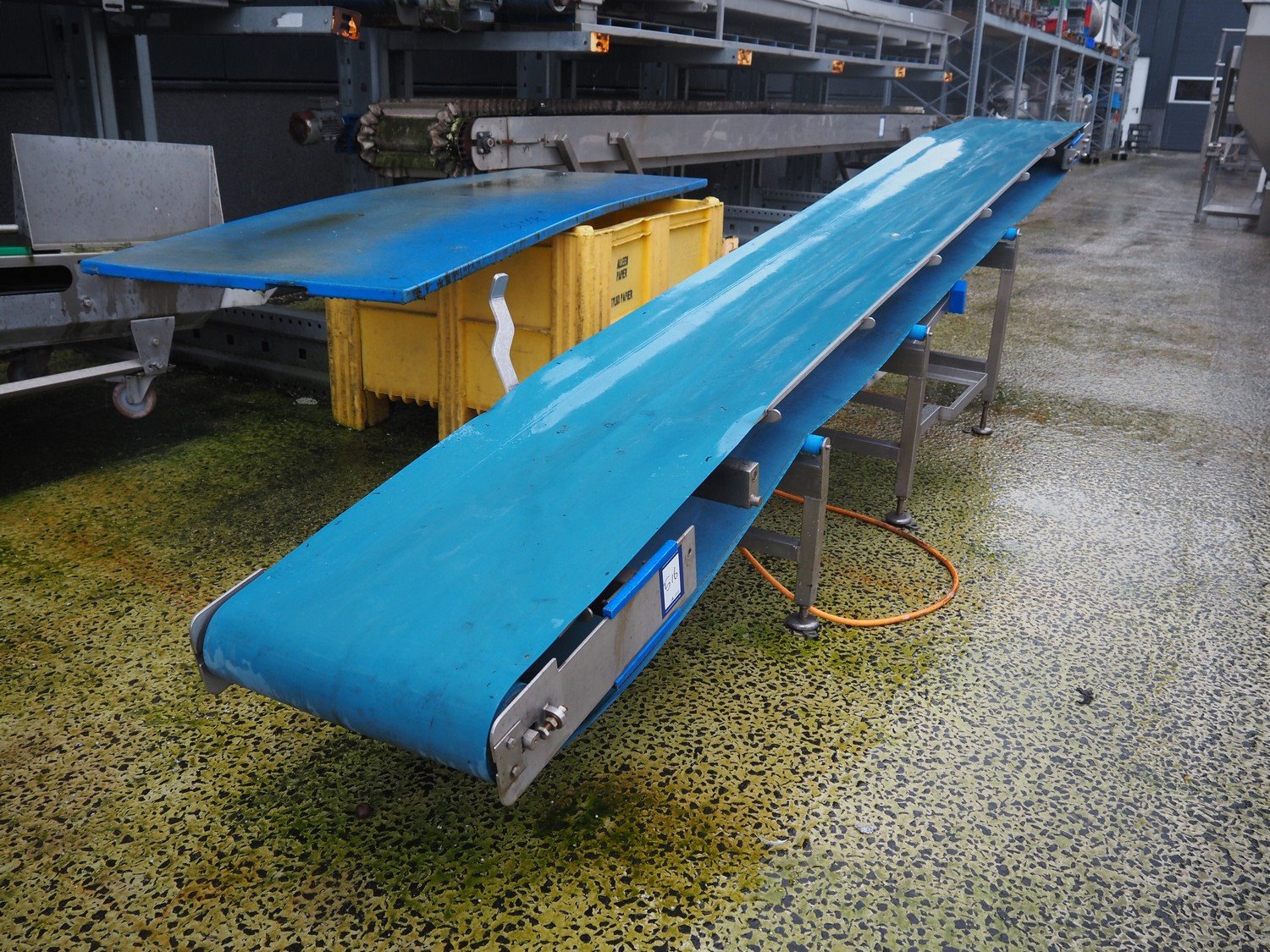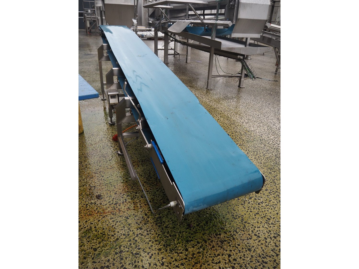LAC elevating belt, type: Weigher Infeed, serial number: FI0359-4A, year of construction: June 2011, plastic belt, belt width: 500 mm, elevating height: 1050 mm, total dimensions: 4400 mm x 650 mm x 1060 mm.