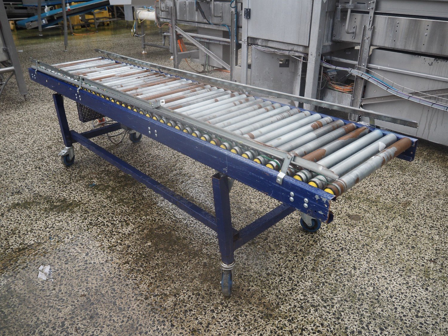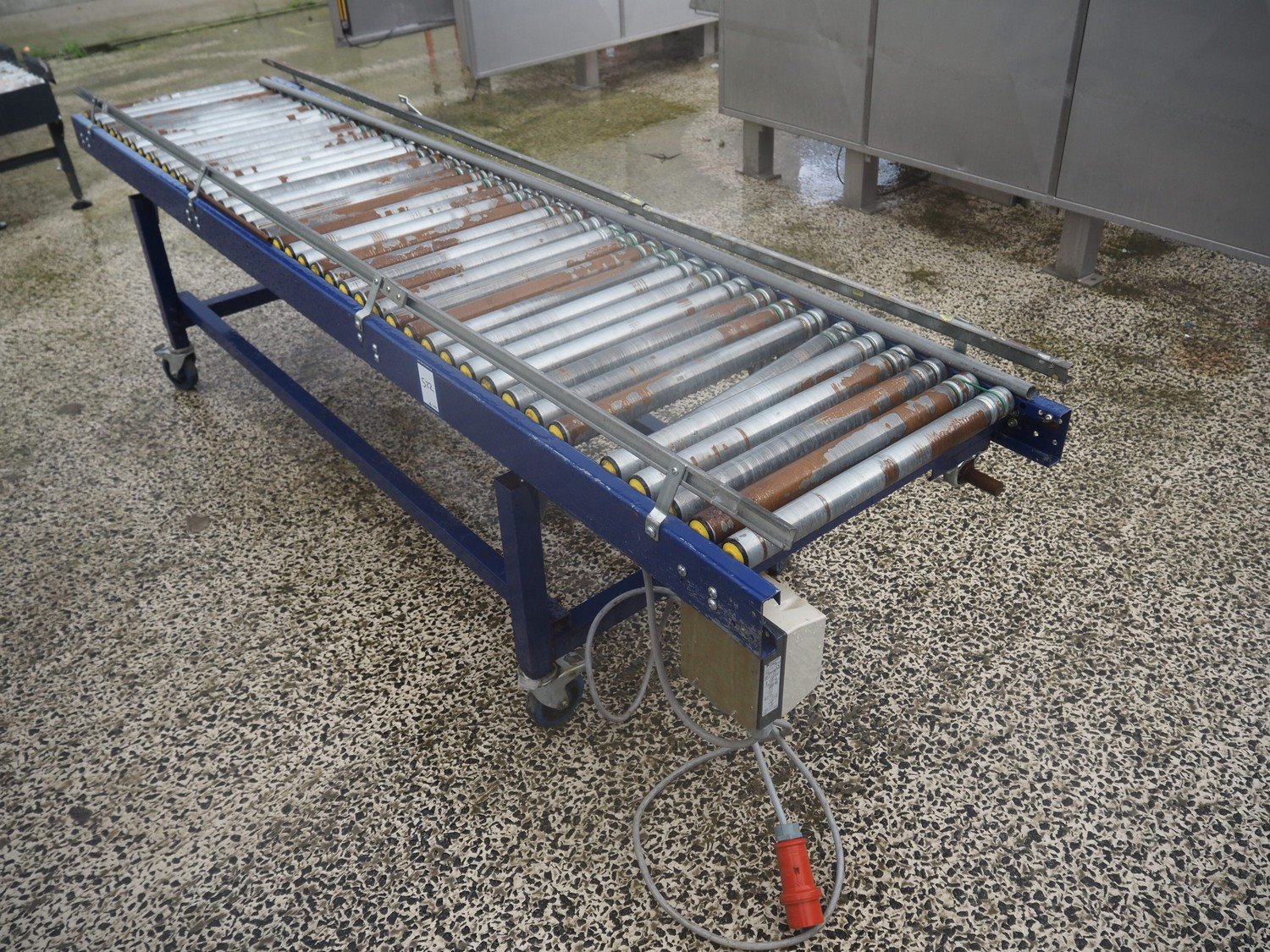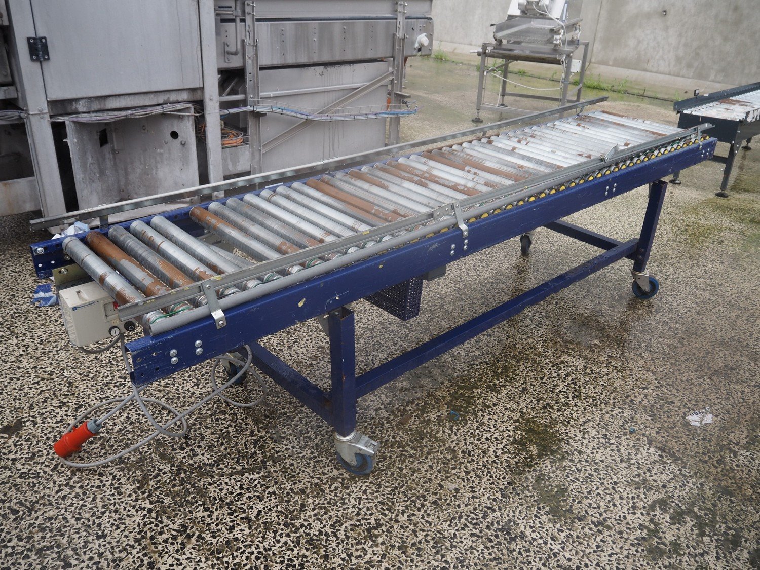 Mobile steel driven roller conveyor, steel rollers, roller width: 600 mm, total dimensions: 3000 mm x 750 mm x 850 mm.