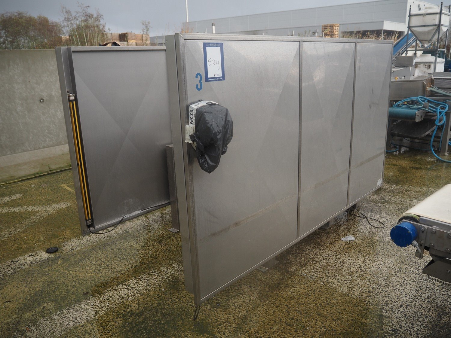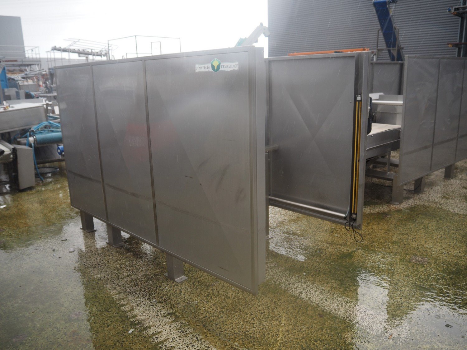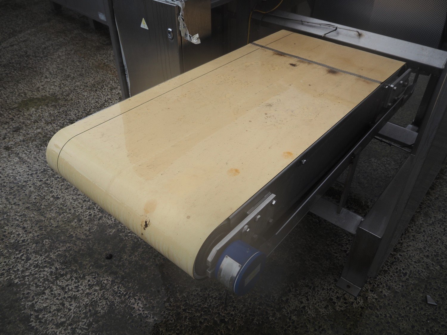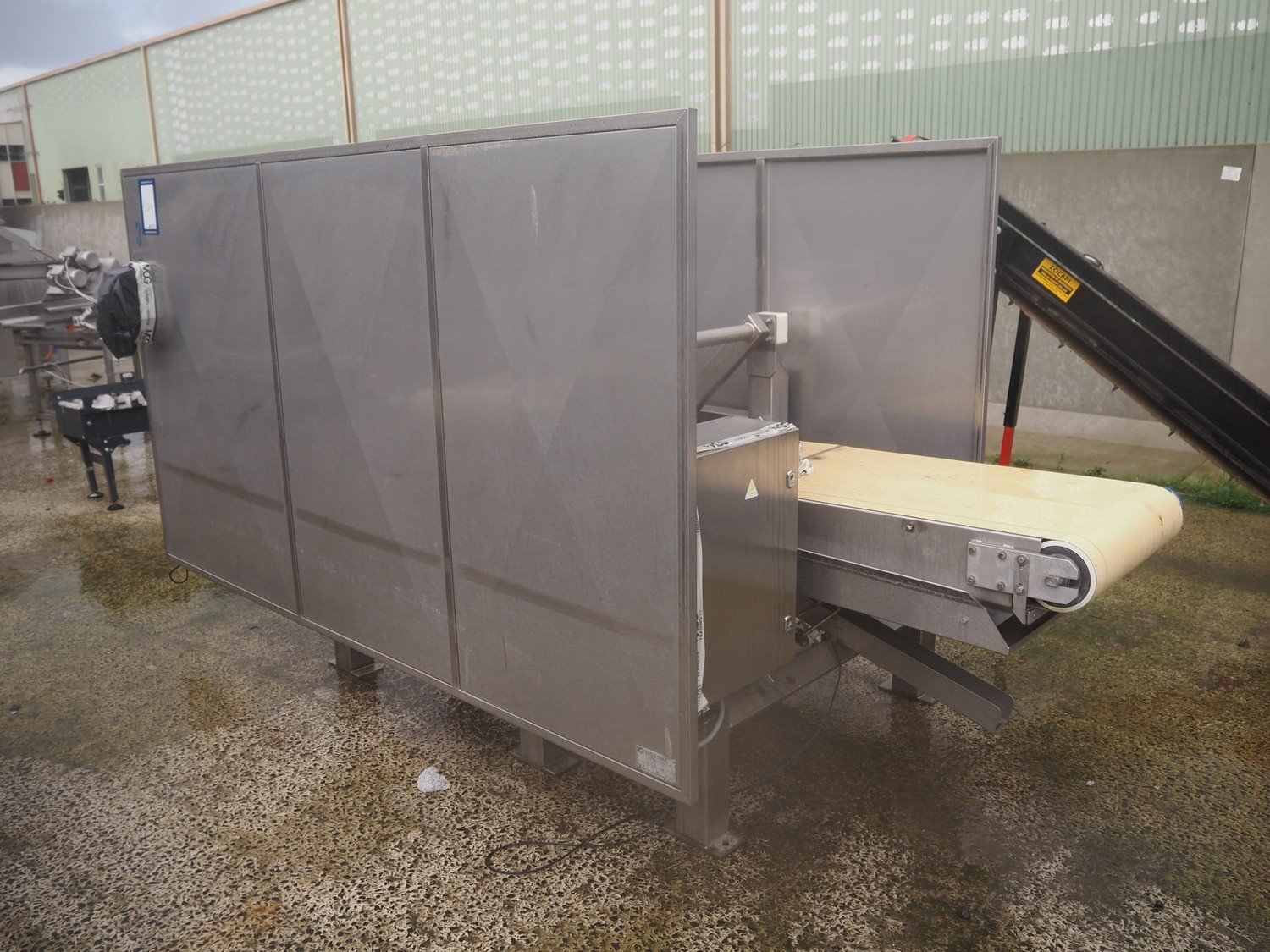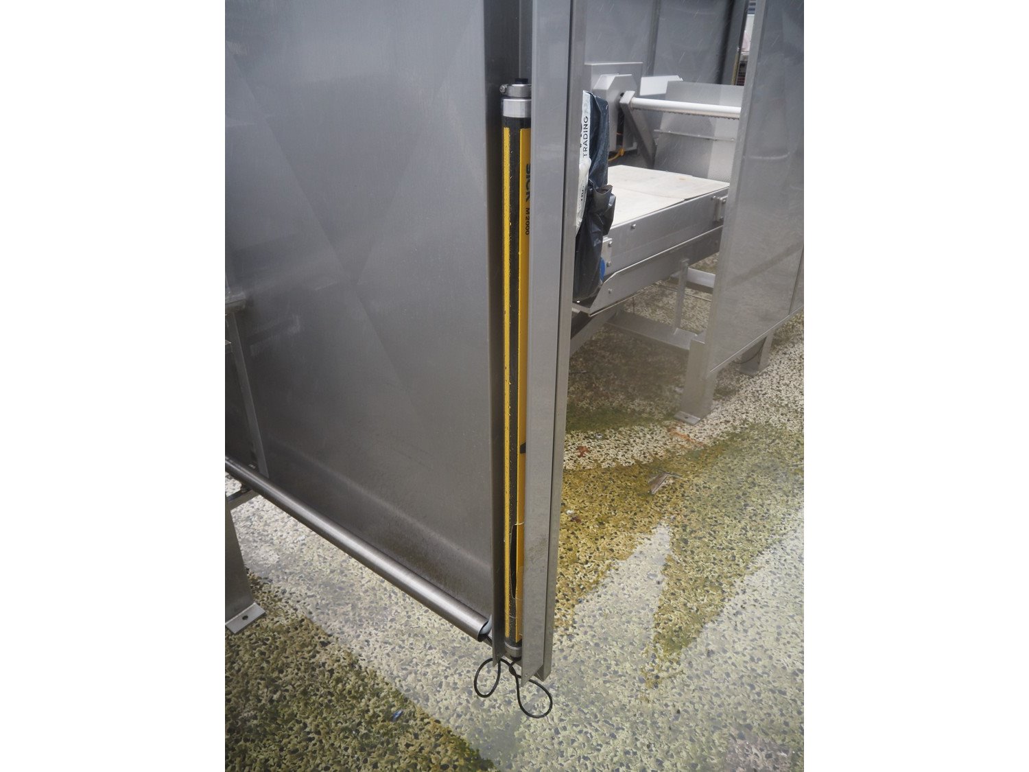 SAS DISPAC tilting device for 200 liter meat bins with outfeed belt, type: VIDEP, serial number: 08V28, year of construction: 06/08, plastic belt, belt width: 600 mm, total dimensions: 3400 mm x 1580 mm x 1810 mm.