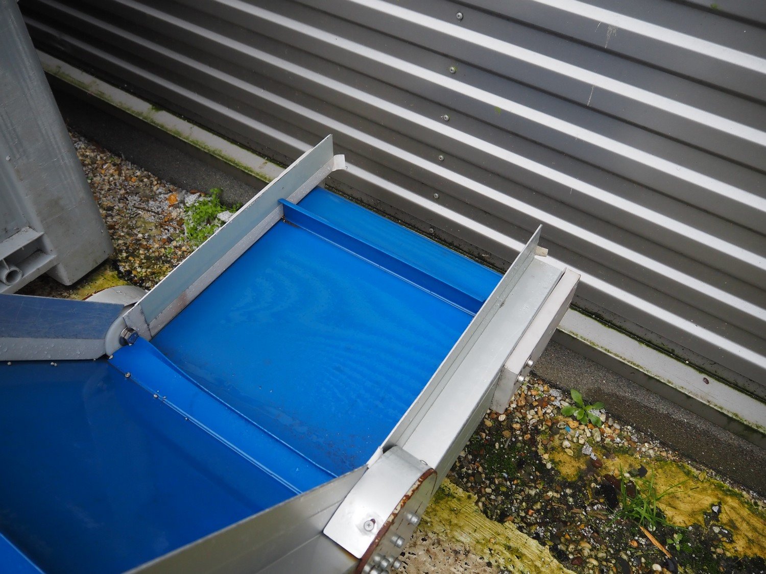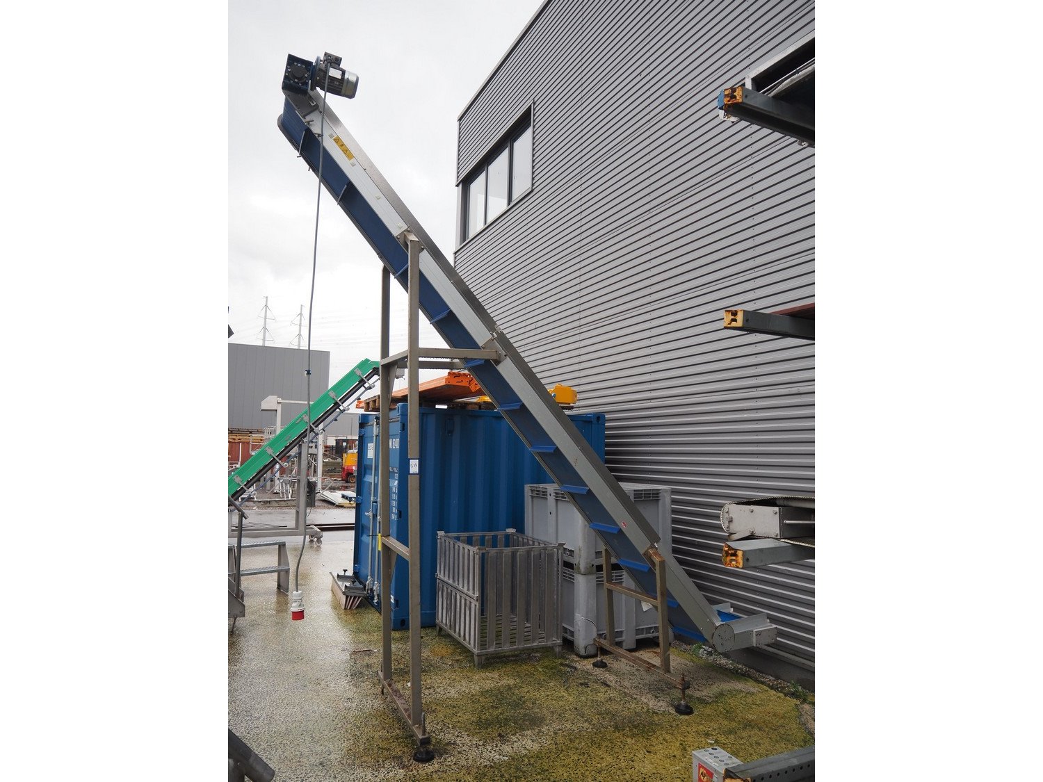 Elevating belt, plastic belt with dividers, belt width: 480 mm, divider height: 50 mm, distance between dividers: 400 mm, elevating height: 4100 mm, total dimensions: 4200 mm x 1200 mm x 4100 mm.