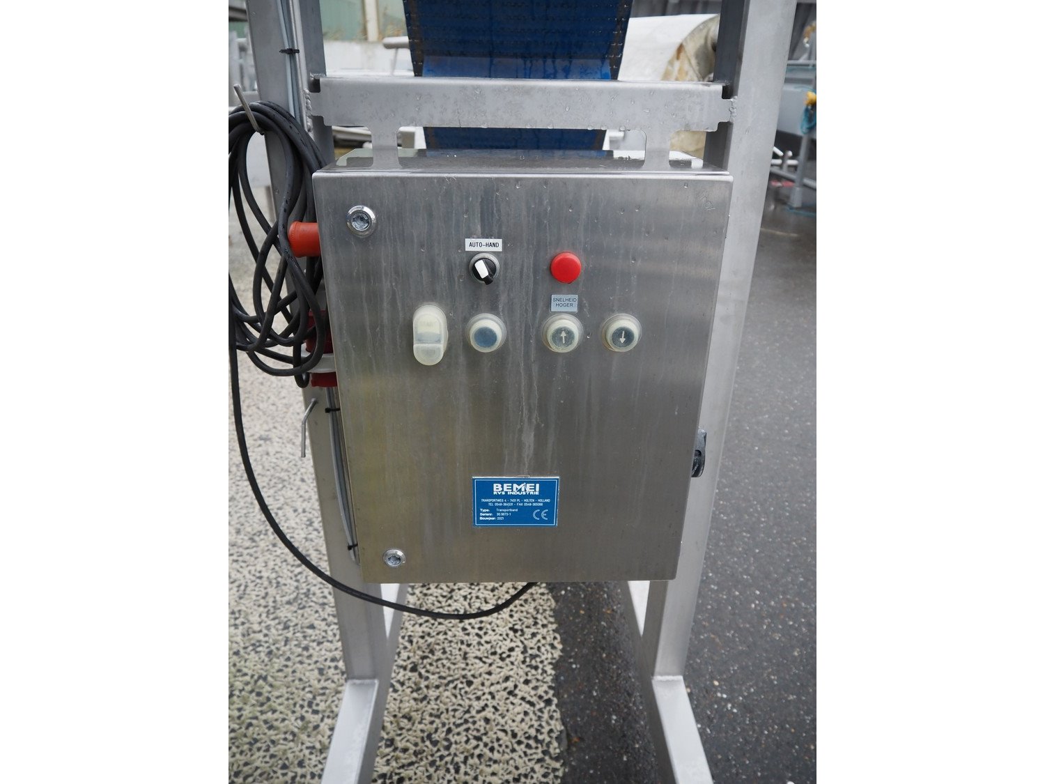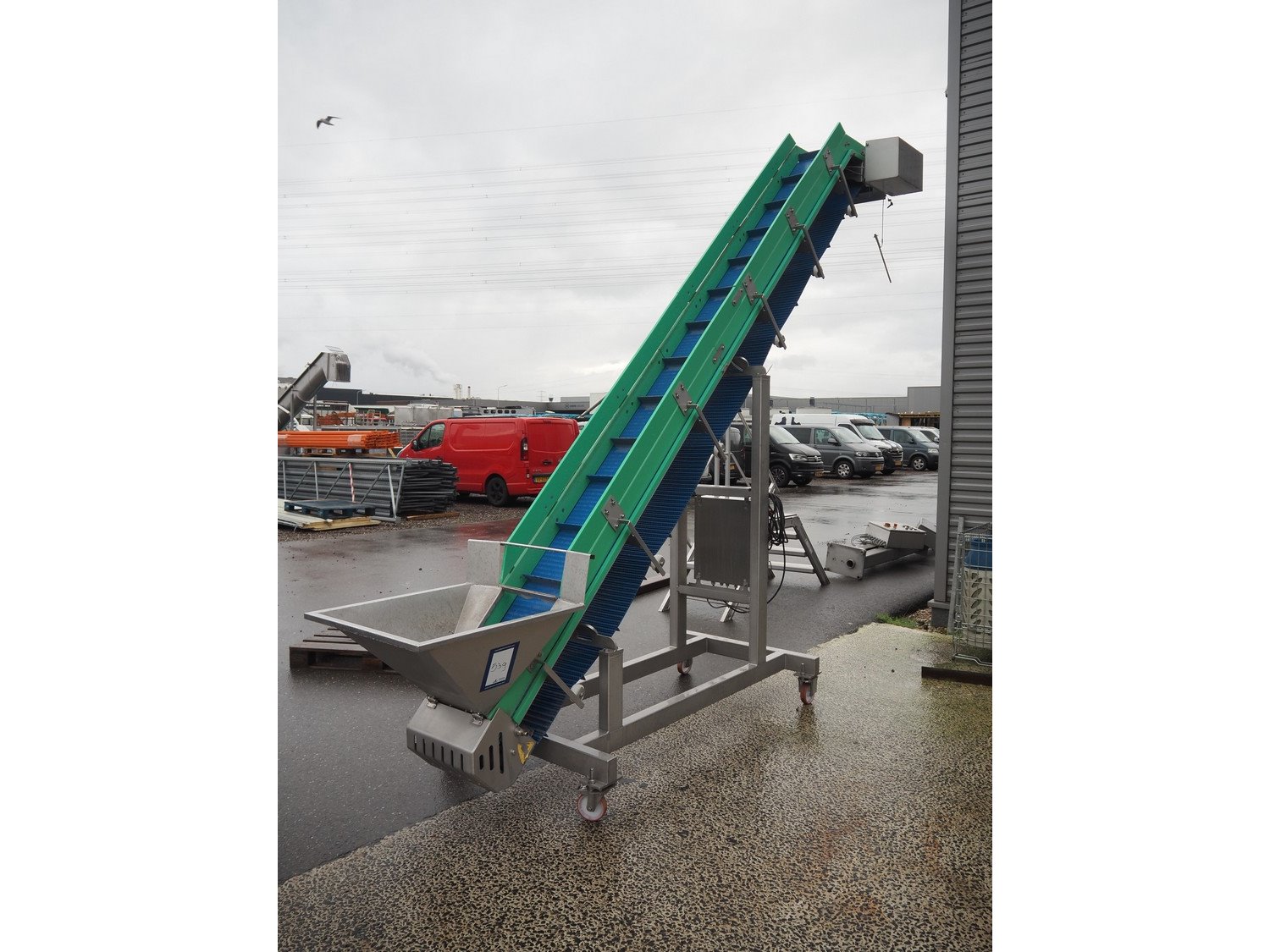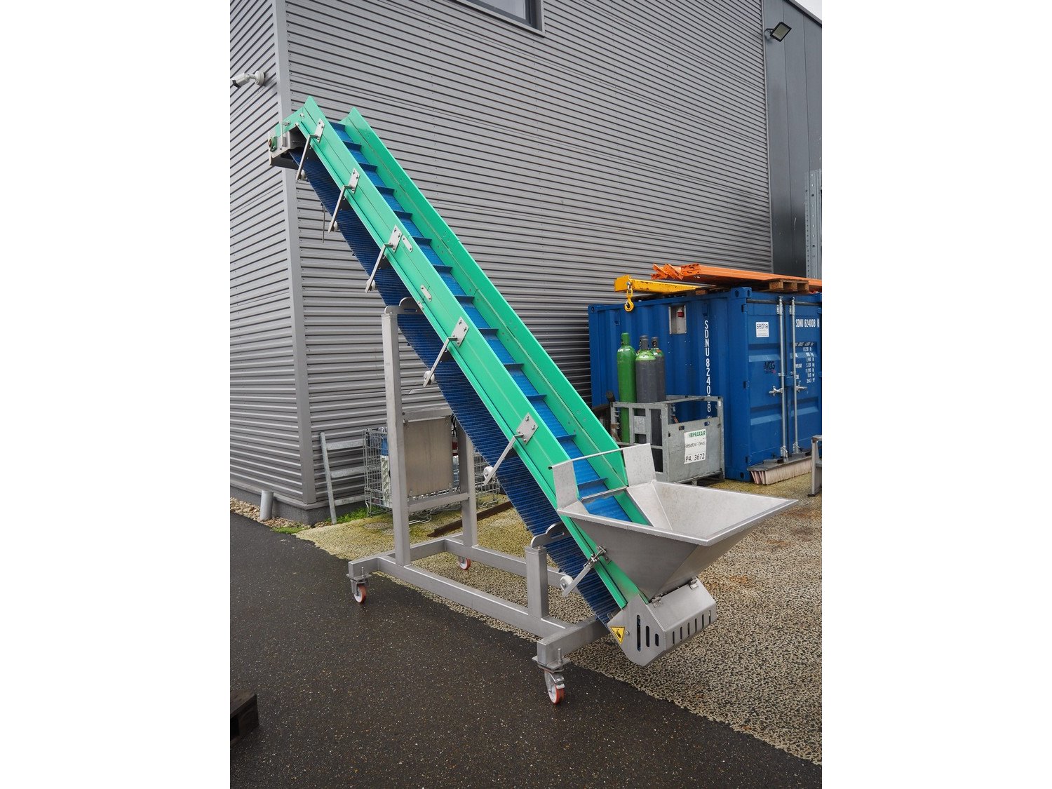 Bemei mobile elevating belt, serial number: 30.9673-1, year of construction: 2021, plastic belt with dividers, plastic belt, belt width: 400 mm, divider height: 50 mm, distance between dividers: 285 mm, elevating height: 3500 mm, total dimensions: 4200 mm x 1000 mm x 3700 mm.