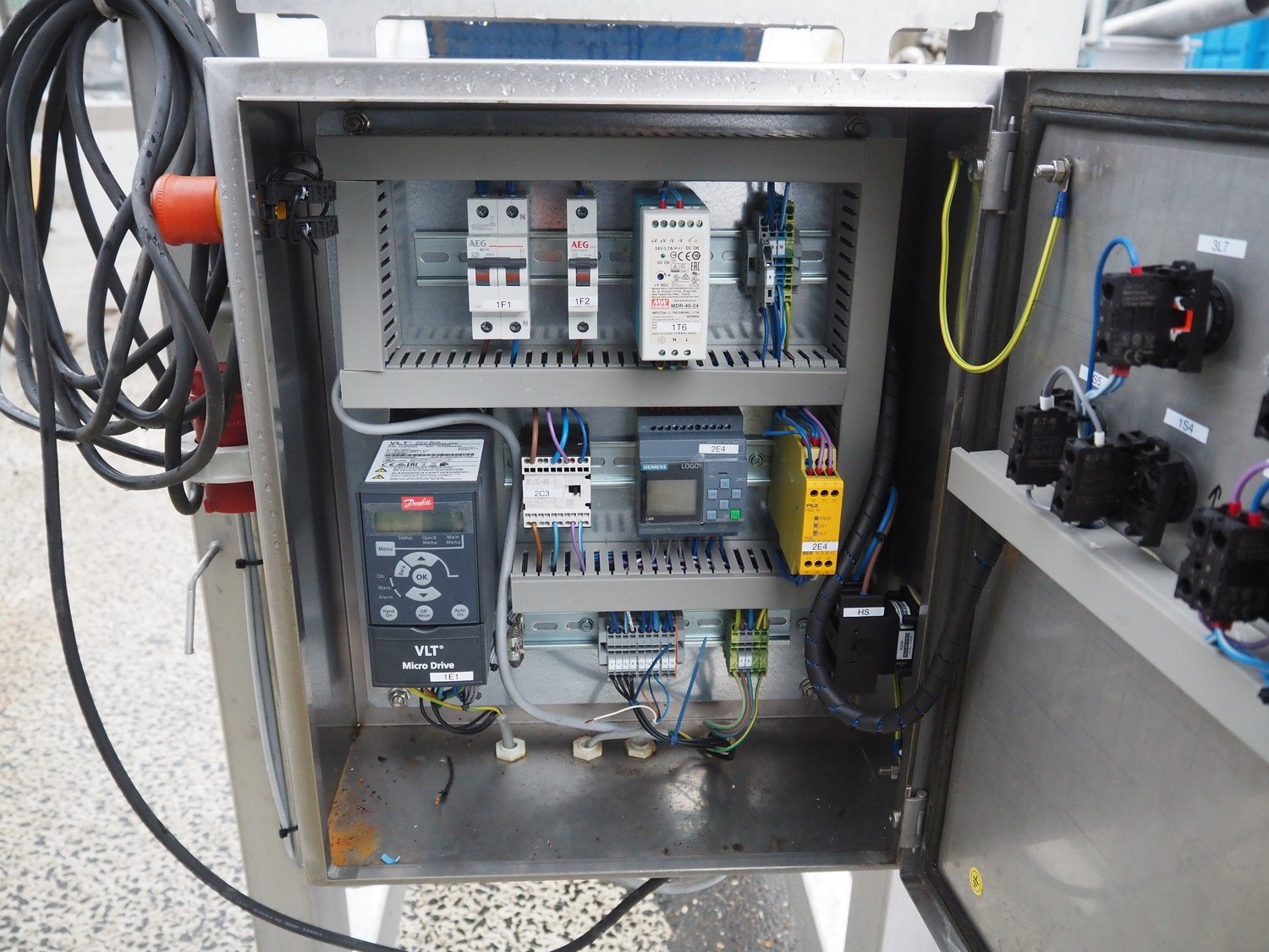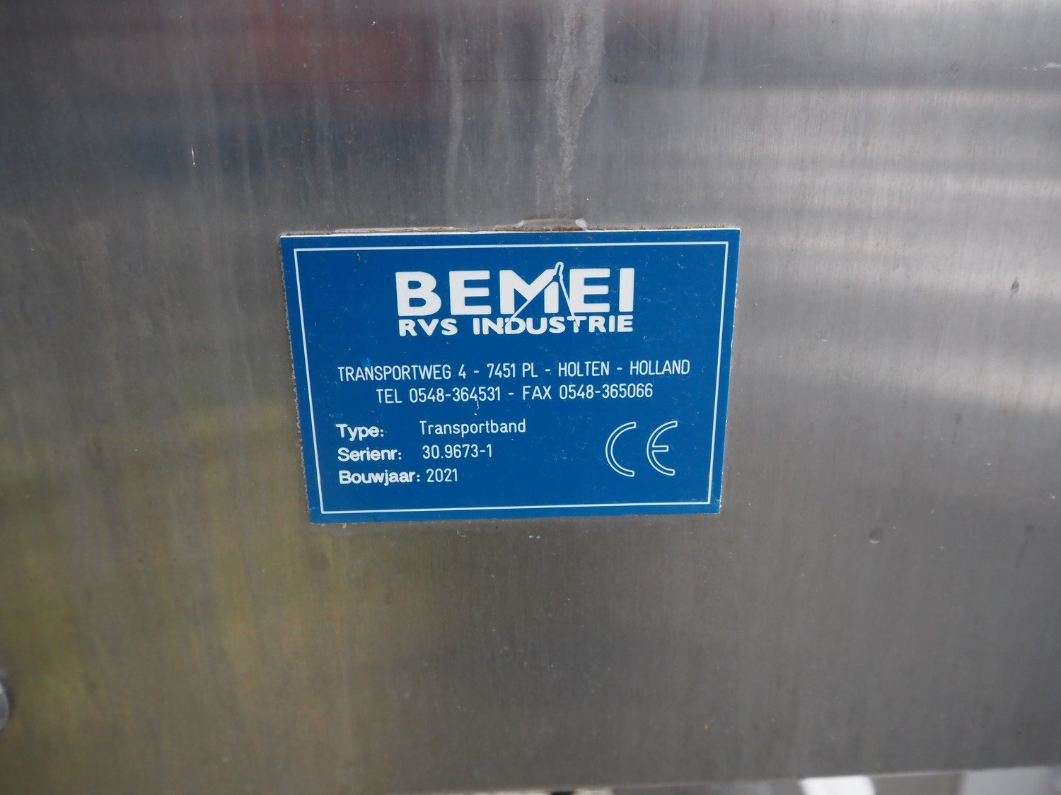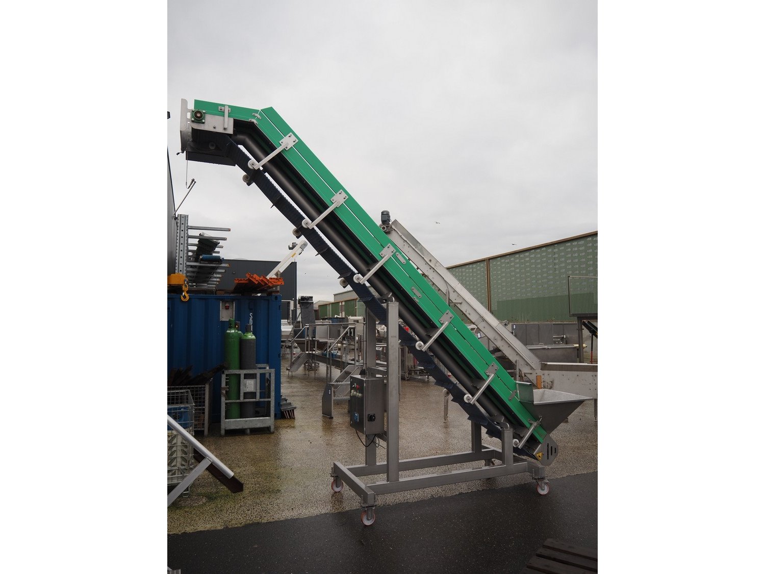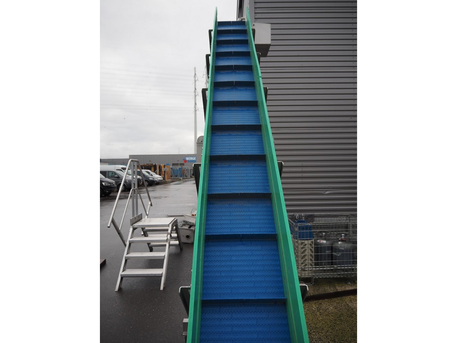 Bemei mobile elevating belt, serial number: 30.9673-1, year of construction: 2021, plastic belt with dividers, plastic belt, belt width: 400 mm, divider height: 50 mm, distance between dividers: 285 mm, elevating height: 3500 mm, total dimensions: 4200 mm x 1000 mm x 3700 mm.