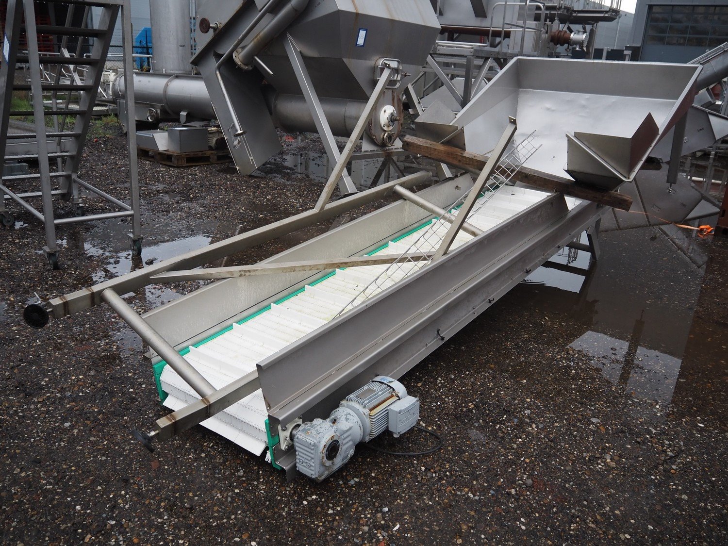 Elevating belt with infeed bunker, s/s frame, plastic belt with dividers, belt width: 700 mm, distance between dividers: 250 mm, divider height: 40 mm, total dimensions: 4400 mm x 1500 mm x 1650 mm.