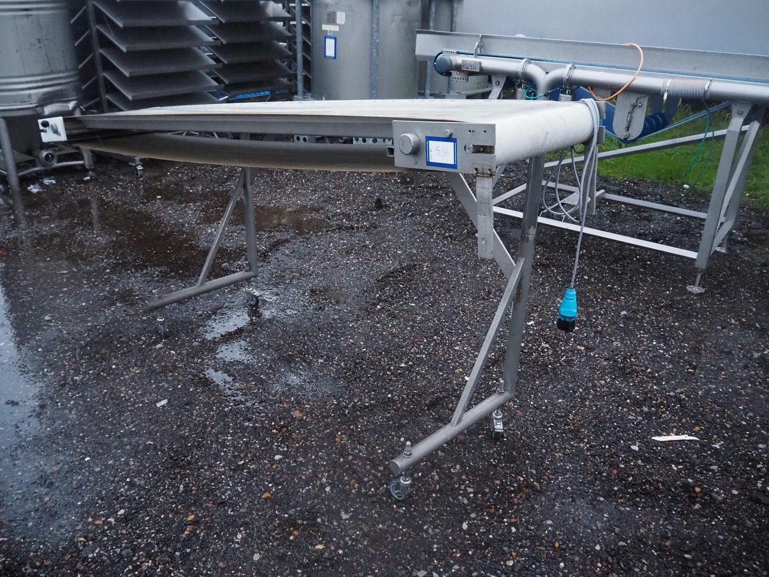 Mobile transport belt, s/s frame, plastic belt, belt width: 500 mm, total dimensions: 3050 mm x 700 mm x 1300 mm.