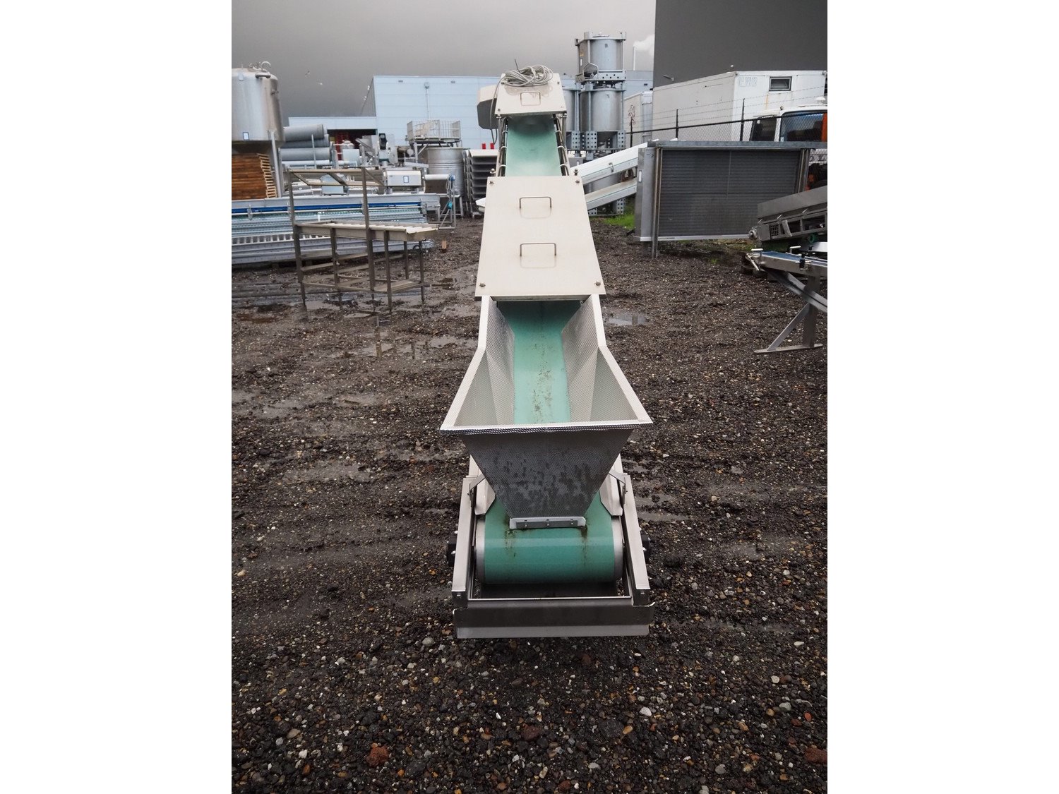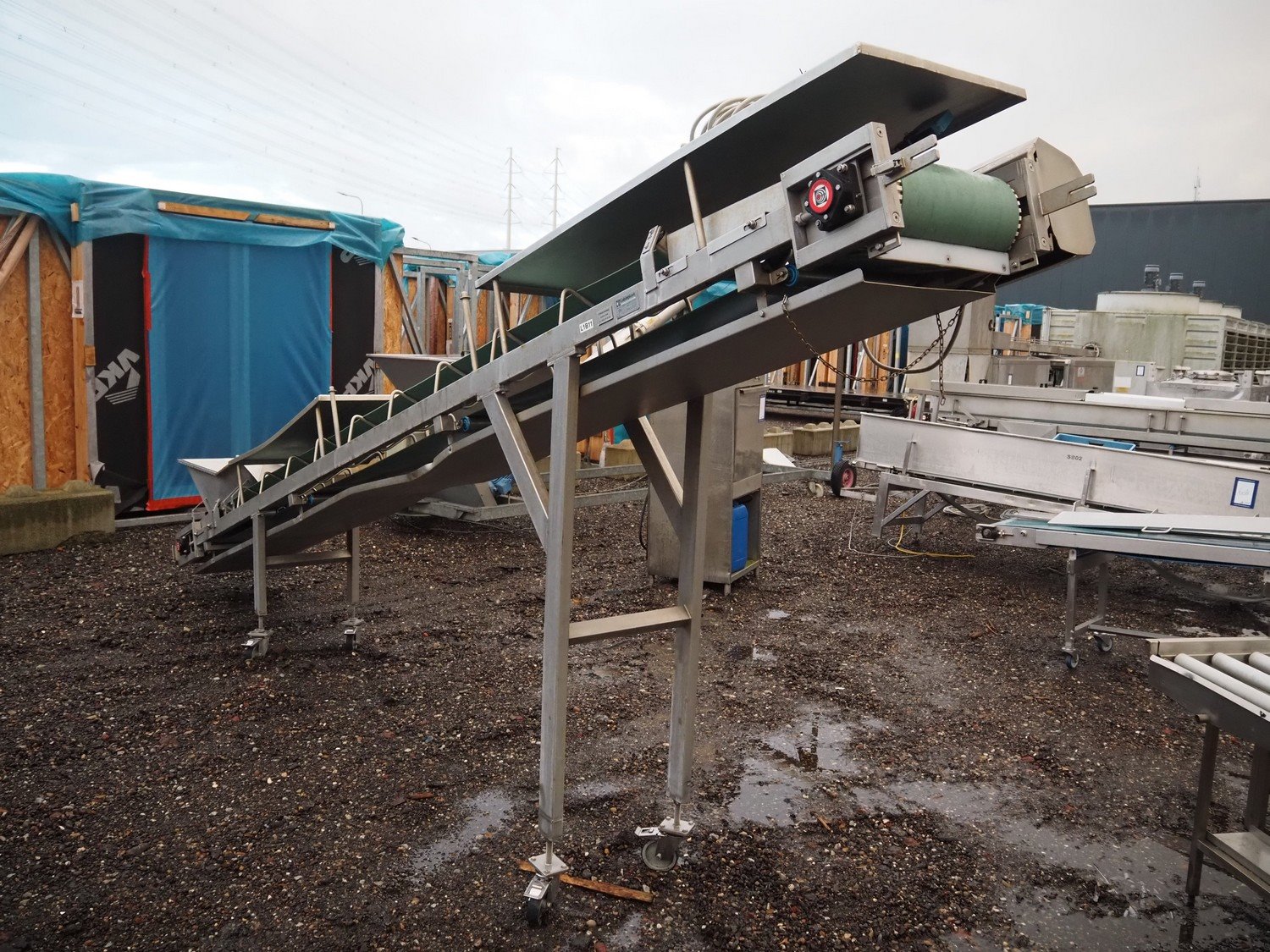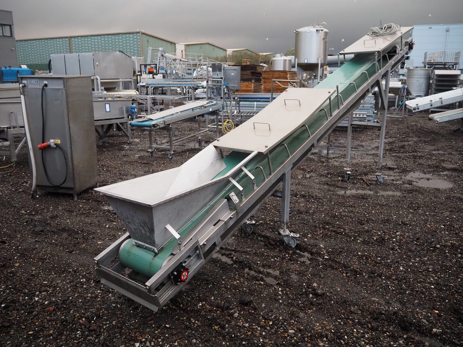 Cabinplant mobile elevating belt, number: 9-8796-05-03-0s/s frame, plastic belt, belt width: 400 mm, elevating height: 2150 mm, total dimensions: 6500 mm x 800 mm x 2400 mm.
