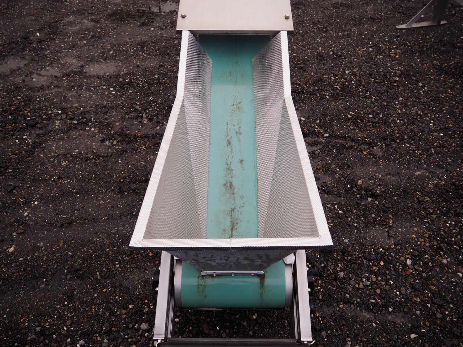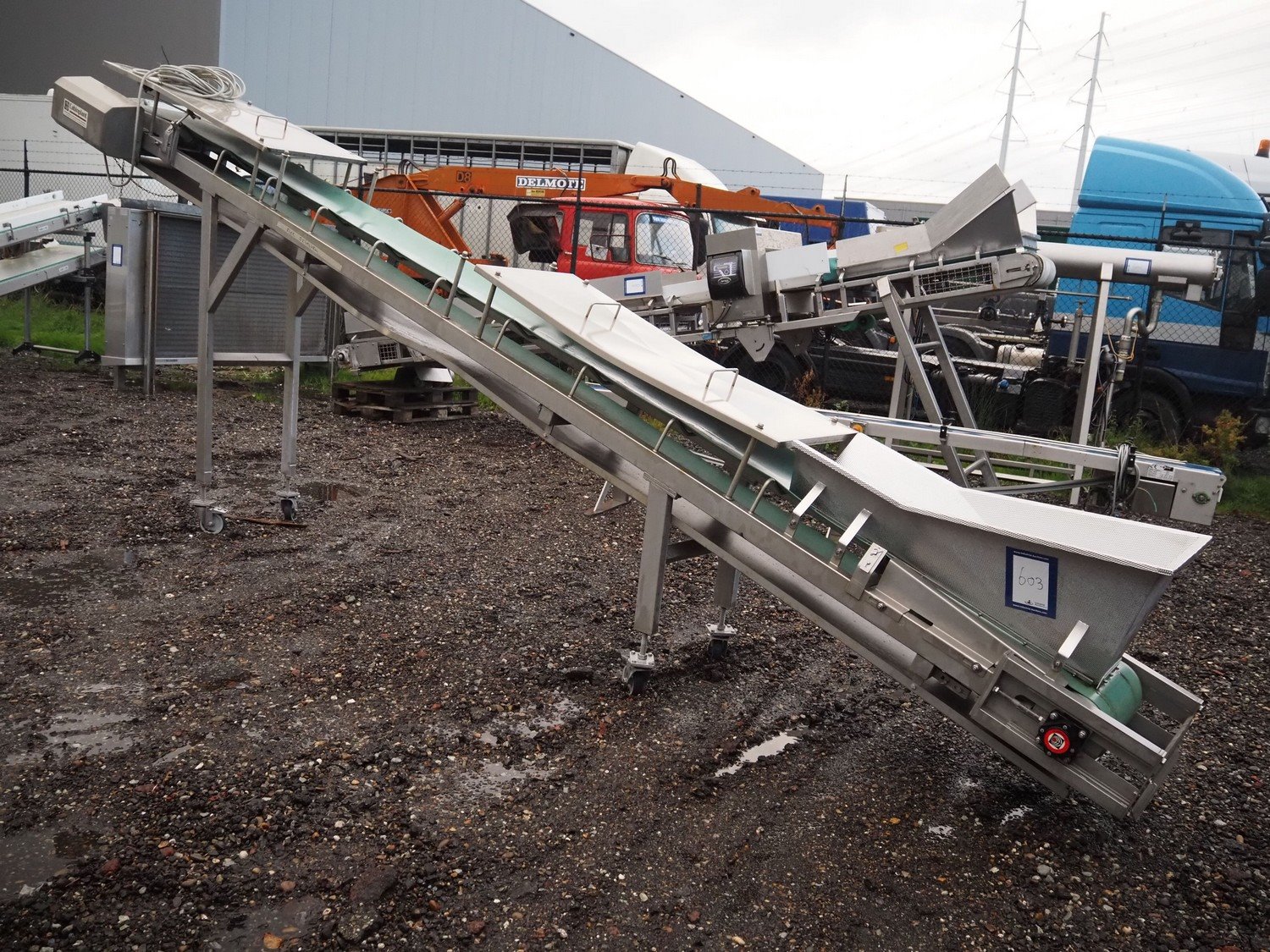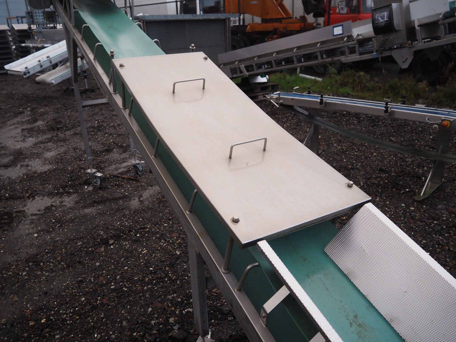 Cabinplant mobile elevating belt, number: 9-8796-05-03-0s/s frame, plastic belt, belt width: 400 mm, elevating height: 2150 mm, total dimensions: 6500 mm x 800 mm x 2400 mm.