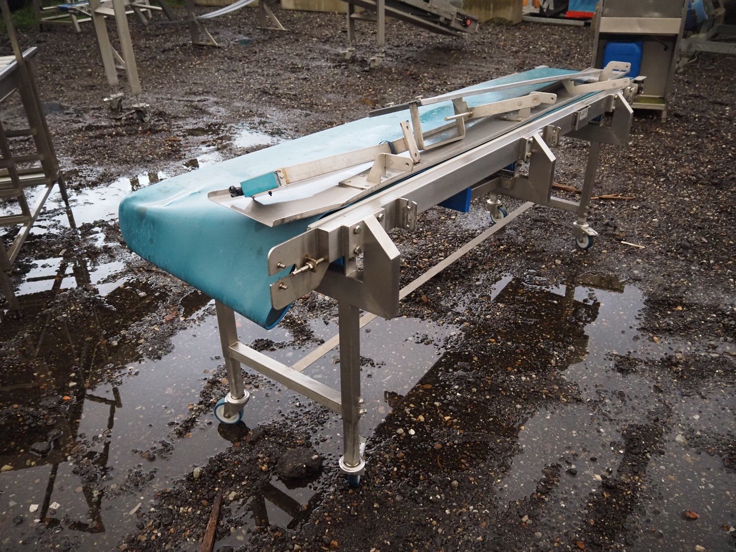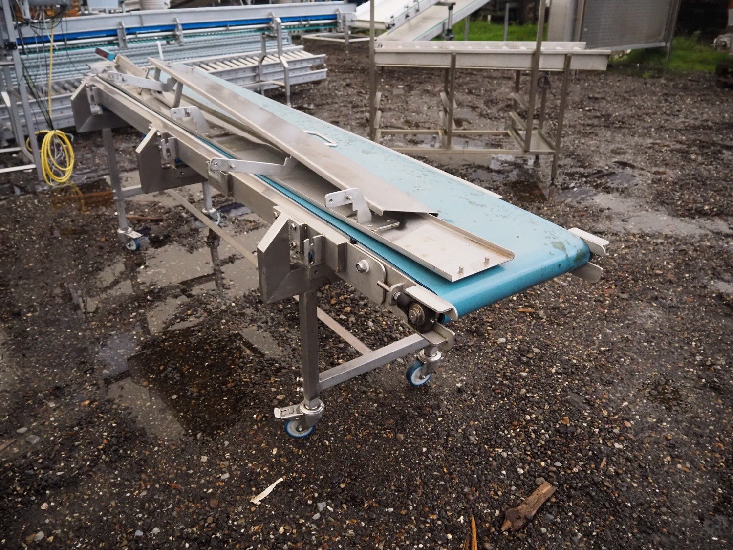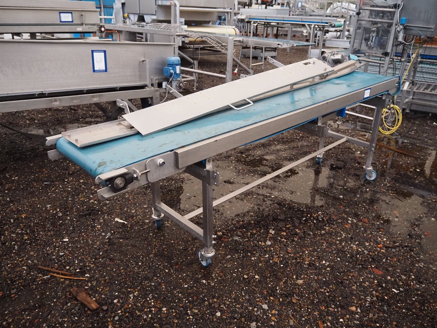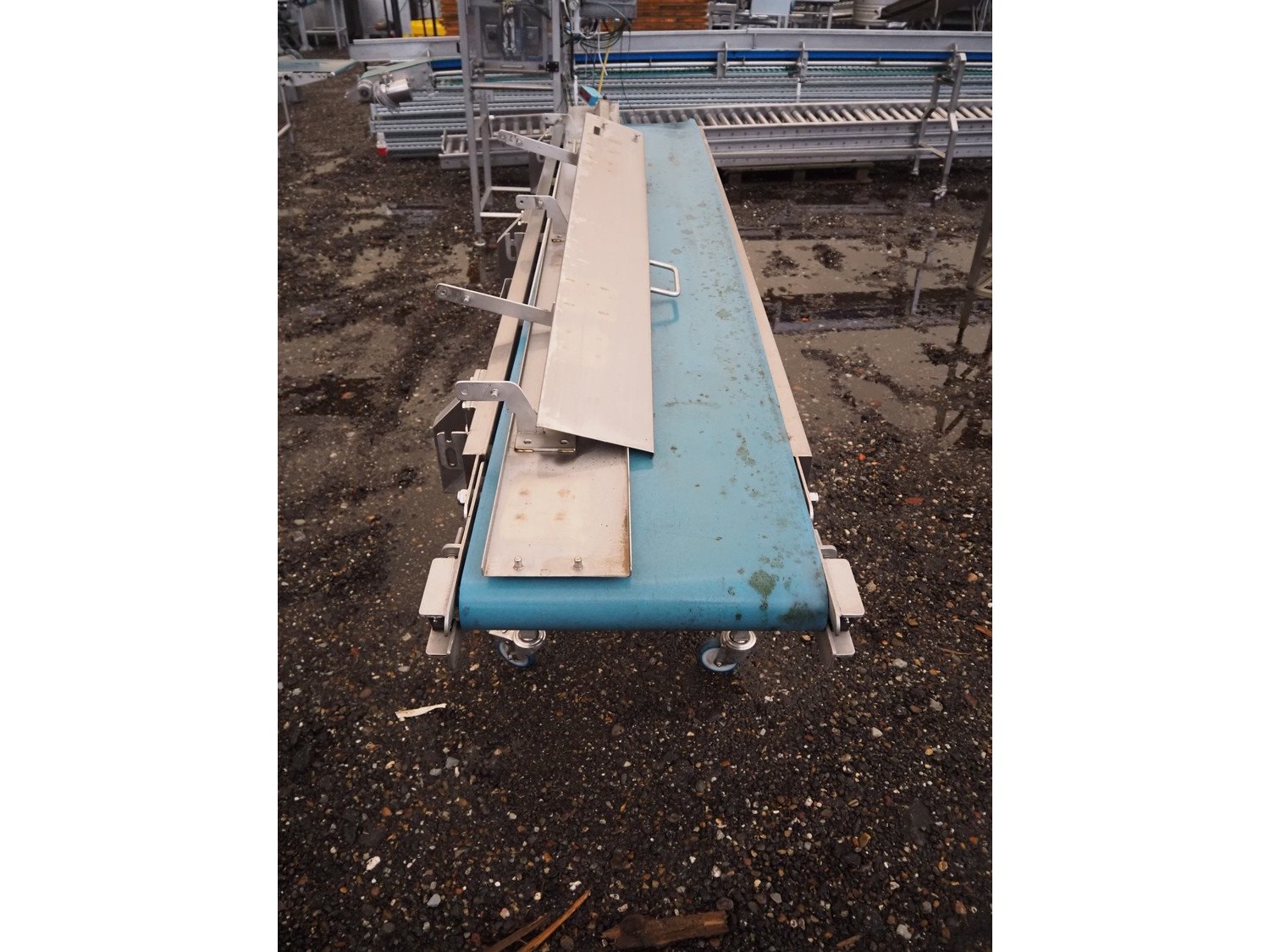 Mobile transport belt, s/s frame, plastic belt, belt width: 500 mm, total dimensions: 2800 mm x 700 mm x 1000 mm. Incomplete.