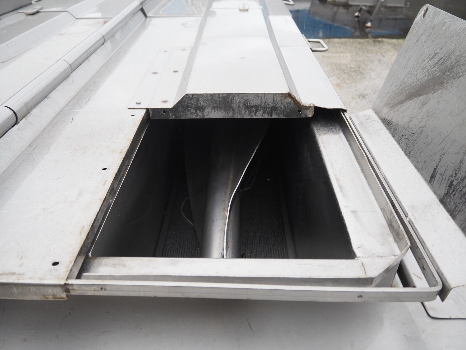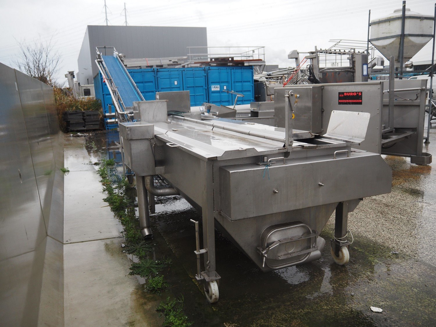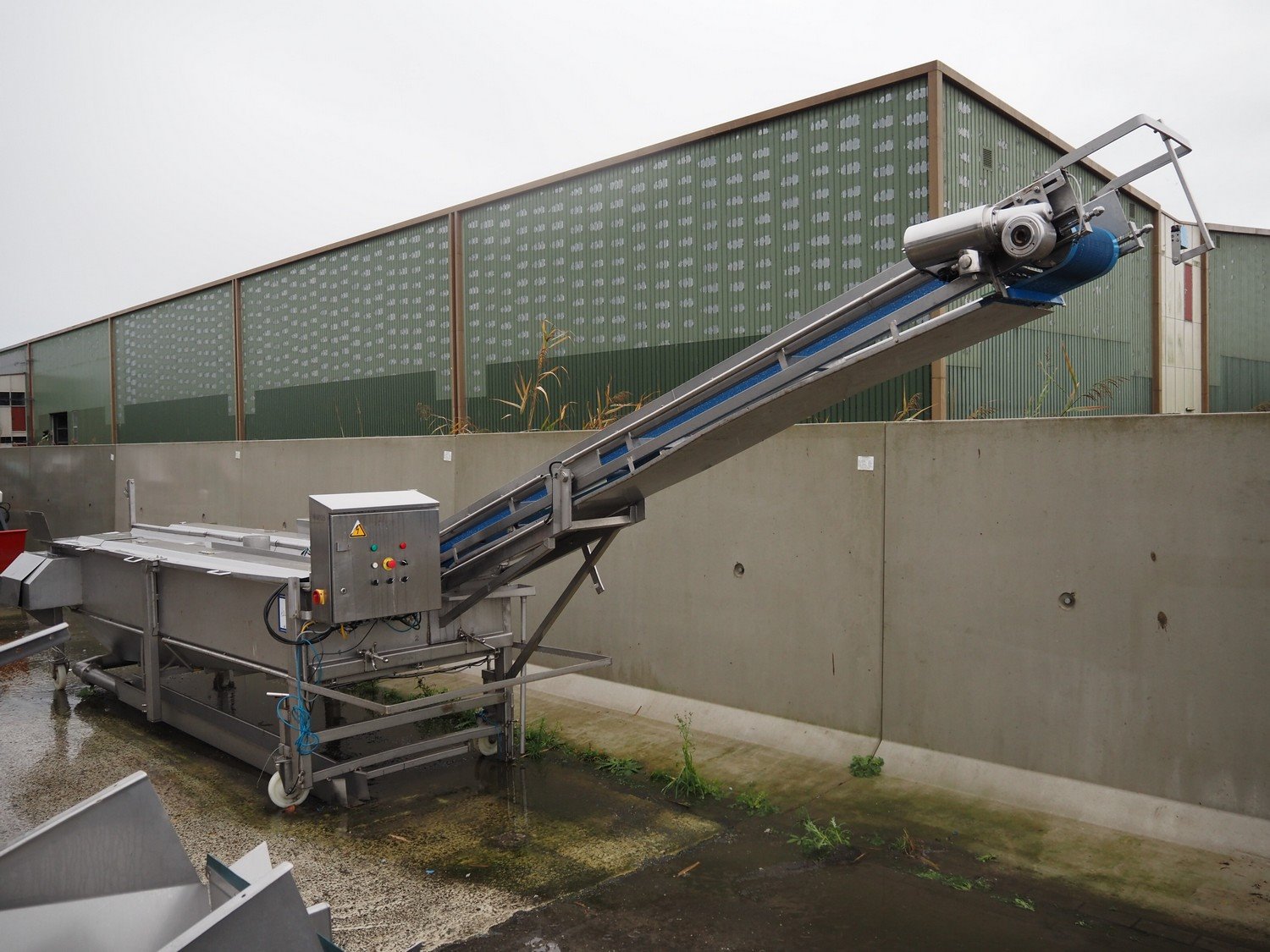 Mobile vegetable washing tub with dryer and outfeed belt, plastic sieve belt, belt width: 380 mm, inside dimensions: 4000 mm x 1250 mm x 650 mm, total dimensions: 8000 mm x 1900 mm x 2750 mm.