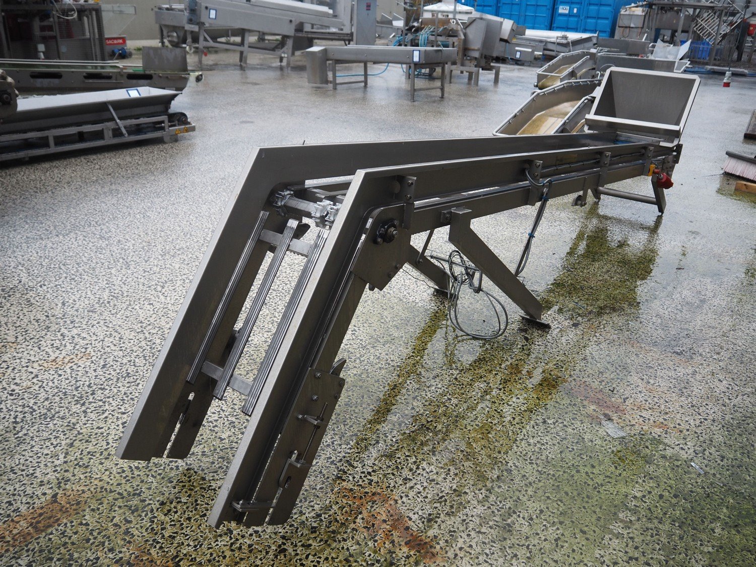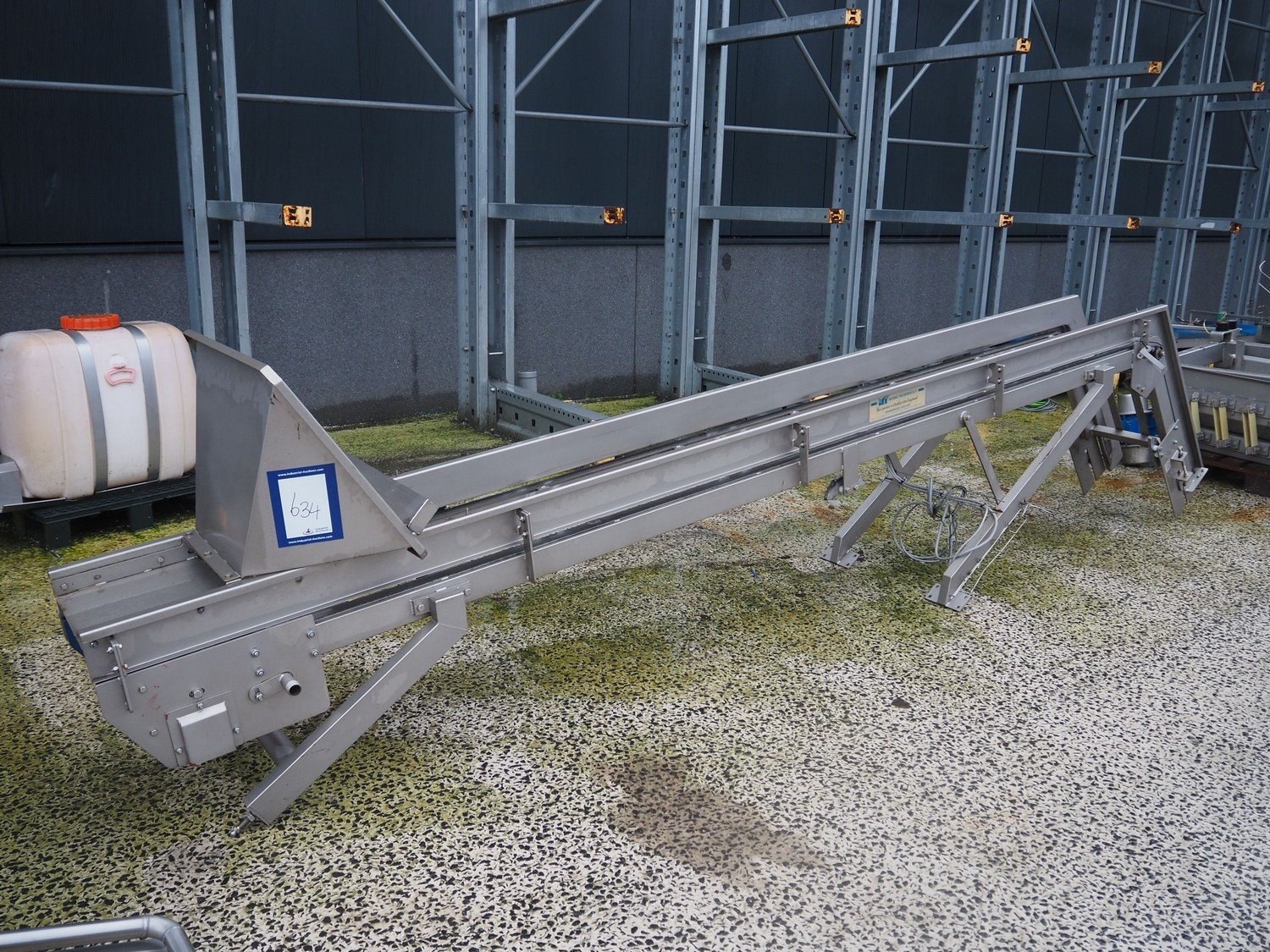 Murre Techniek b.v. elevating belt, s/s frame, belt width: 400 mm, total dimensions: 5250 mm x 600 mm x 1100 mm. Missing belt.