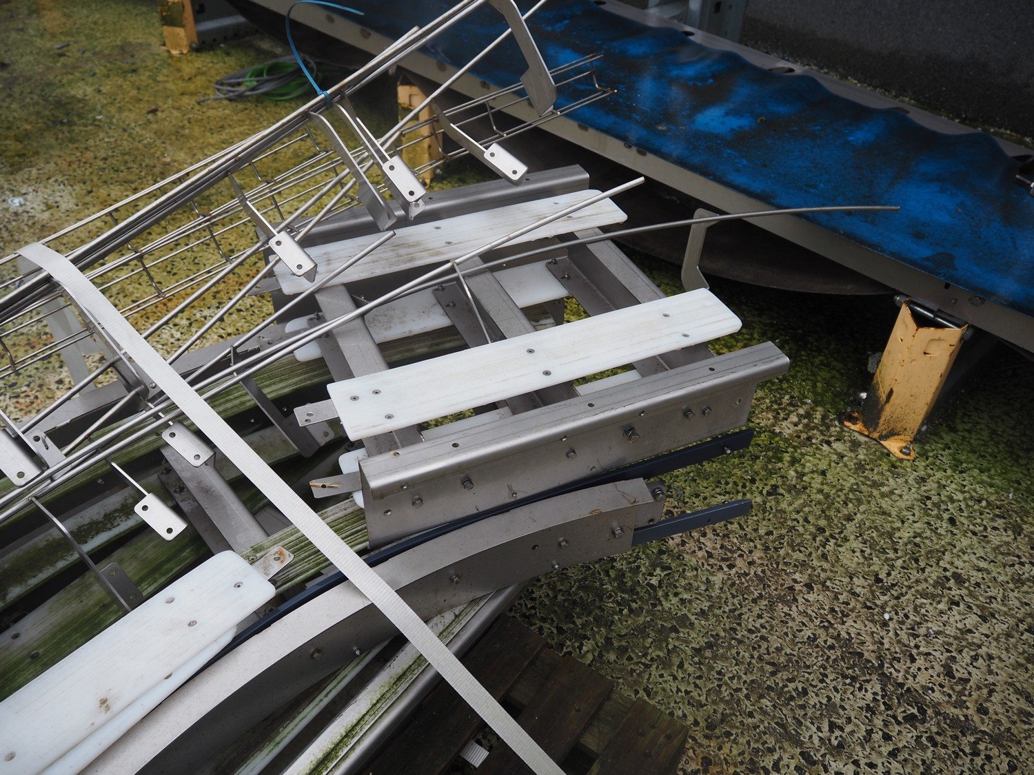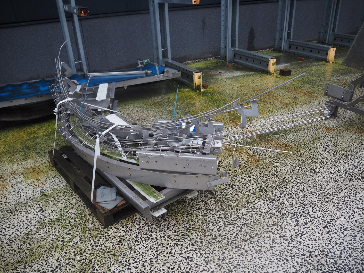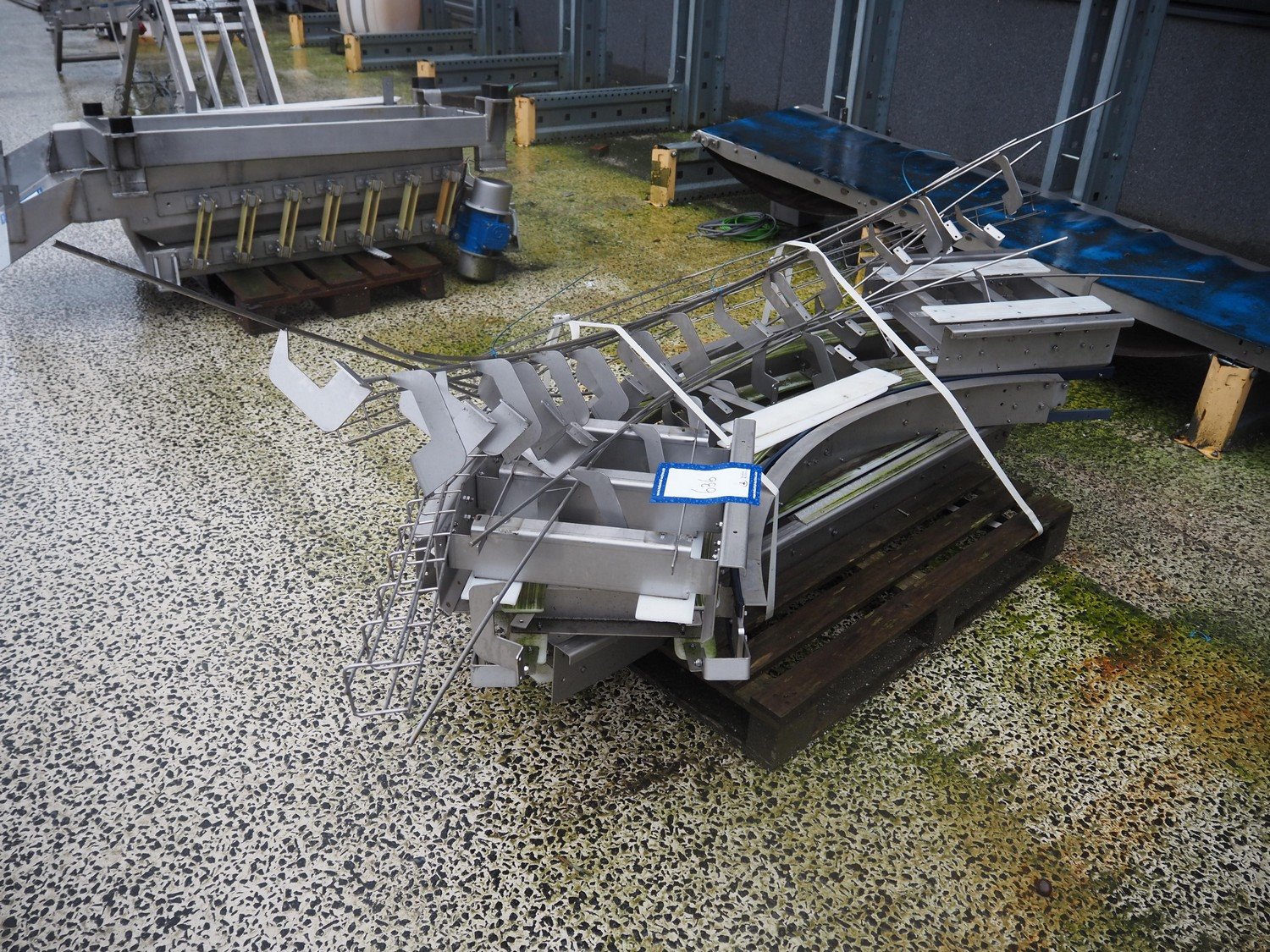 Pallet with frames for transport belt and 90° curve conveyor, approximate belt width: 450 mm, total dimensions: 1800 mm x 1200 mm x 500 mm.