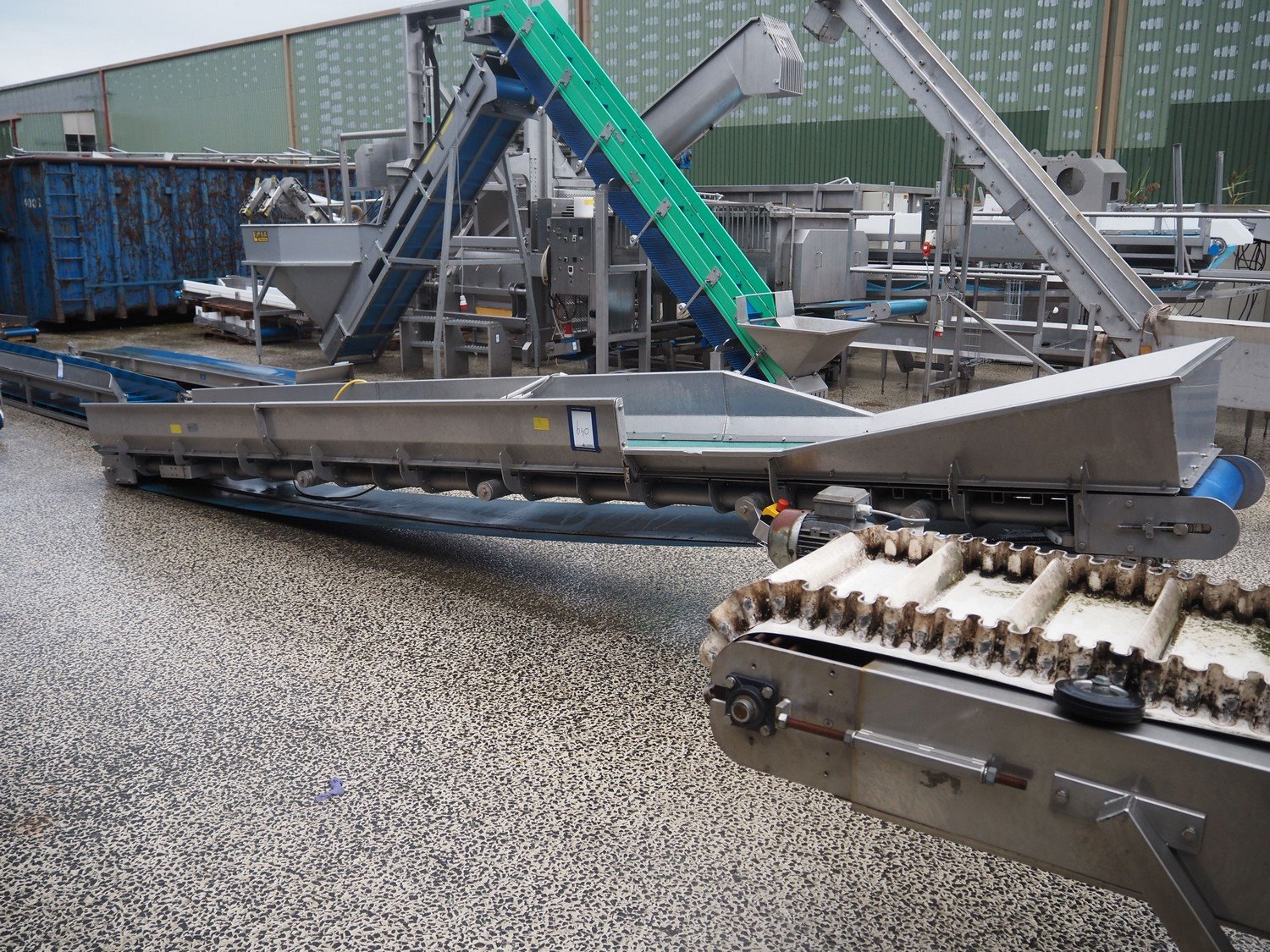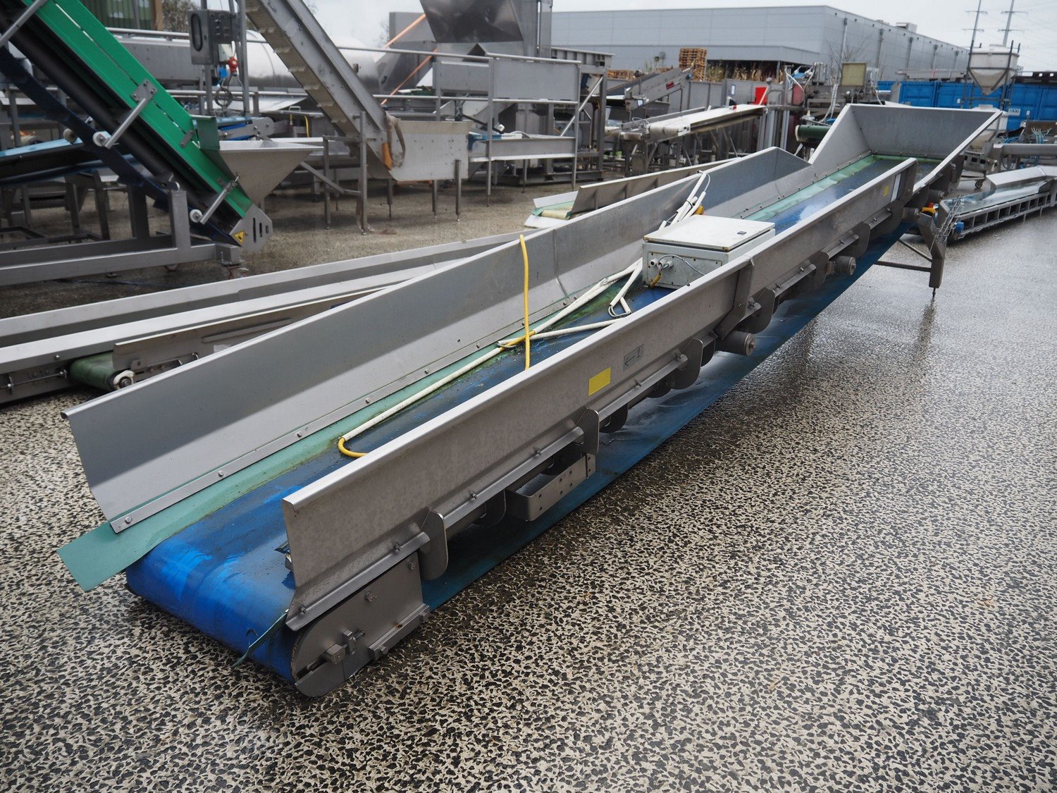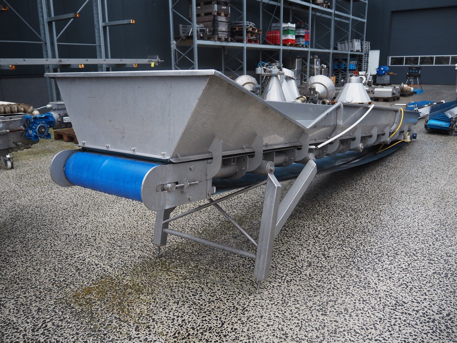 Transport belt, s/s frame, plastic belt, belt width: 600 mm, total dimensions: 6050 mm x 1100 mm x 1300 mm.