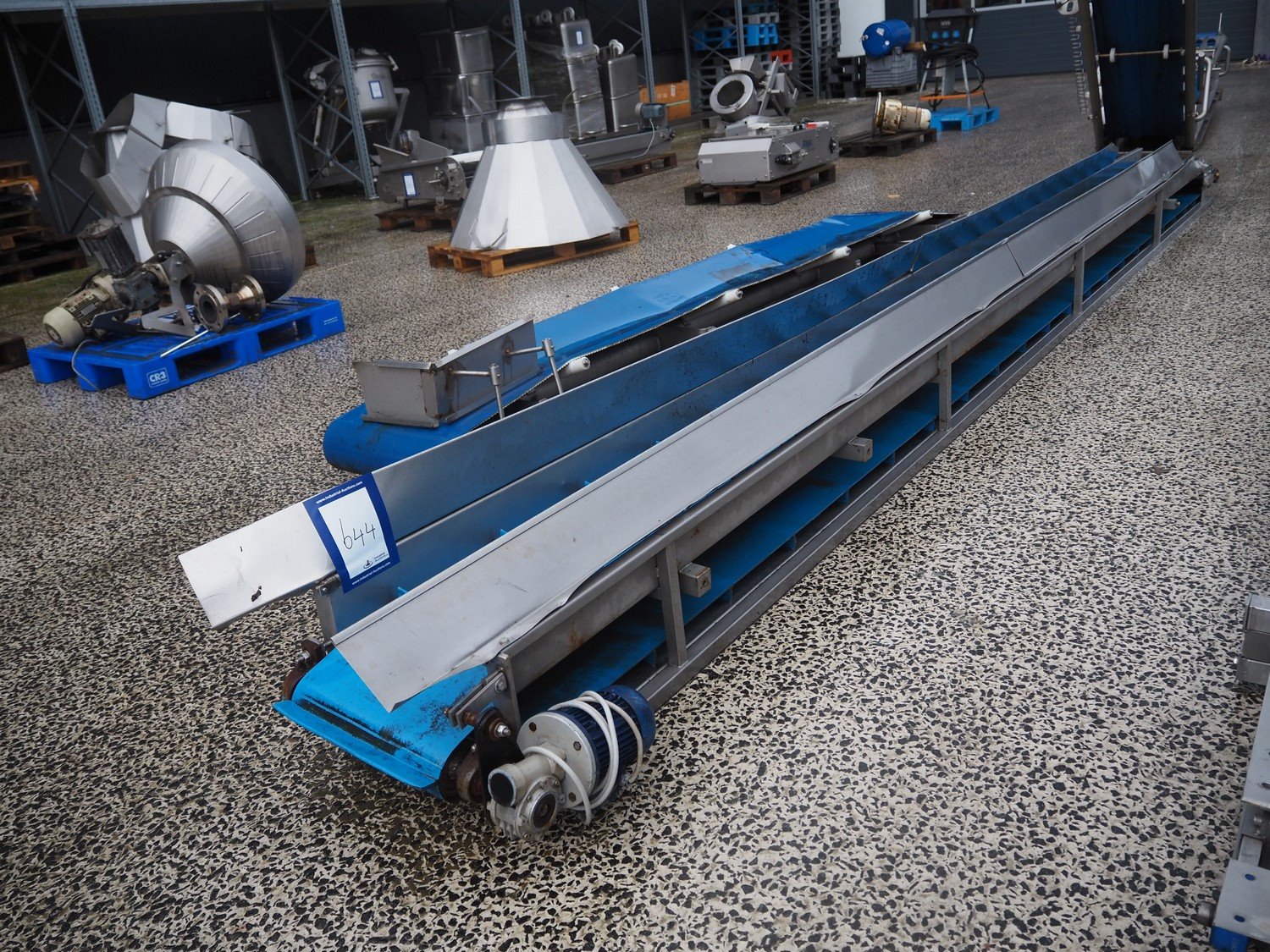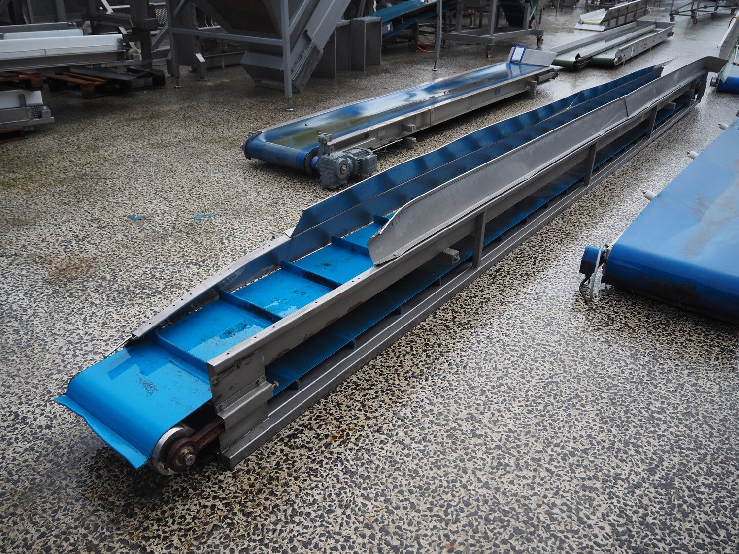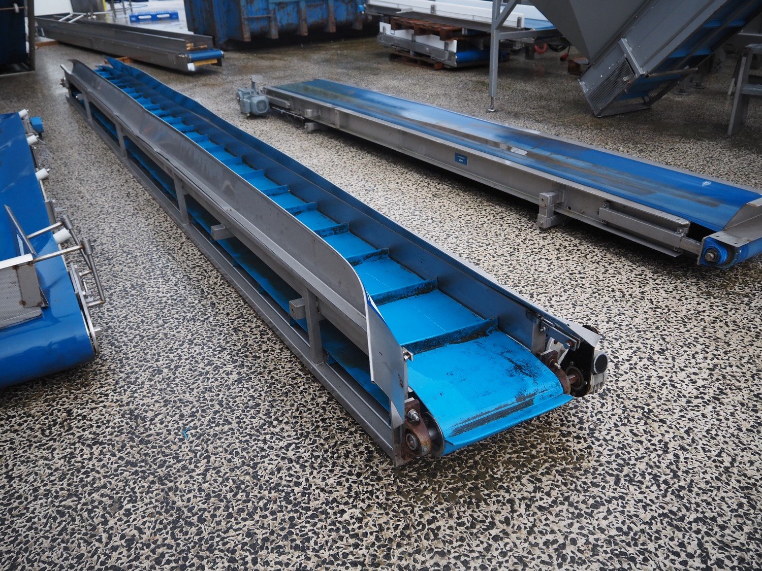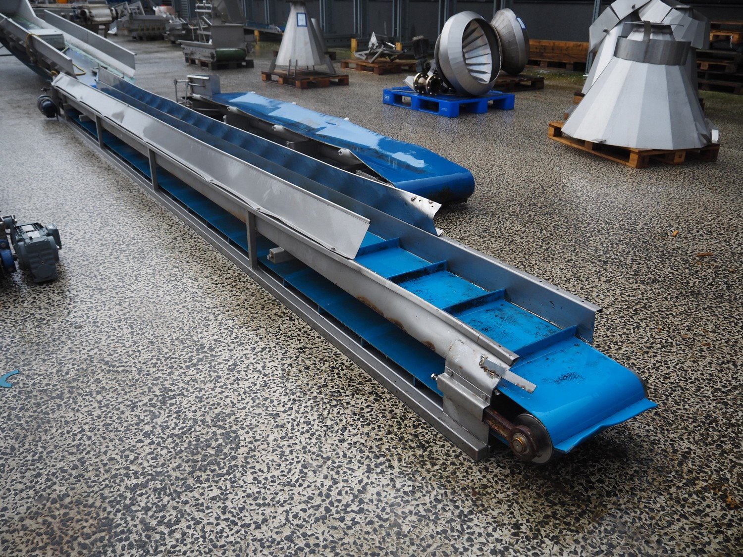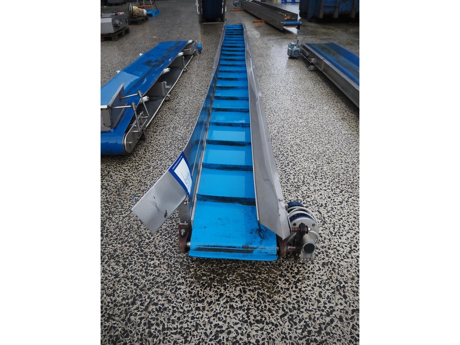 Elevating belt, s/s frame, plastic belt with dividers, belt width: 400 mm, divider height: 40 mm, distance between dividers: 320 mm, total dimensions: 7100 mm x 750 mm x 500 mm.