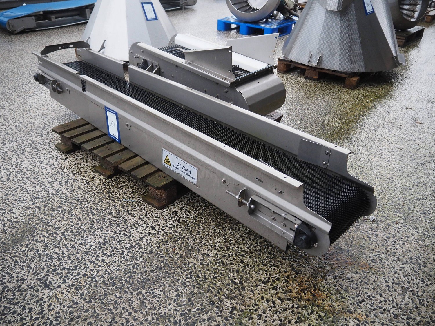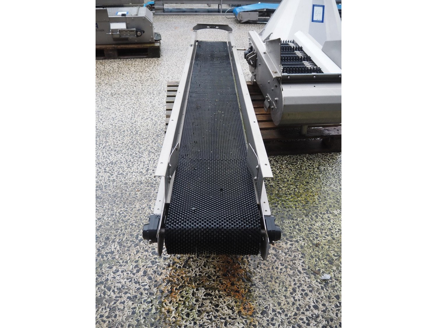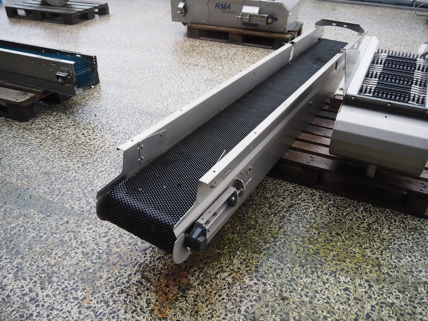 Transport belt, s/s frame, plastic chain conveyor, belt width: 300 mm, total dimensions: 2500 mm x 550 mm x 330 mm. Missing motor.