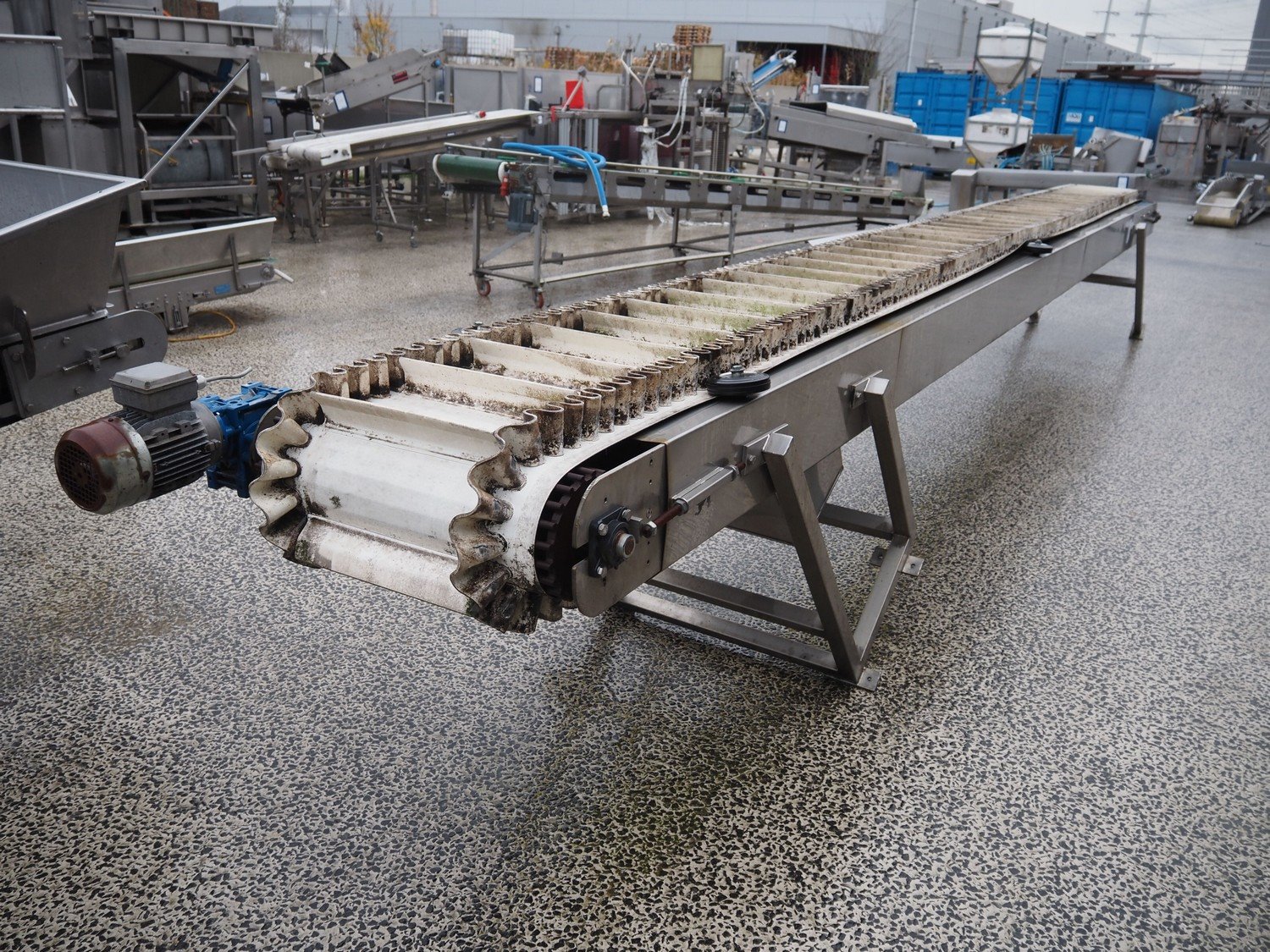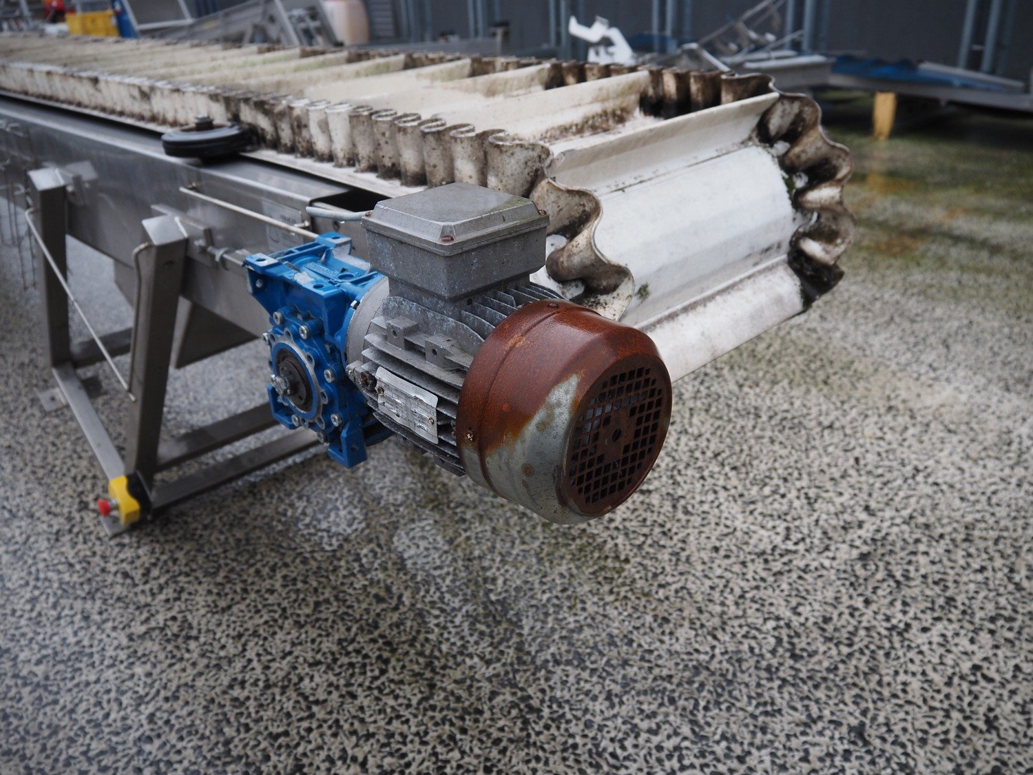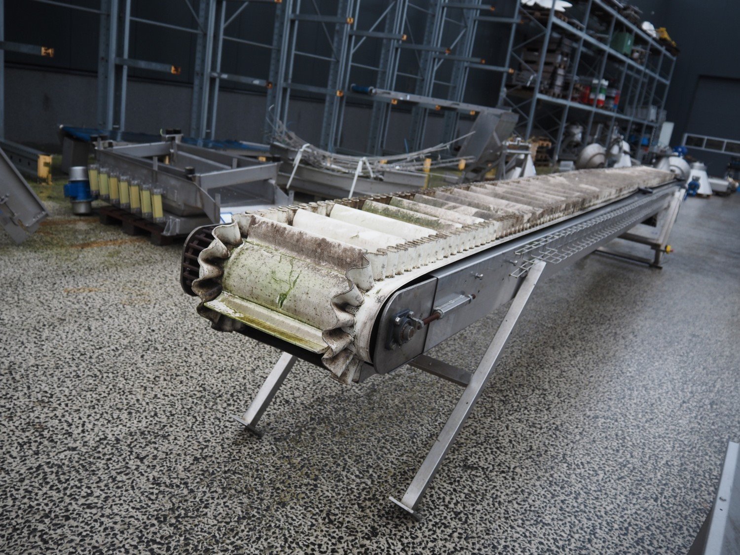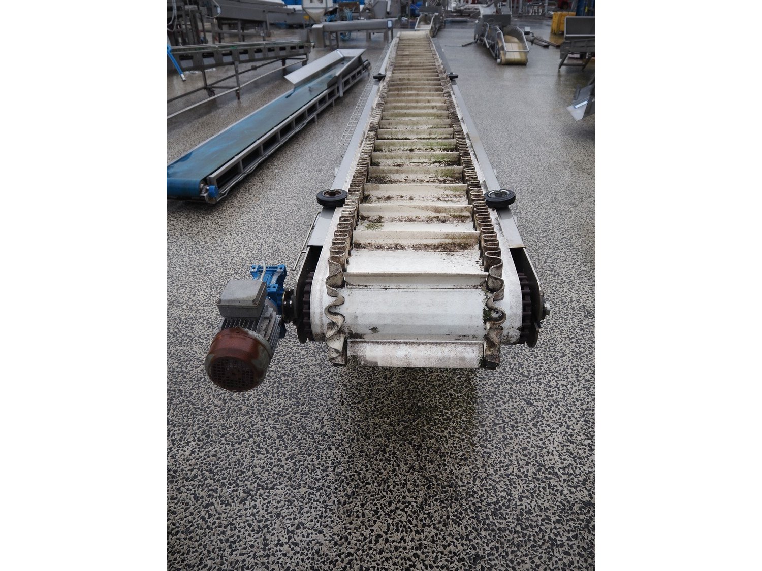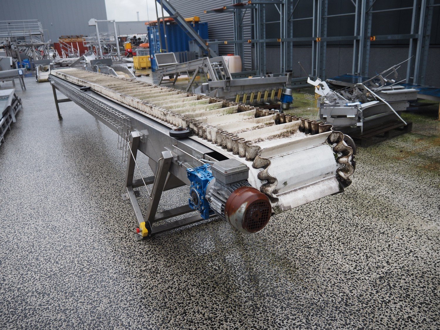 Abracad elevating belt with dividers, type: 9 2000, number: 1206, plastic belt, belt width: 600 mm, distance between dividers: 170 mm, divider height: 80 mm, total dimensions: 8200 mm x 850 mm x 1100 mm.